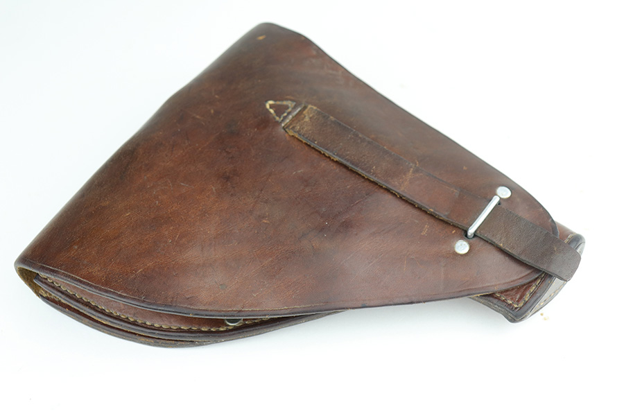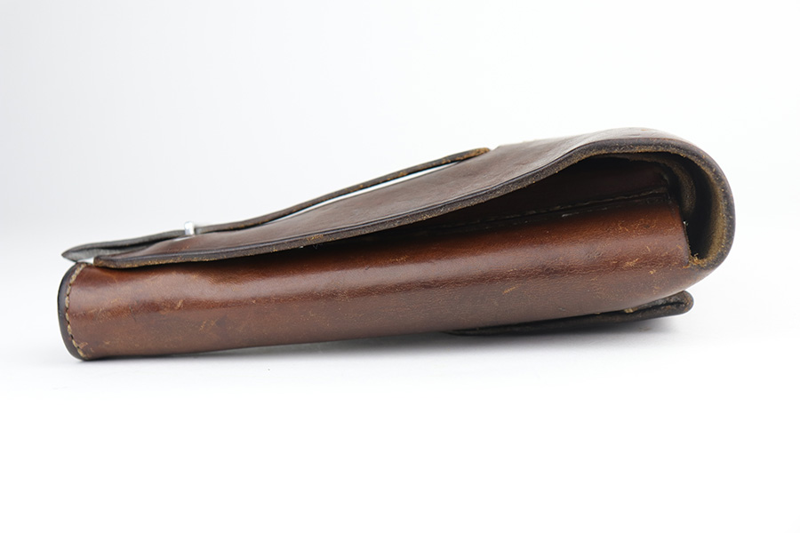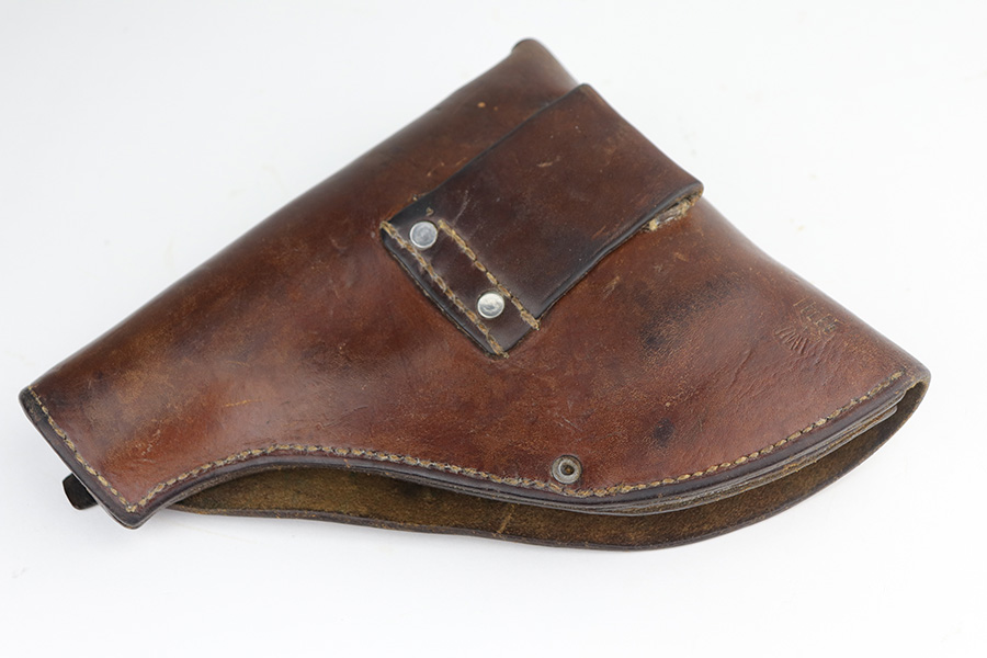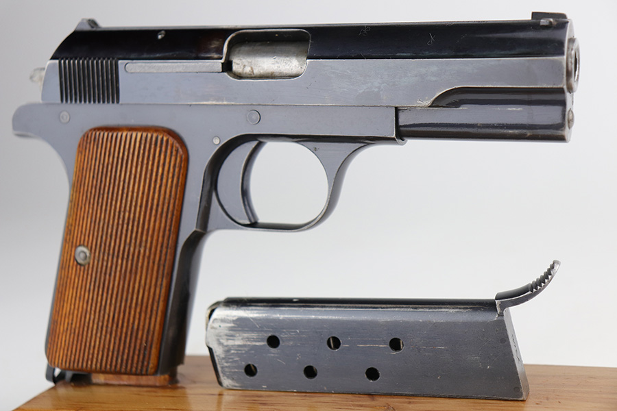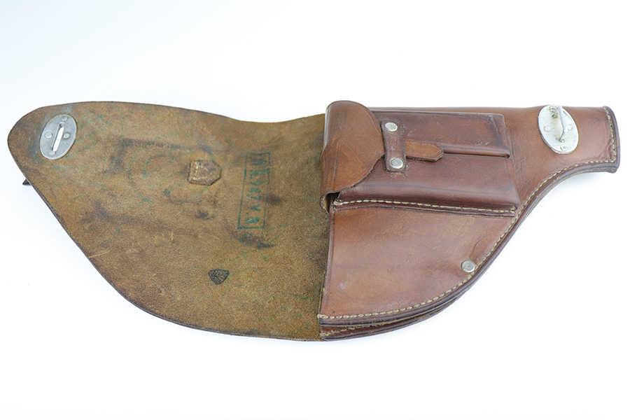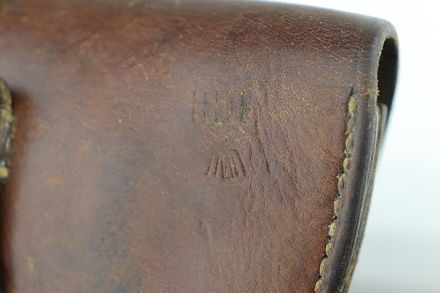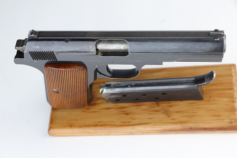 8/19/21 – This is an excellent example of a Hungarian Femaru Model 37 rig manufactured in 1940. It is all matching and has a “St. Stephen’s Crown” acceptance proof on the left side of the trigger guard. It is generally believed this a non-military mark but rather indicates commercial sale or police issue. It comes with an excellent period-correct leather holster and two proper magazines. Excellent wood grips. It has retained about 95% of its finish. There is minor wear on the high edges of the slide, around the muzzle, and some light scratchy wear on the straps. While there is very little actual finish loss, there are areas of discoloration along the slide. Excellent bore – shiny with strong rifling.