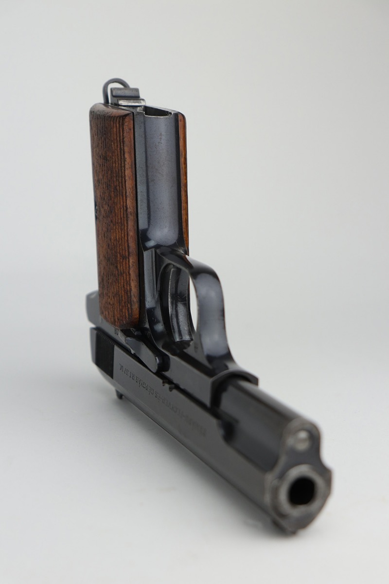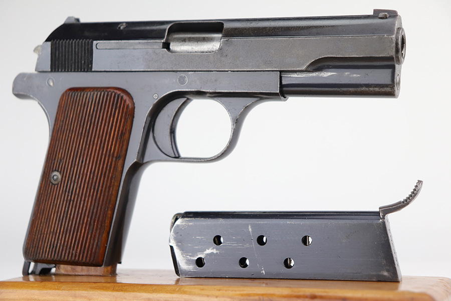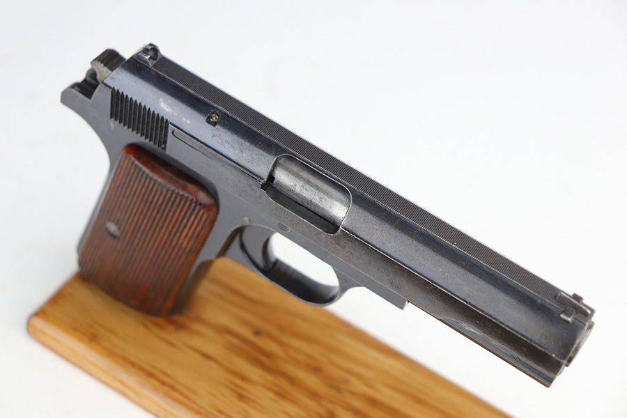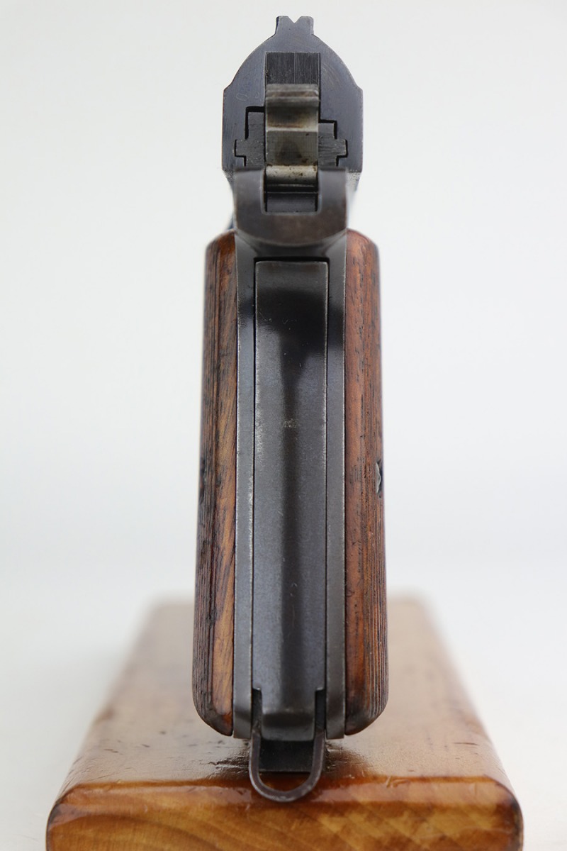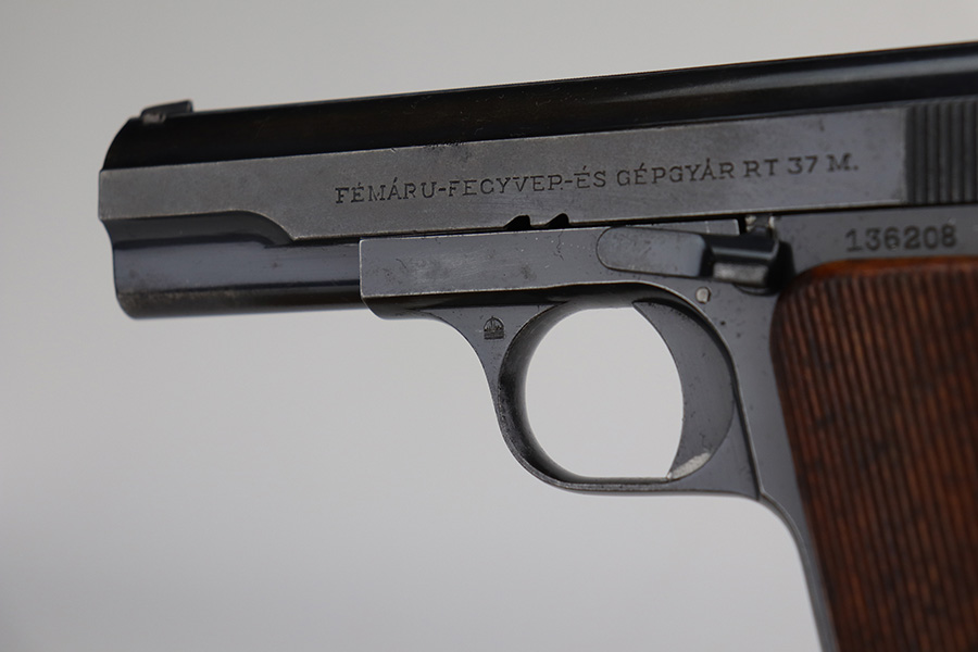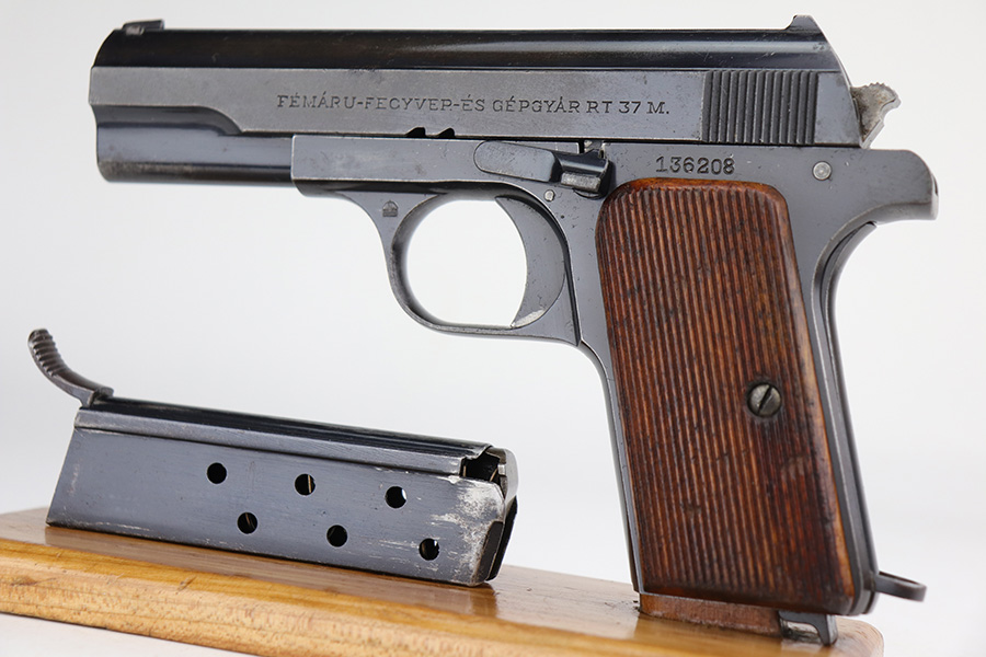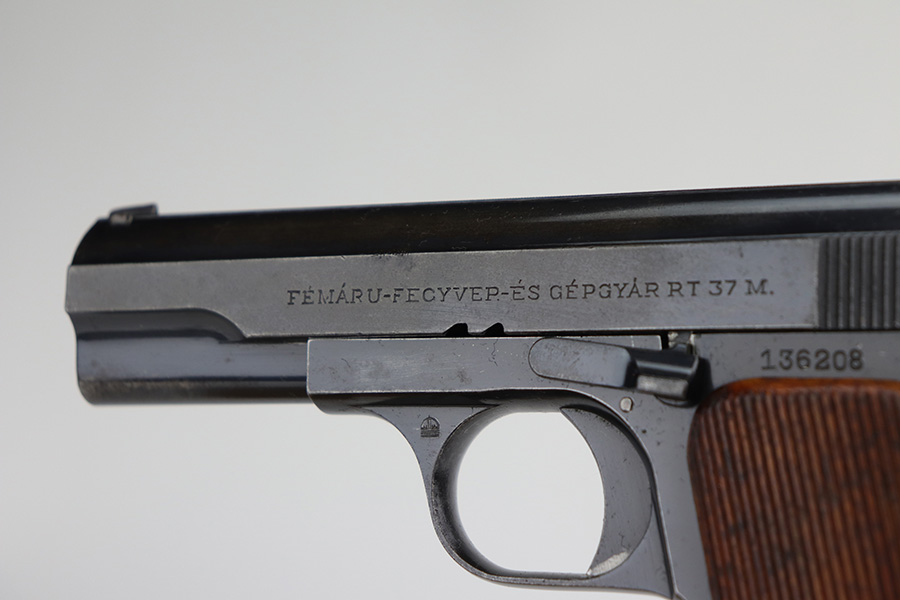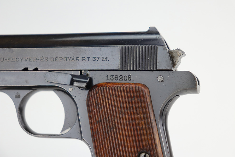 9/27/21 – This is a nice example of a Femaru Model 37 manufactured in 1941. It is all matching and has a St Stephen’s Crown acceptance proof on the left side of the trigger guard. It is believed this a non-military marking, indicating it was either commercial or police. It has retained about 93-94% of its original finish. There is wear around the high edges and around the muzzle. While there isn’t much actual finish loss, there is pin-pricking and spotty oxidation on the whole gun, most noticeable on the slide. Comes with excellent wood grips and a mismatched period-correct magazine. The rifling in the bore is a bit worn with minor pin-pricking throughout.