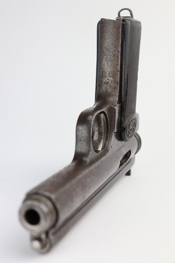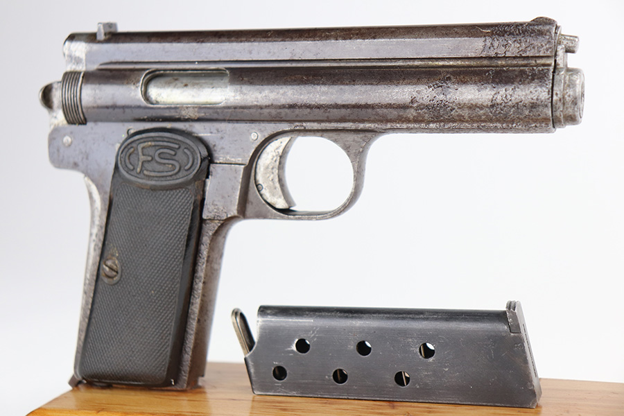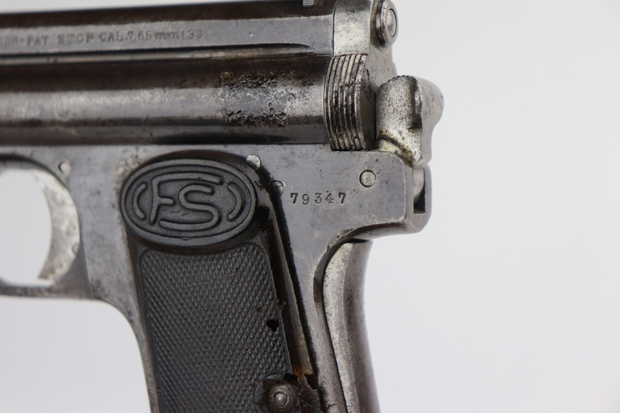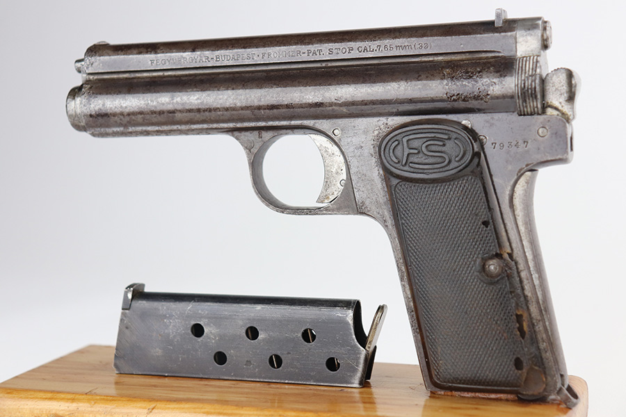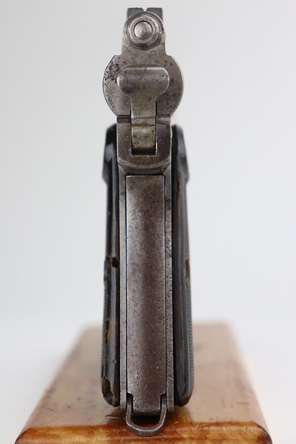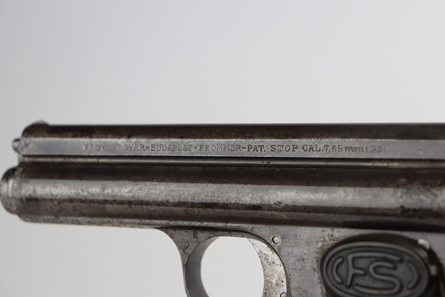 7/2/21 – This is a nice example of a Hungarian Frommer Stop Model 1912, chambered in .32 caliber. It is all matching and correct. It has lost almost all of its original finish. There is spotty oxidation throughout and areas of heavy pitting here and there, most noticeable around the muzzle, left side of the slide, and on the front strap. It comes with period-correct grips and a proper magazine. The grips have small bore holes in them, and the right grip panel is a little loose. The bore has decent rifling with minor pitting throughout.