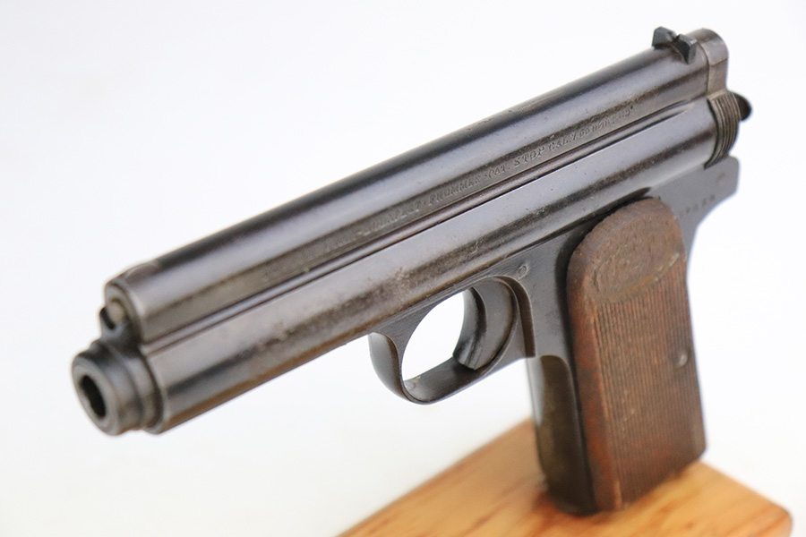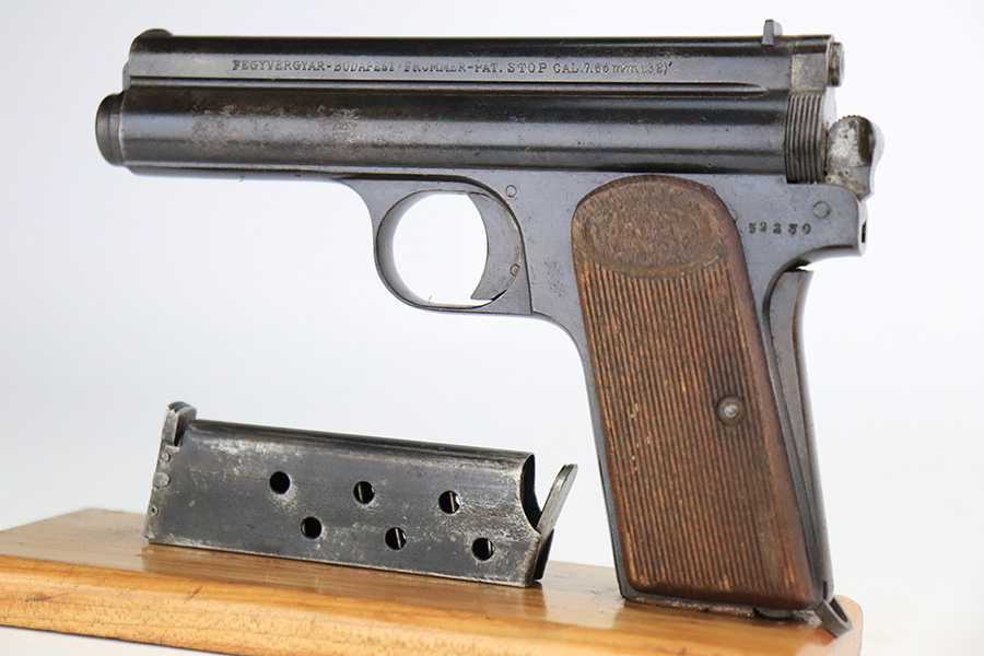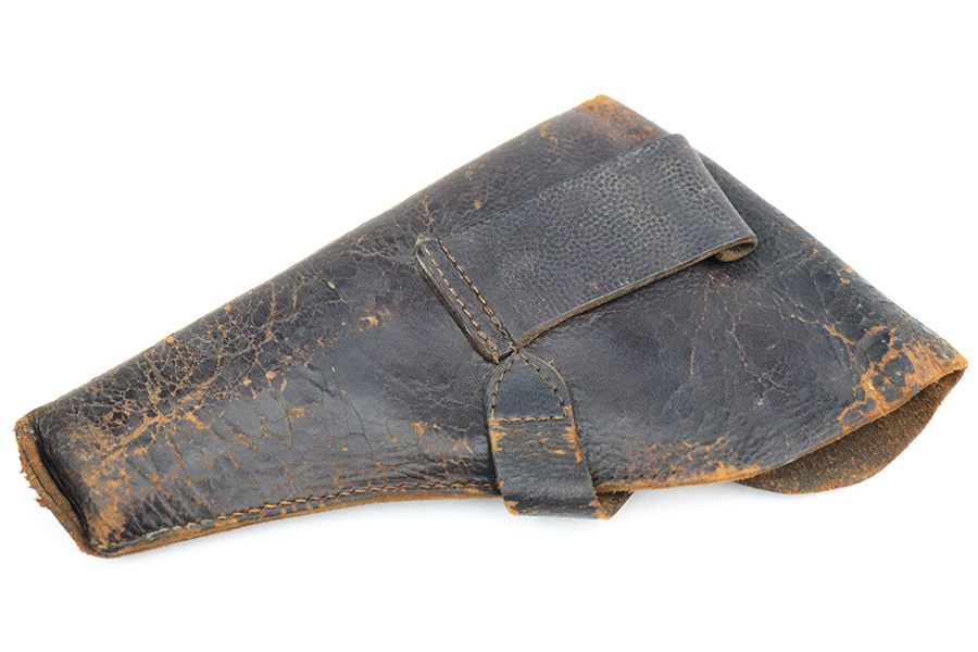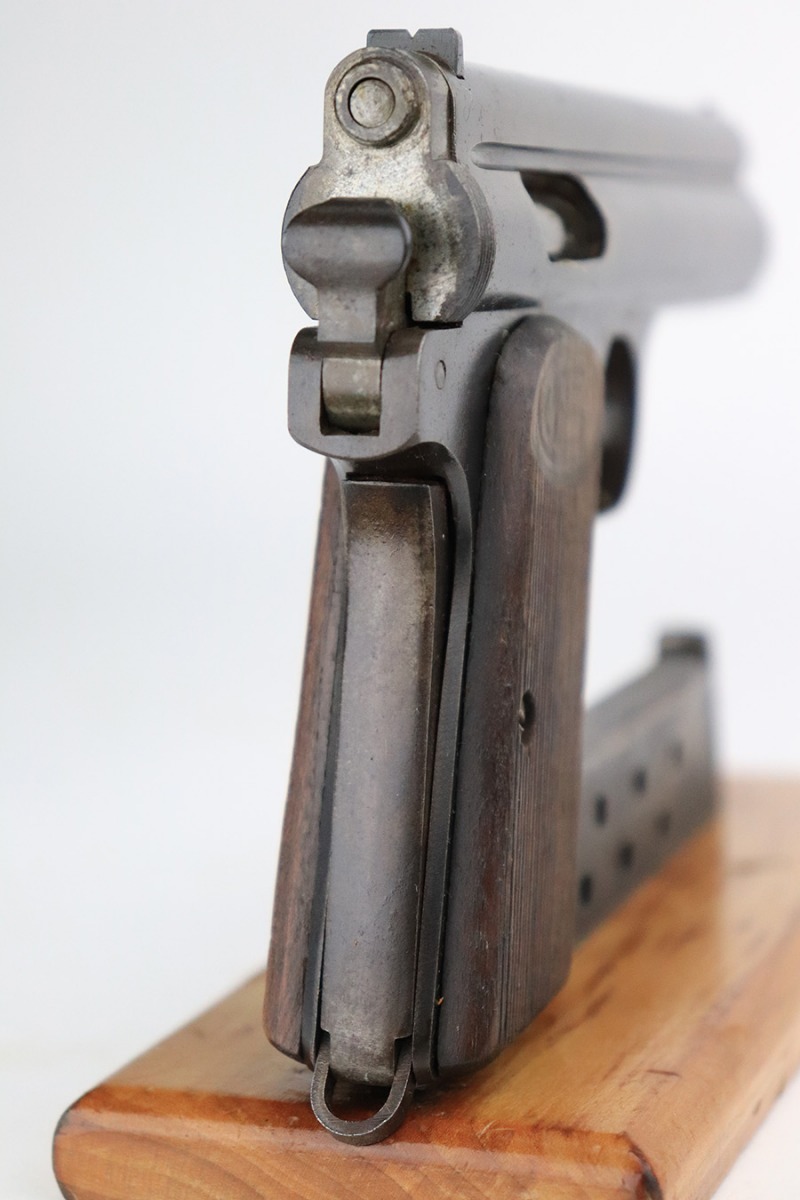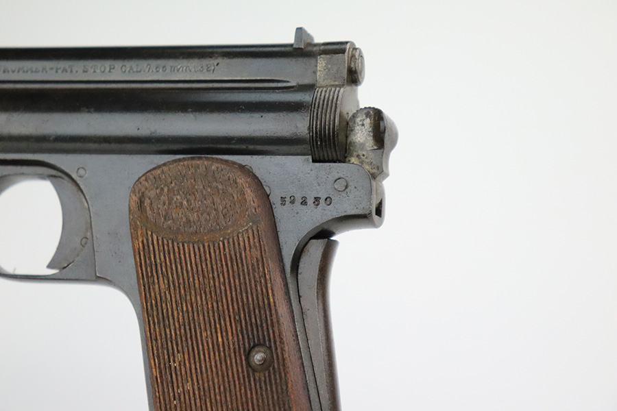 7/28/22 – This is a nice example of a Hungarian Frommer Stop Model 1912, chambered in .32 caliber. It is all matching and correct. It comes with a worn leather holster (surface cracking in the leather throughout). The gun rates about 80%. Minor wear along both sides of the slide and on the grip straps. While there isn’t a ton of actual finish loss, there is spotty oxidation throughout and some areas of pitting – most noticeable on the left side of the gun. There is an electro-penciled number on the front strap – not sure of the meaning. Comes with fairly worn wood grips and one proper magazine. The bore has decent rifling with minor pitting in the grooves.