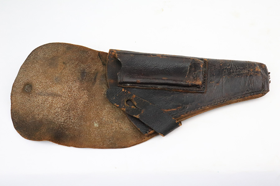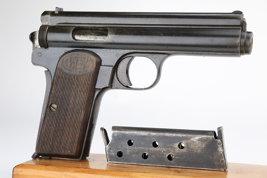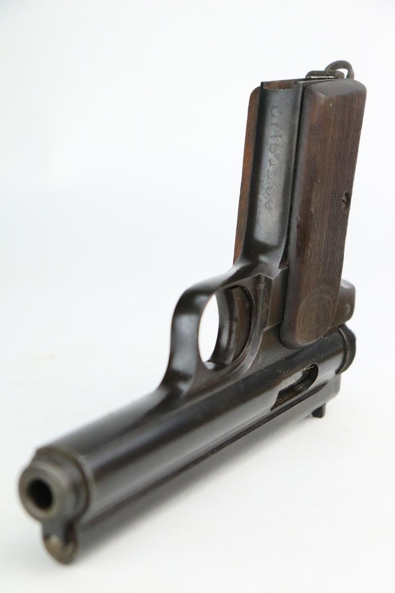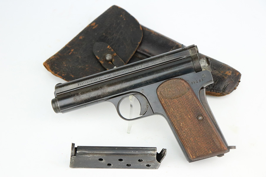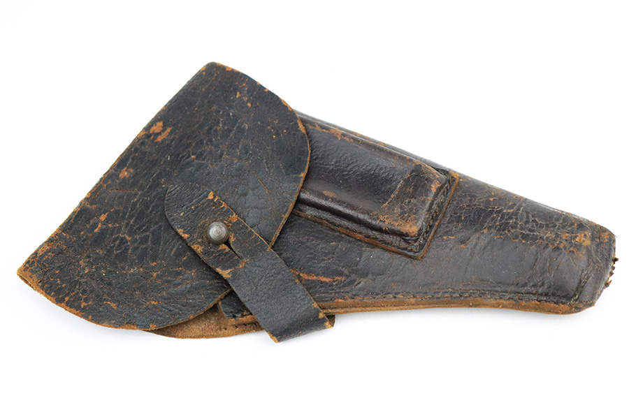 7/28/22 – This is a nice example of a Hungarian Frommer Stop Model 1912, chambered in .32 caliber. It is all matching and correct. It comes with a worn leather holster (surface cracking in the leather throughout). The gun rates about 80%. Minor wear along both sides of the slide and on the grip straps. While there isn’t a ton of actual finish loss, there is spotty oxidation throughout and some areas of pitting – most noticeable on the left side of the gun. There is an electro-penciled number on the front strap – not sure of the meaning. Comes with fairly worn wood grips and one proper magazine. The bore has decent rifling with minor pitting in the grooves.