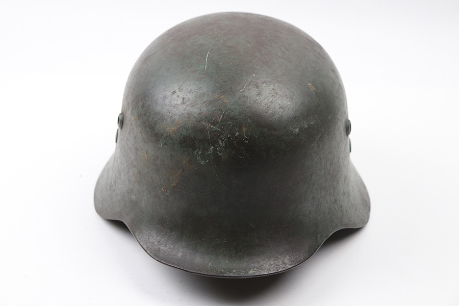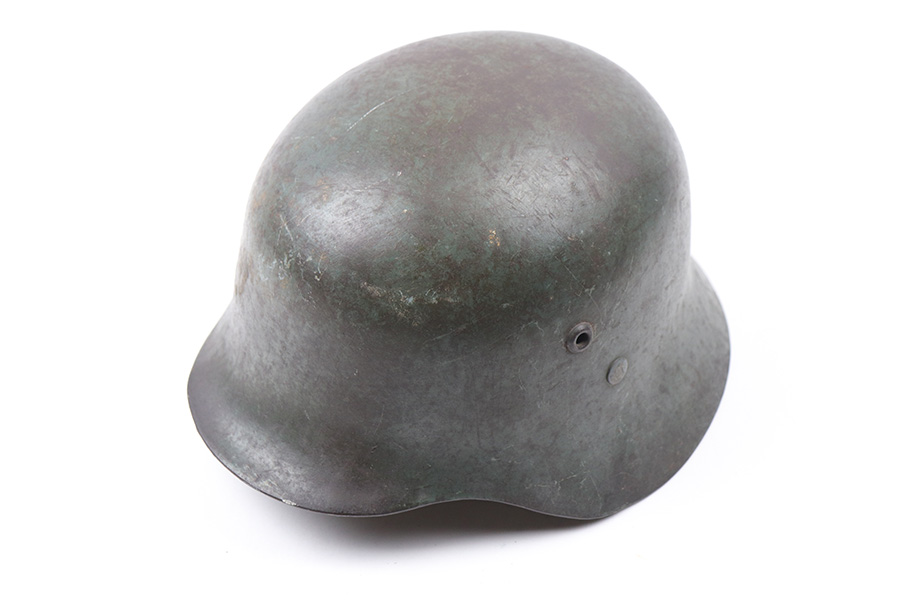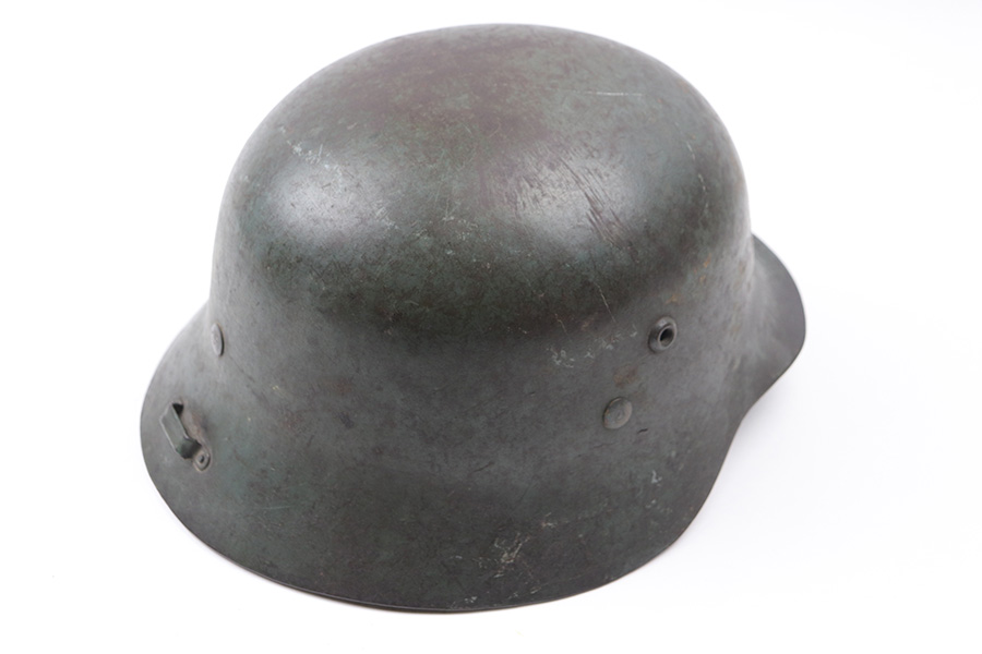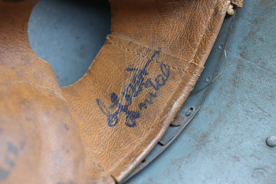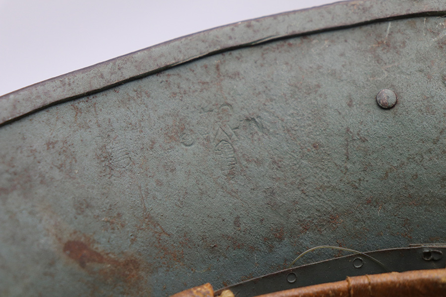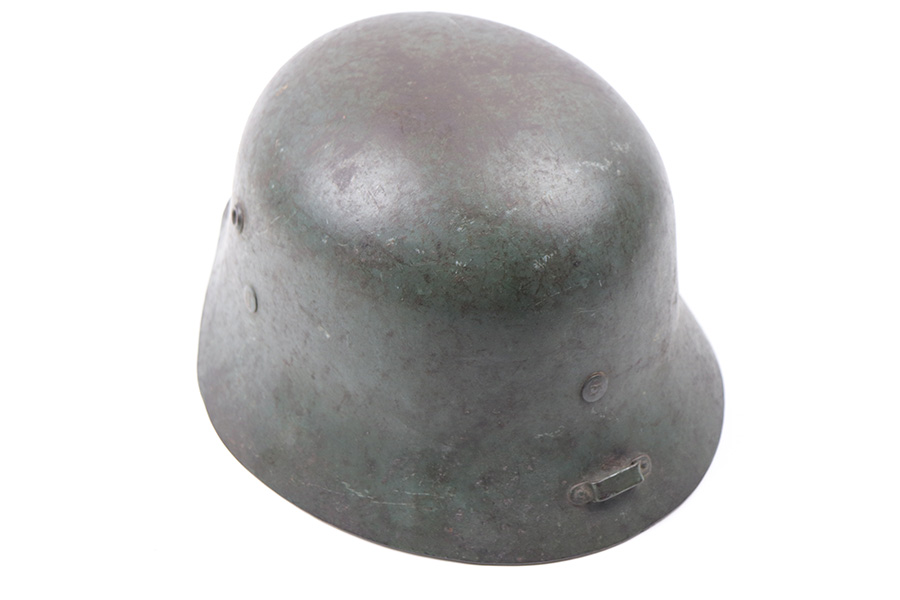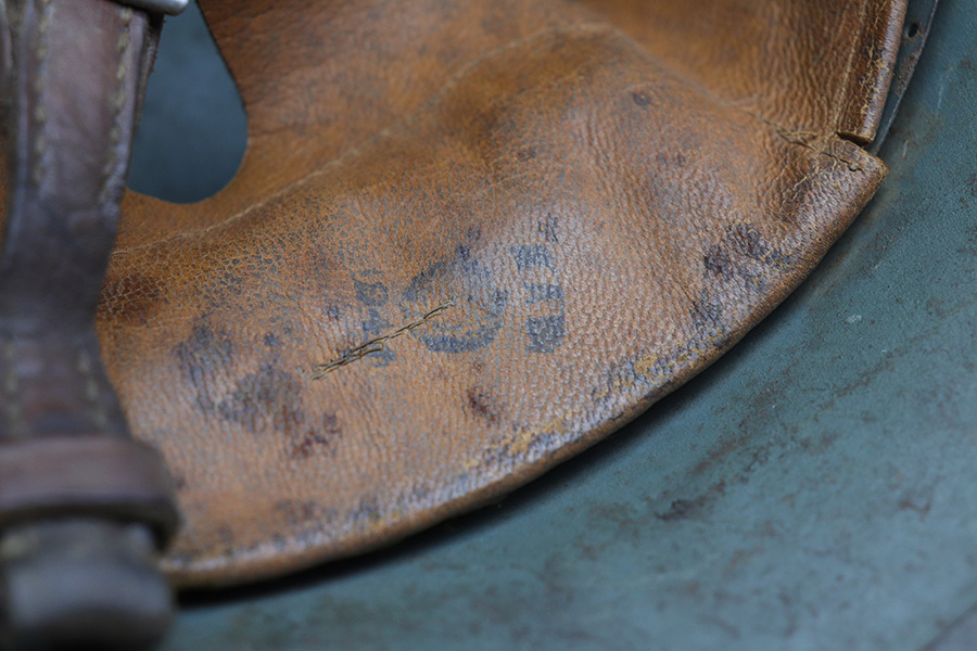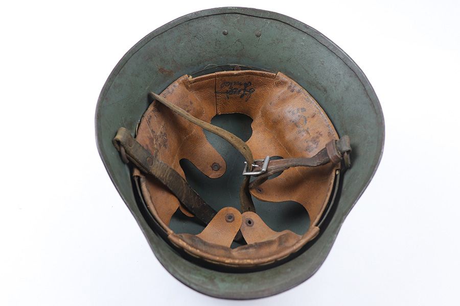 11/1/21 – This is a WW2 era Hungarian M35 Helmet. The helmet has no exterior emblems or markings. The exterior has patina and mild paint loss throughout but no dents or major flaws. The interior shell has a maker stamp that appears to be “MAV AG”, as shown in photos. The leather liner is original and has some writing as well as an ink stamp and date that appears to be 1941 or 1944. See photos.