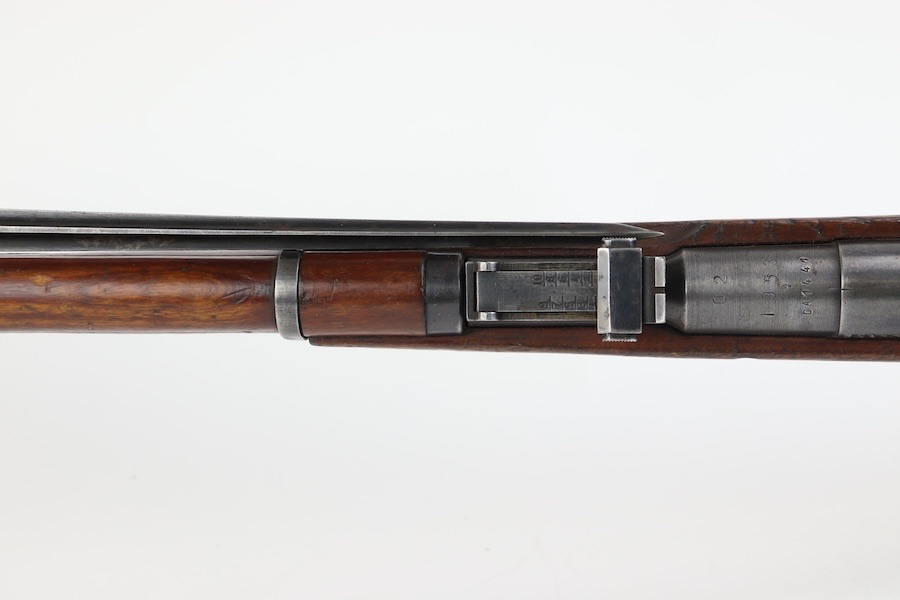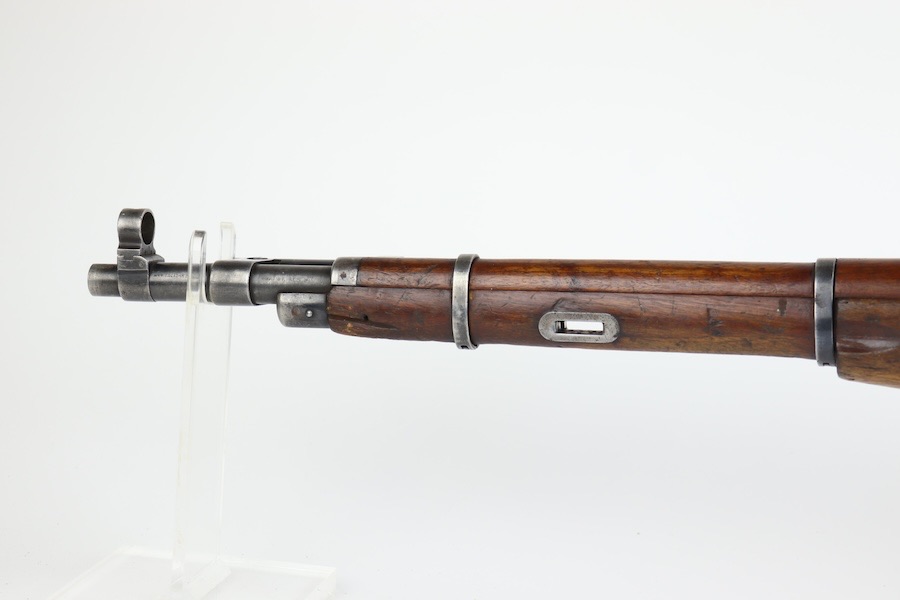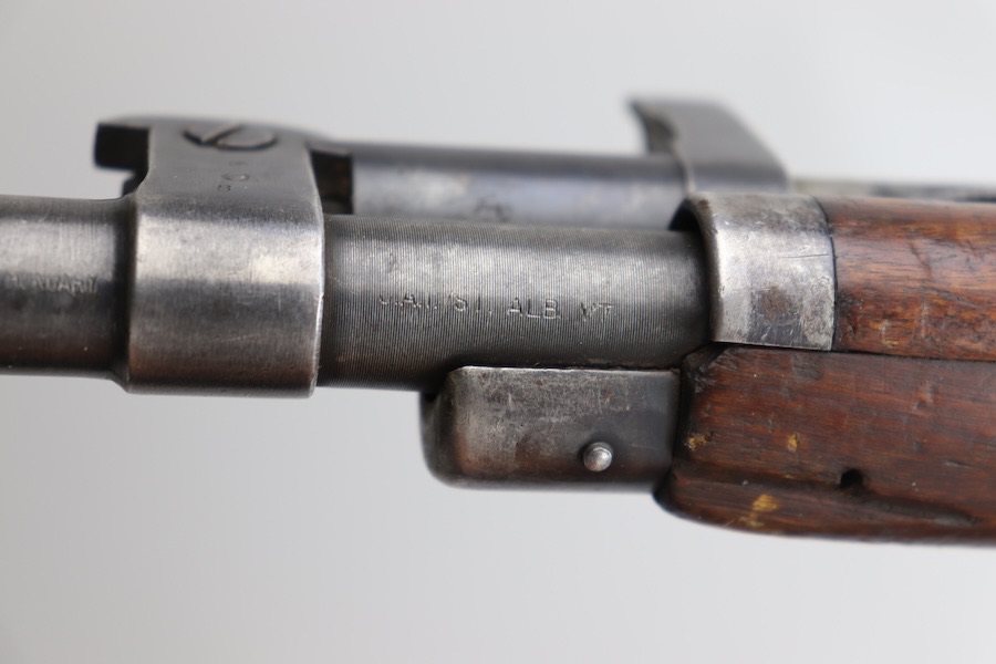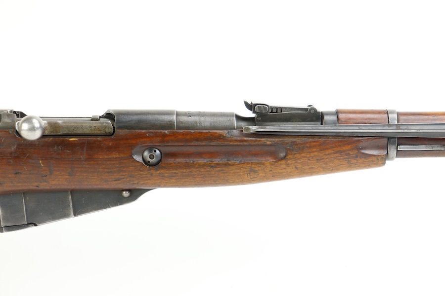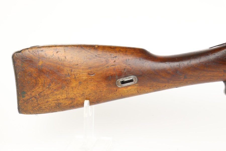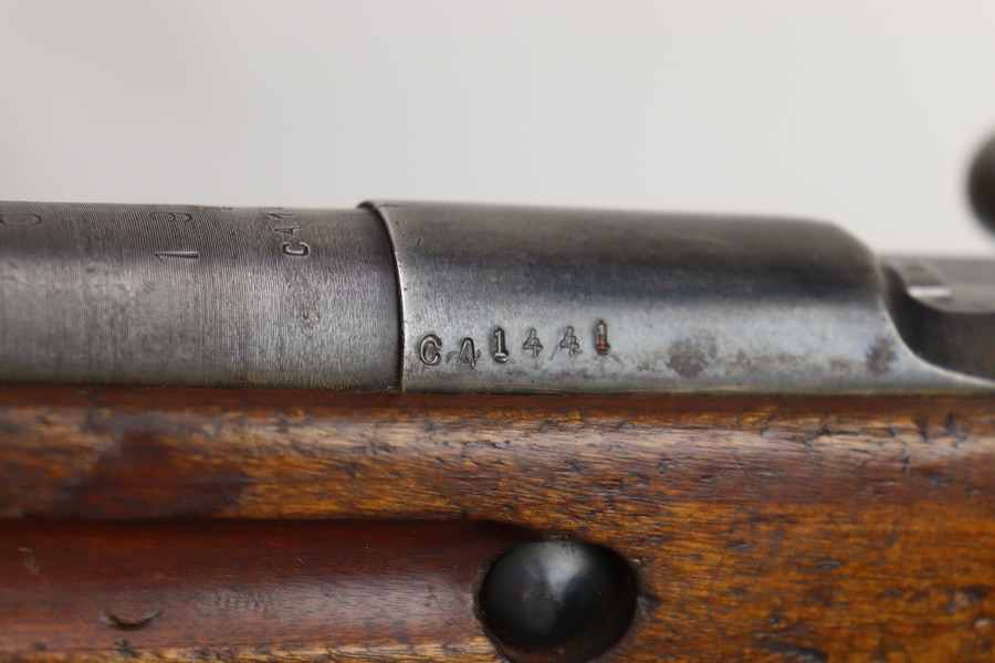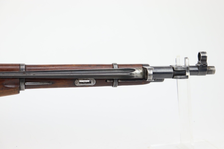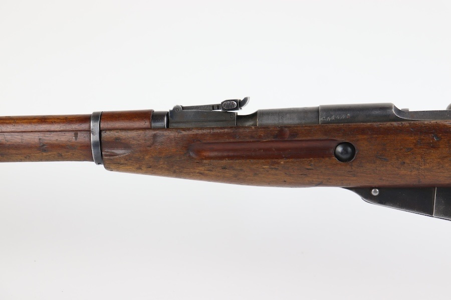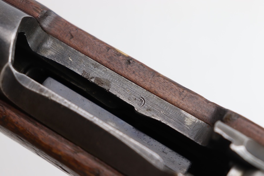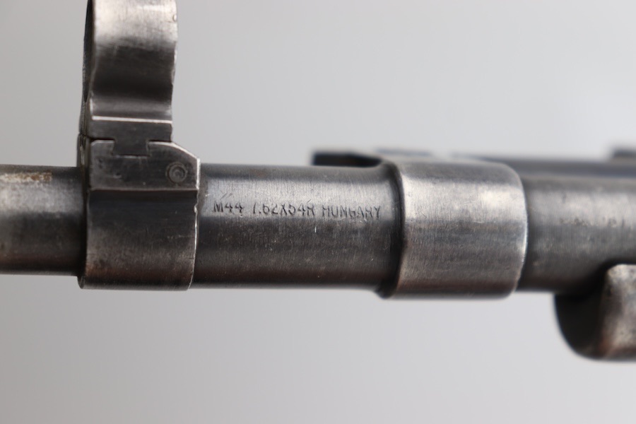 2/2/24 – This is a great and original condition Hungarian M44 Mosin Nagant carbine. A fair amount of the bluing finish has worn off the barrel, receiver parts, and mag well. There is also edge wear on the muzzle; we rate the finish at 60%. The bore has light pitting mainly towards the muzzle end but has very strong rifling; we rate the bore 8.5/10. there is a fair bit of handling wear near the end of the stock; however, there are no cracks or splits in the forend or stock. Action is very smooth and works as it should. All parts on this rifle are mismatched, and there is an import mark on the left side of the front of the barrel.