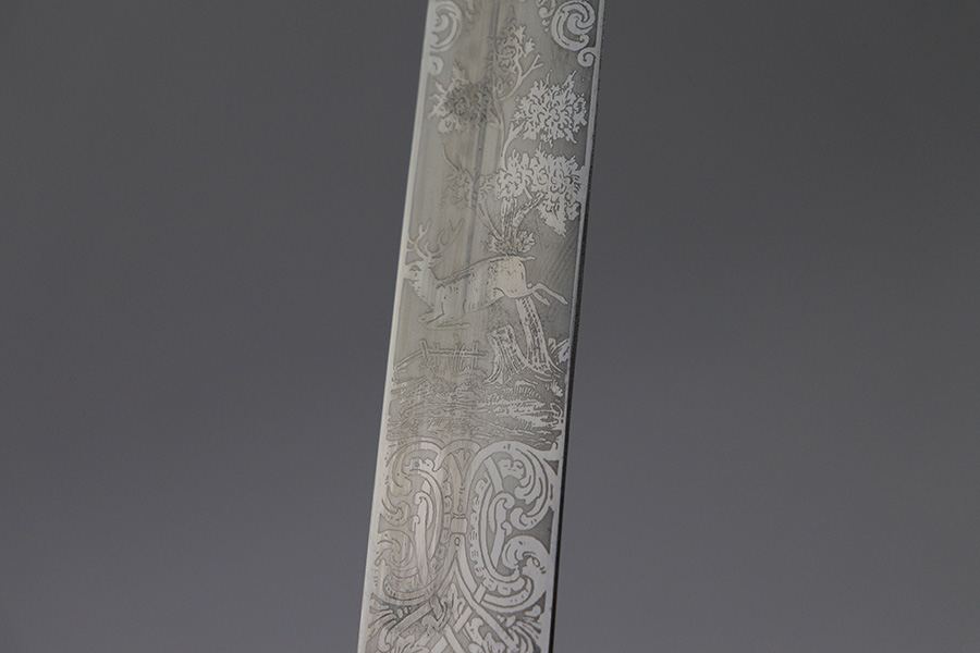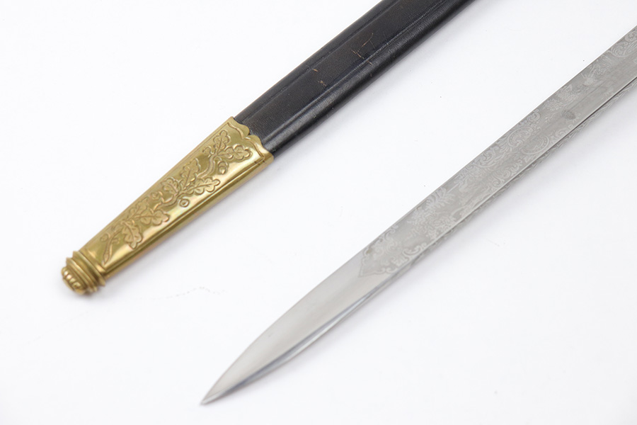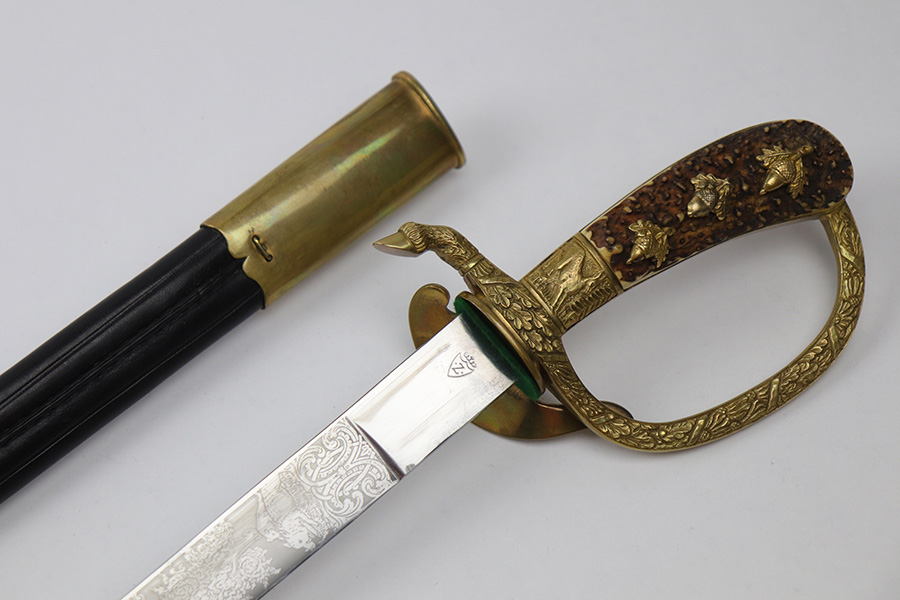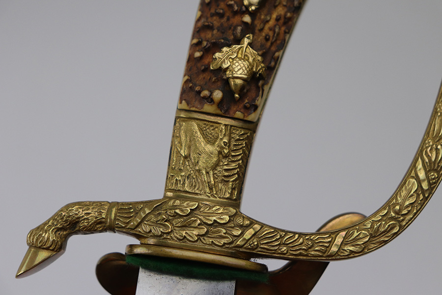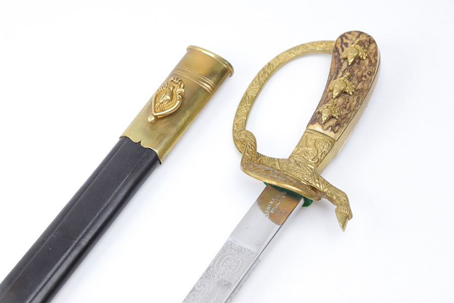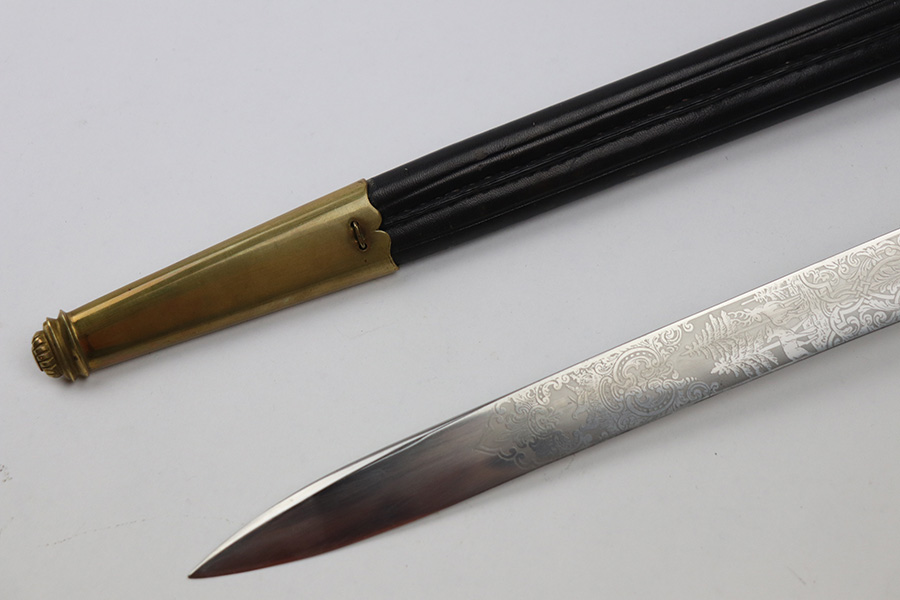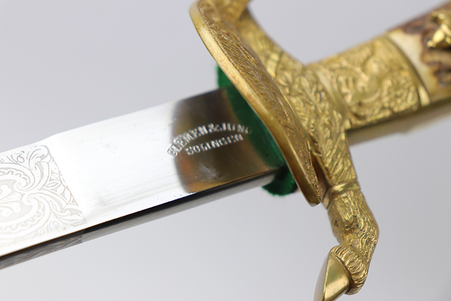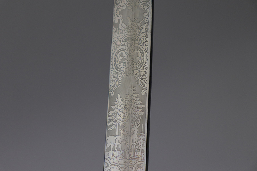10/22/21 – This is a beautiful triple etched / engraved German Hunting Association dagger. These daggers were made in the 1920s and 30s and ultimately were designed for the Nazi’s by Goring during WW2. The blade is excellent and clean with some mild scabbard wear but no major flaws. The engravings are still crisp. The handle is excellent as well, and there’s minimal patina on the hand guard / pommel. The scabbard is equally excellent with no notable flaws.