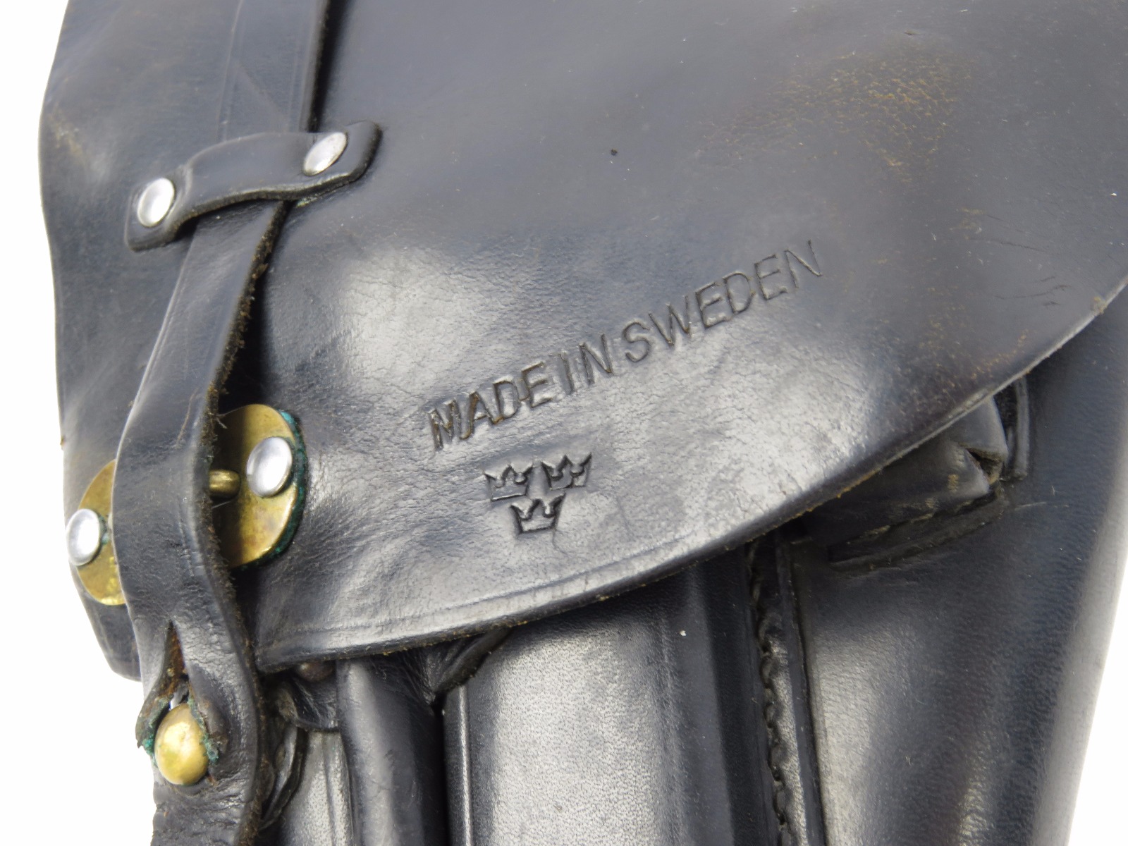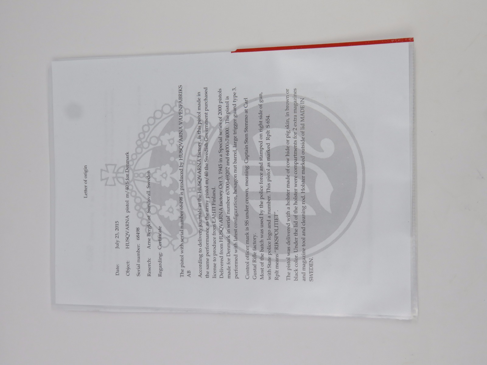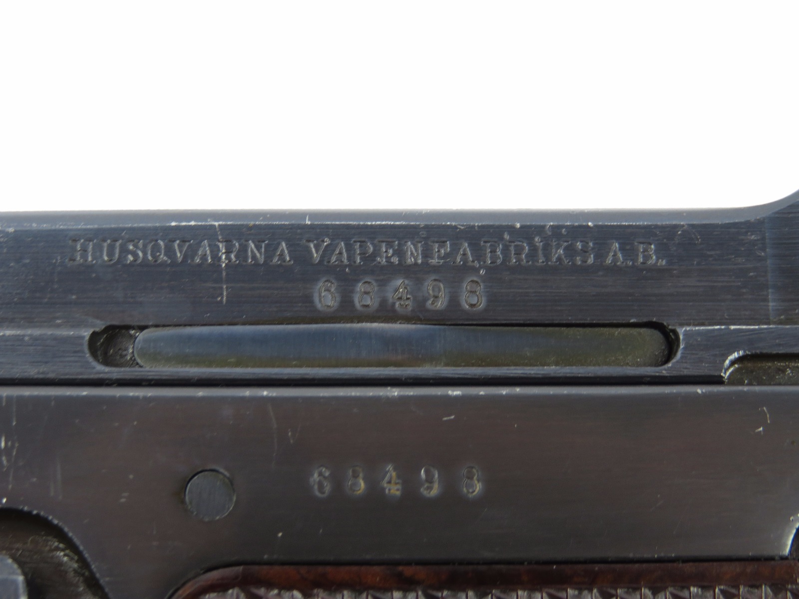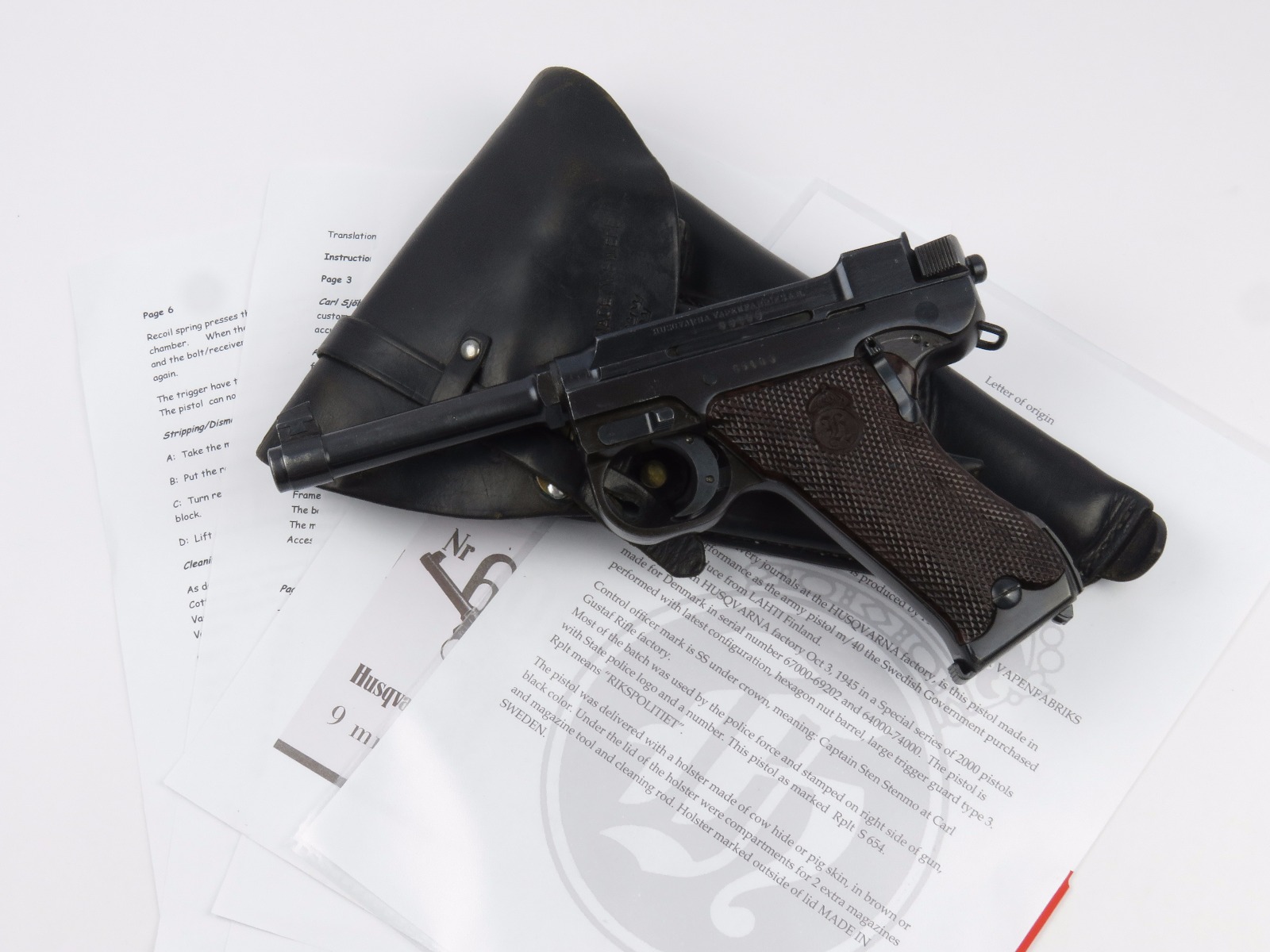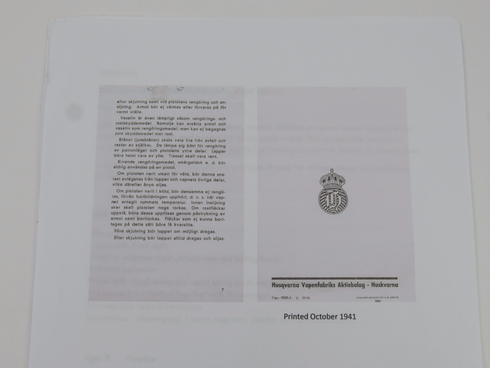 11/8/17 – This is an original late WW2 production Husqvarna made in a special series of 2000 pistols for Denmark. Most of this production batch was issued to police, and the police stamp is on the right side of the frame. This pistol is marked “Rplt S 654” which means “Rikspolitiet”. The pistol is all original condition and configuration, complete with two spare magazines, a cleaning rod, and “Made in Sweden” stamped holster. There is also a copy of the original manual that came with these pistols, and a translation (all of this is presented on 8.5×11 paper). Additionally, a letter of origin from 2015 is provided. The pistol is in about 97-98% condition with very nice dark bluing. There is some light surface scratching on the right side of the pistol, and light bore/muzzle wear. The front and back straps are excellent. The bore is mint. The pistol has an import stamp on the front of the trigger guard (shown in photos).