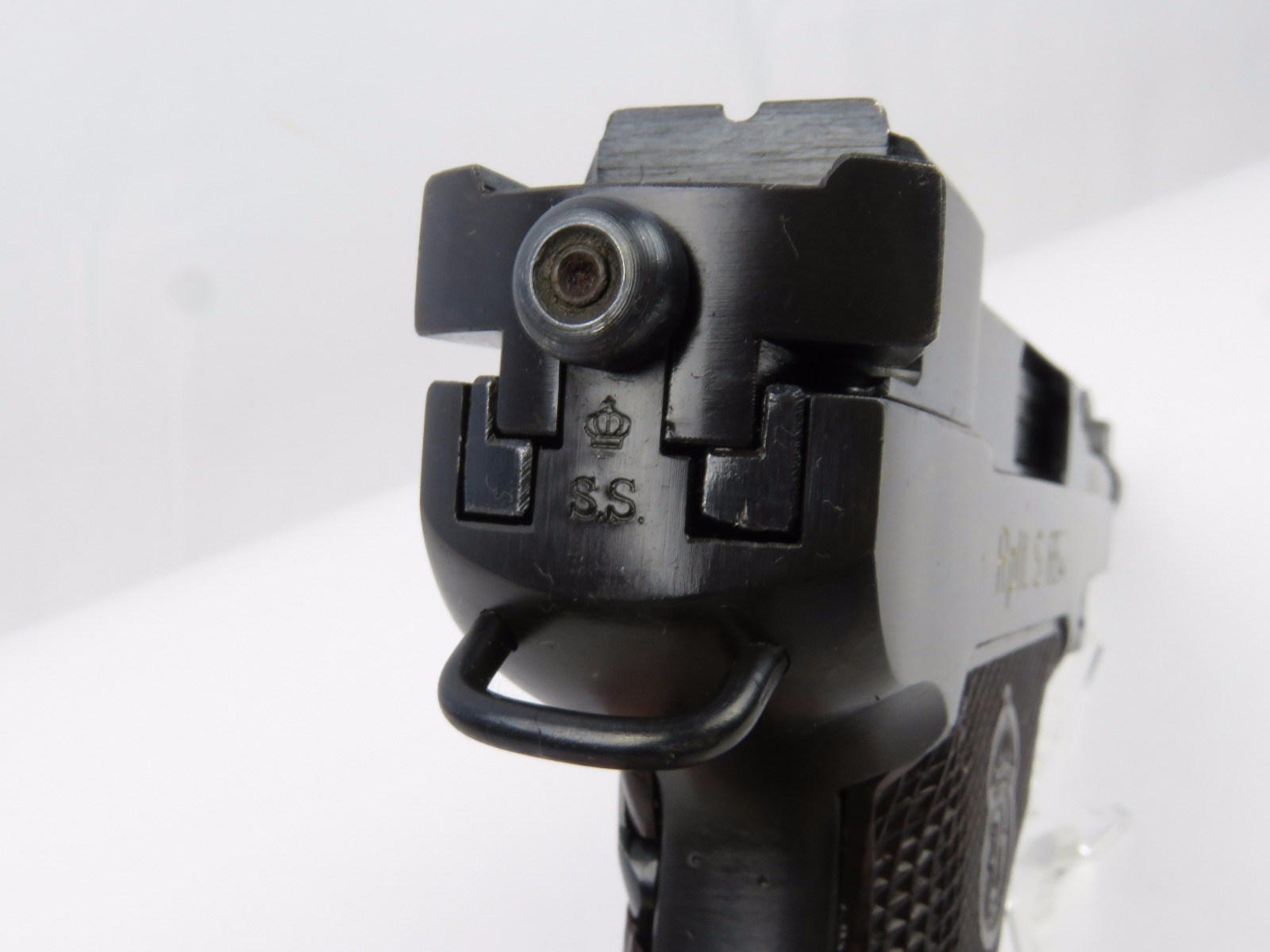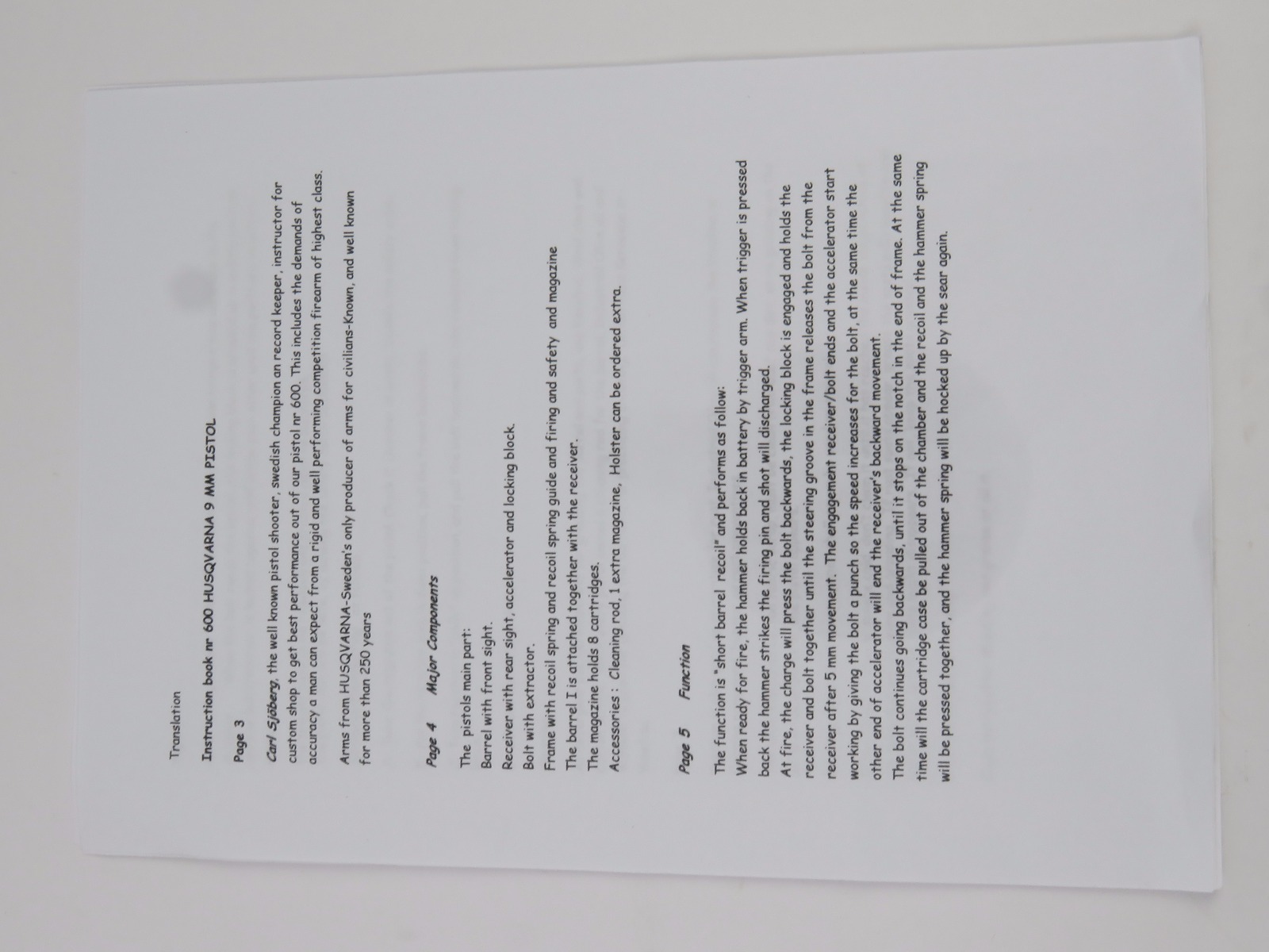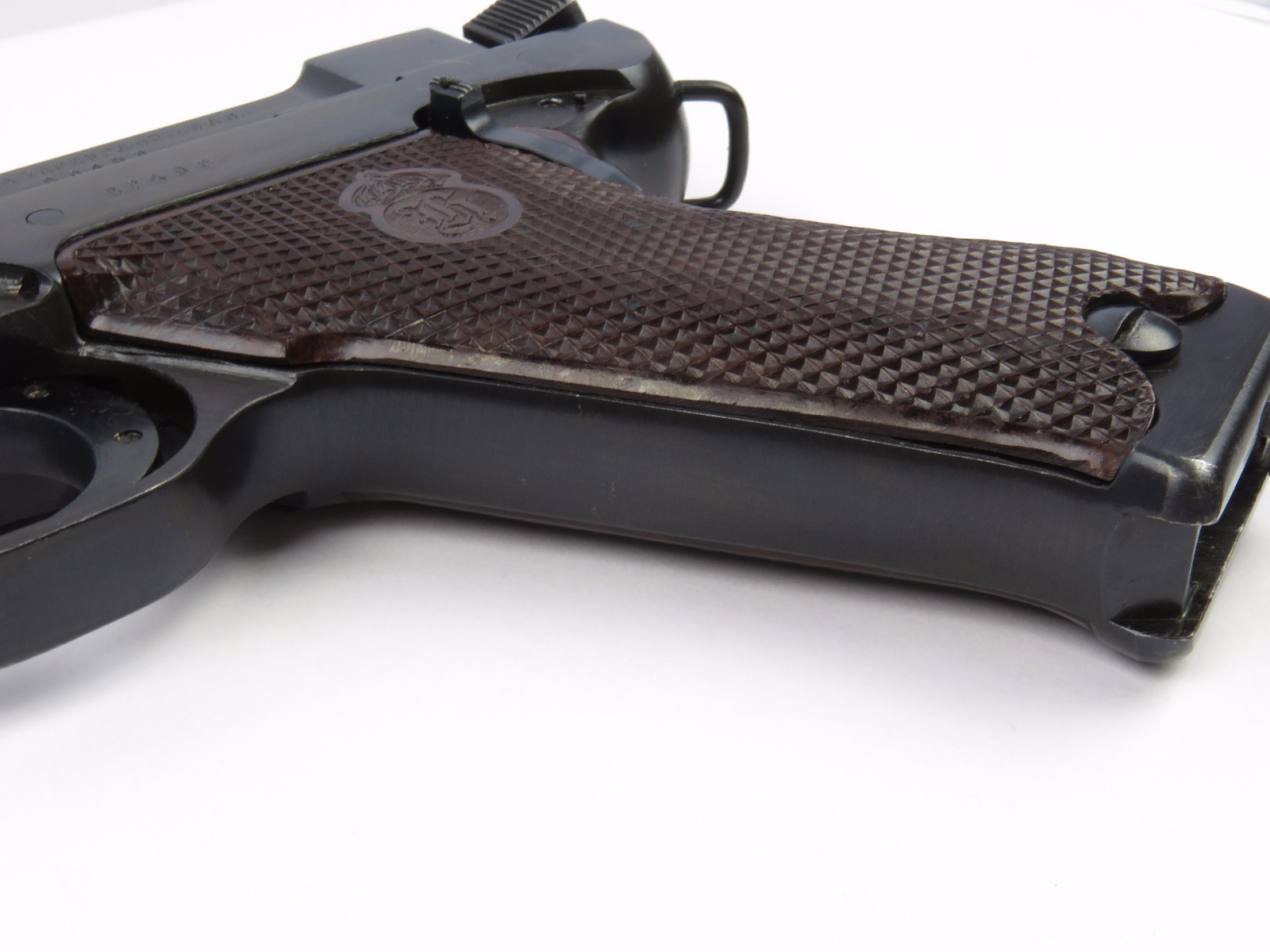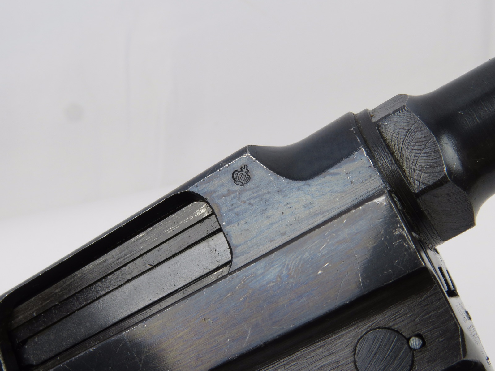 11/8/17 – This is an original late WW2 production Husqvarna made in a special series of 2000 pistols for Denmark. Most of this production batch was issued to police, and the police stamp is on the right side of the frame. This pistol is marked “Rplt S 654” which means “Rikspolitiet”. The pistol is all original condition and configuration, complete with two spare magazines, a cleaning rod, and “Made in Sweden” stamped holster. There is also a copy of the original manual that came with these pistols, and a translation (all of this is presented on 8.5×11 paper). Additionally, a letter of origin from 2015 is provided. The pistol is in about 97-98% condition with very nice dark bluing. There is some light surface scratching on the right side of the pistol, and light bore/muzzle wear. The front and back straps are excellent. The bore is mint. The pistol has an import stamp on the front of the trigger guard (shown in photos).