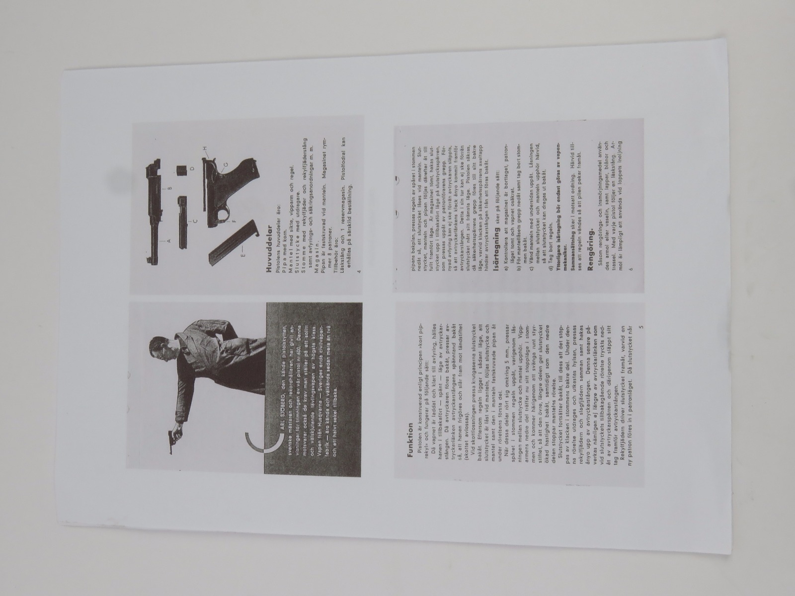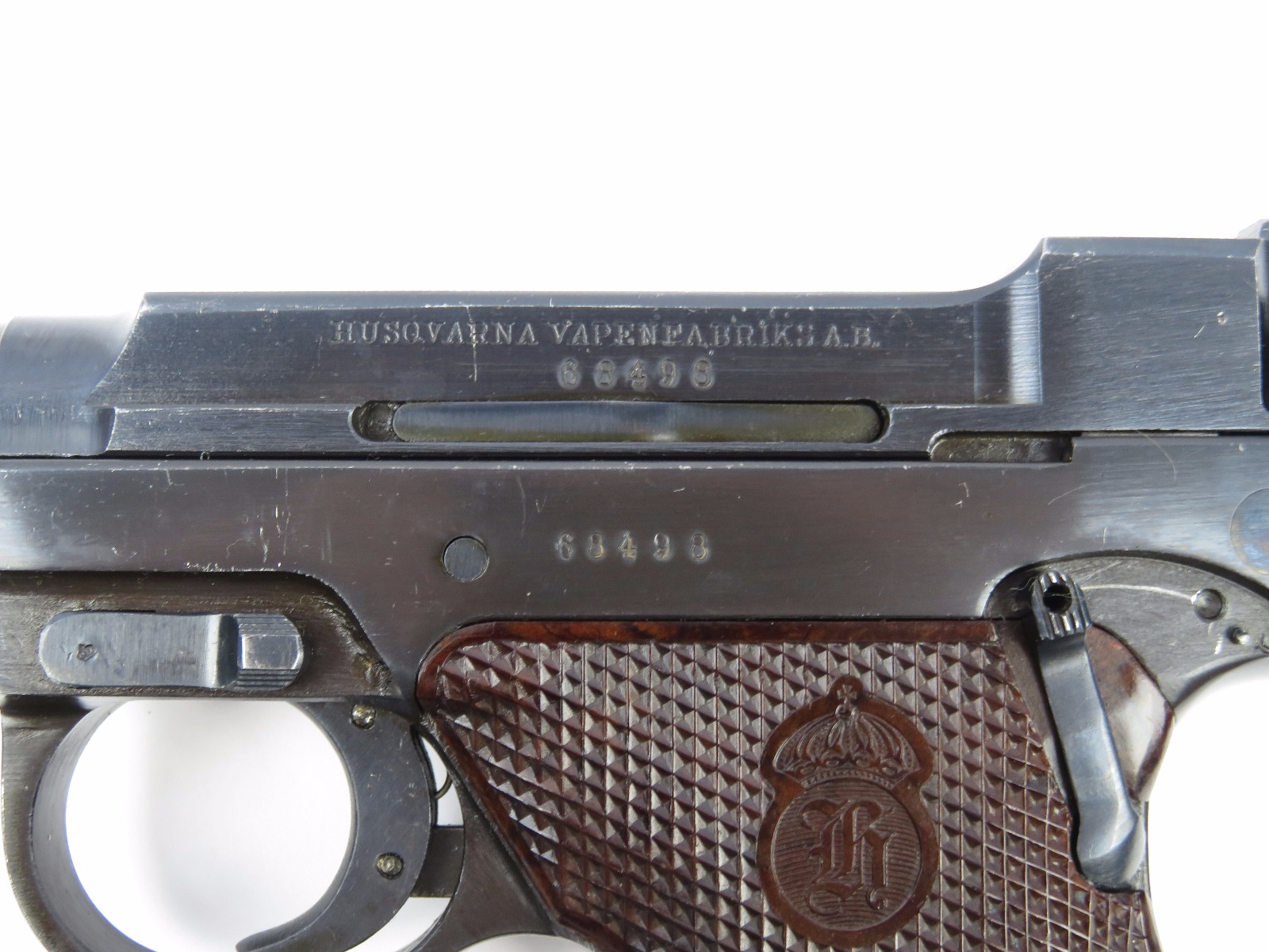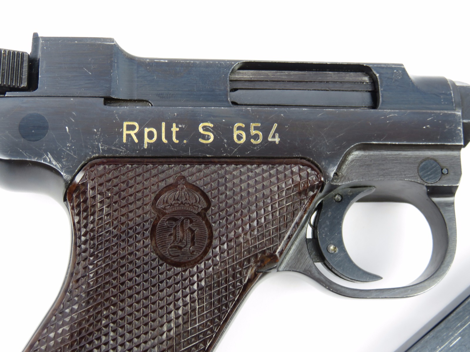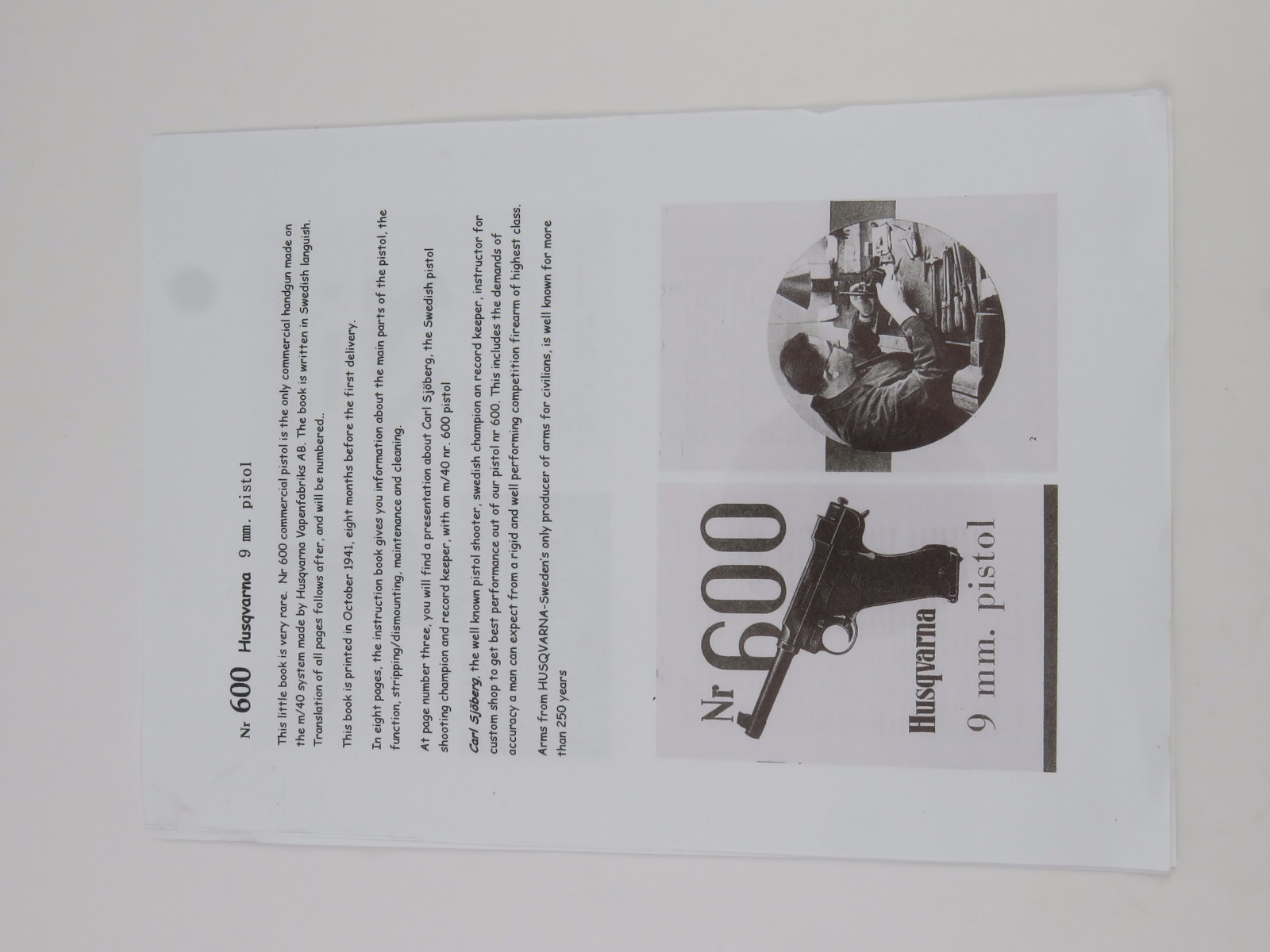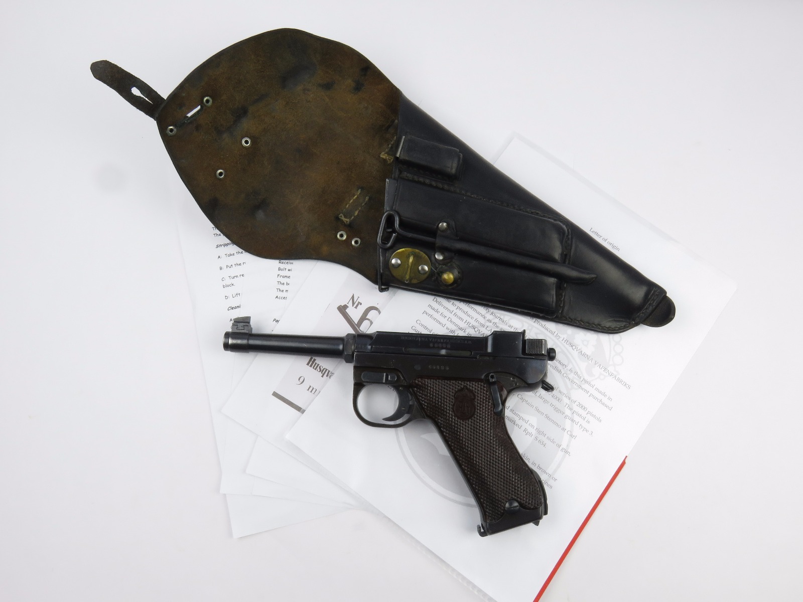 11/8/17 – This is an original late WW2 production Husqvarna made in a special series of 2000 pistols for Denmark. Most of this production batch was issued to police, and the police stamp is on the right side of the frame. This pistol is marked “Rplt S 654” which means “Rikspolitiet”. The pistol is all original condition and configuration, complete with two spare magazines, a cleaning rod, and “Made in Sweden” stamped holster. There is also a copy of the original manual that came with these pistols, and a translation (all of this is presented on 8.5×11 paper). Additionally, a letter of origin from 2015 is provided. The pistol is in about 97-98% condition with very nice dark bluing. There is some light surface scratching on the right side of the pistol, and light bore/muzzle wear. The front and back straps are excellent. The bore is mint. The pistol has an import stamp on the front of the trigger guard (shown in photos).
