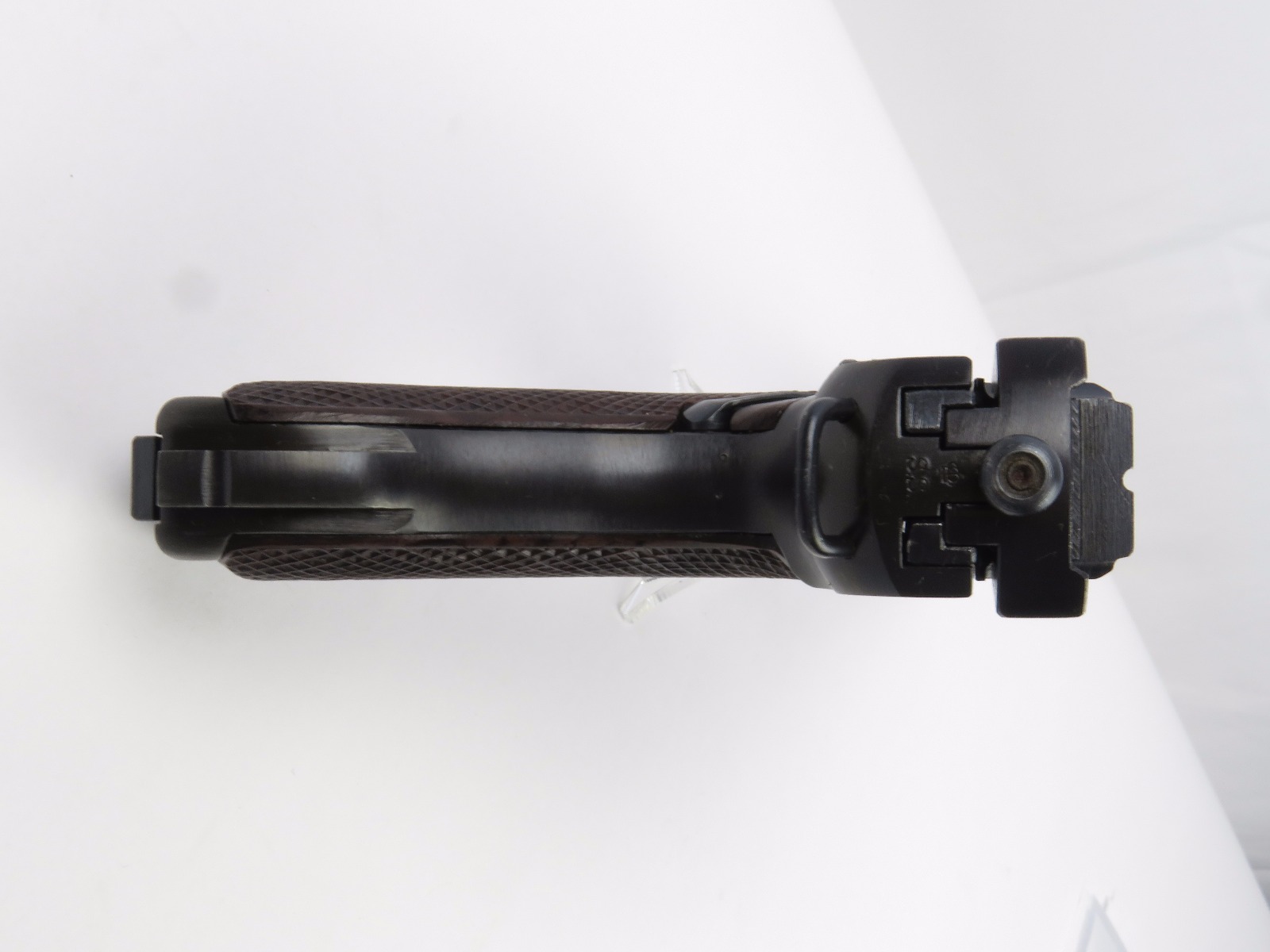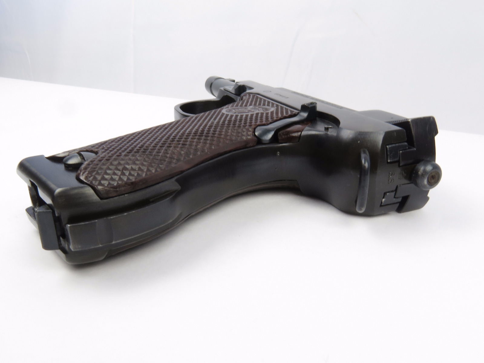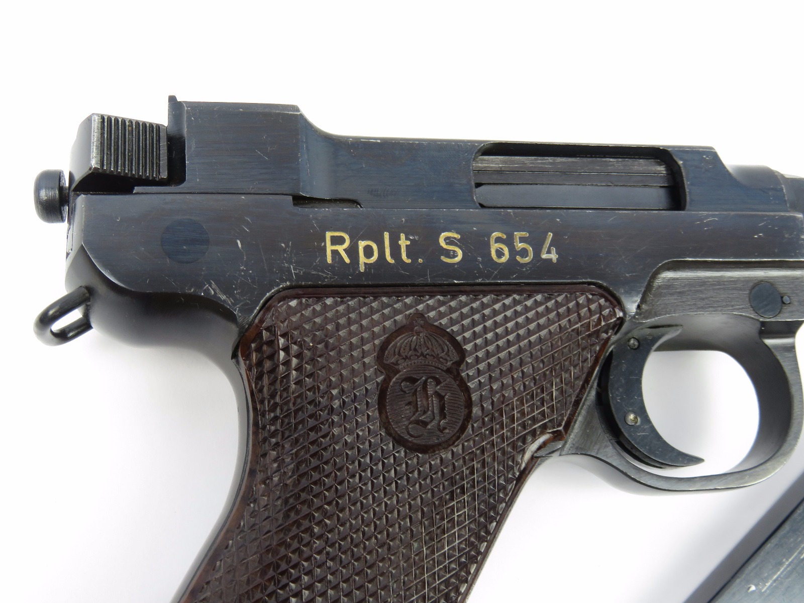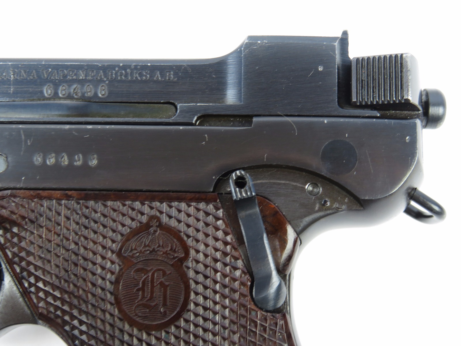 11/8/17 – This is an original late WW2 production Husqvarna made in a special series of 2000 pistols for Denmark. Most of this production batch was issued to police, and the police stamp is on the right side of the frame. This pistol is marked “Rplt S 654” which means “Rikspolitiet”. The pistol is all original condition and configuration, complete with two spare magazines, a cleaning rod, and “Made in Sweden” stamped holster. There is also a copy of the original manual that came with these pistols, and a translation (all of this is presented on 8.5×11 paper). Additionally, a letter of origin from 2015 is provided. The pistol is in about 97-98% condition with very nice dark bluing. There is some light surface scratching on the right side of the pistol, and light bore/muzzle wear. The front and back straps are excellent. The bore is mint. The pistol has an import stamp on the front of the trigger guard (shown in photos).