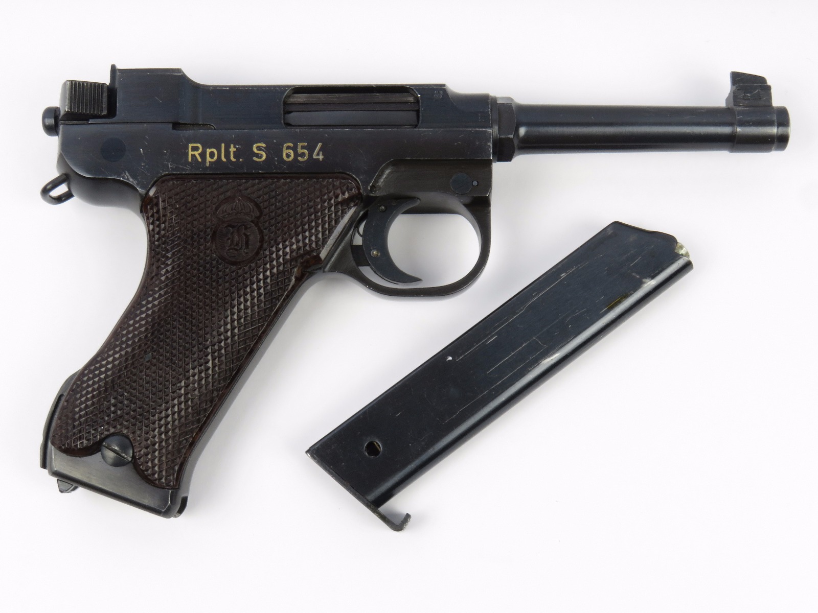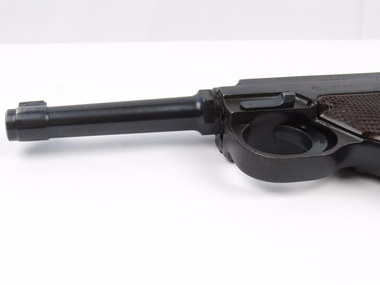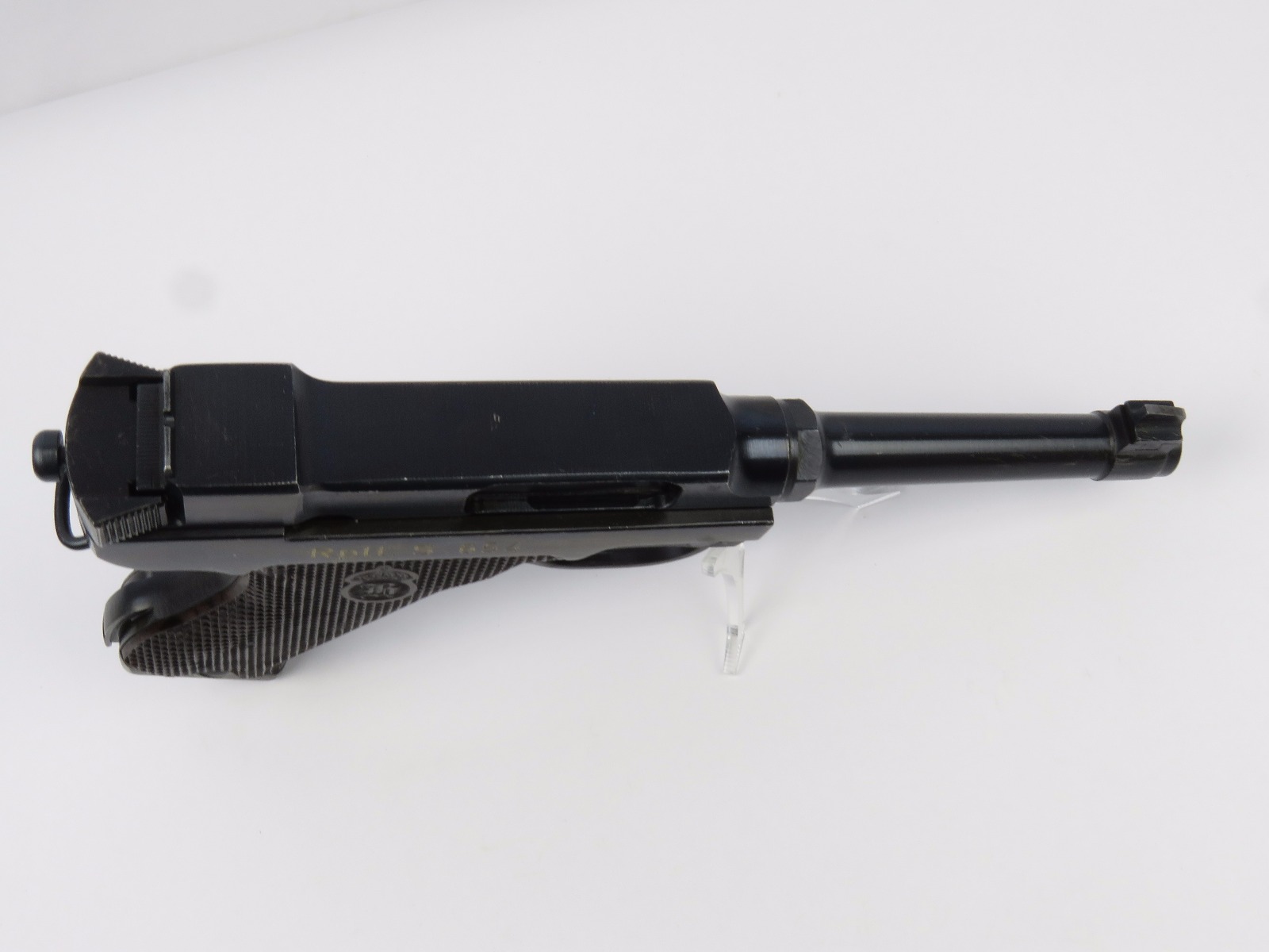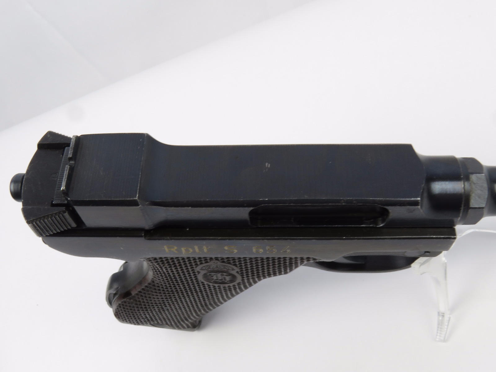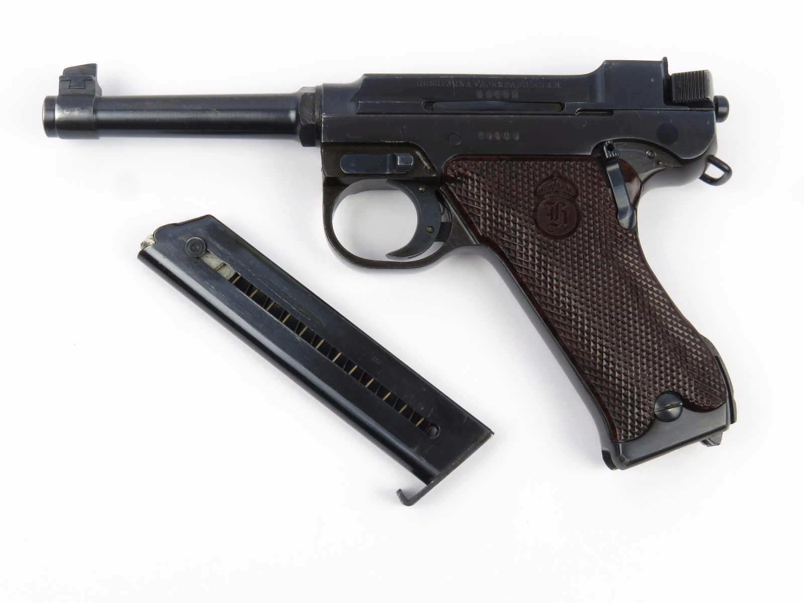 11/8/17 – This is an original late WW2 production Husqvarna made in a special series of 2000 pistols for Denmark. Most of this production batch was issued to police, and the police stamp is on the right side of the frame. This pistol is marked “Rplt S 654” which means “Rikspolitiet”. The pistol is all original condition and configuration, complete with two spare magazines, a cleaning rod, and “Made in Sweden” stamped holster. There is also a copy of the original manual that came with these pistols, and a translation (all of this is presented on 8.5×11 paper). Additionally, a letter of origin from 2015 is provided. The pistol is in about 97-98% condition with very nice dark bluing. There is some light surface scratching on the right side of the pistol, and light bore/muzzle wear. The front and back straps are excellent. The bore is mint. The pistol has an import stamp on the front of the trigger guard (shown in photos).