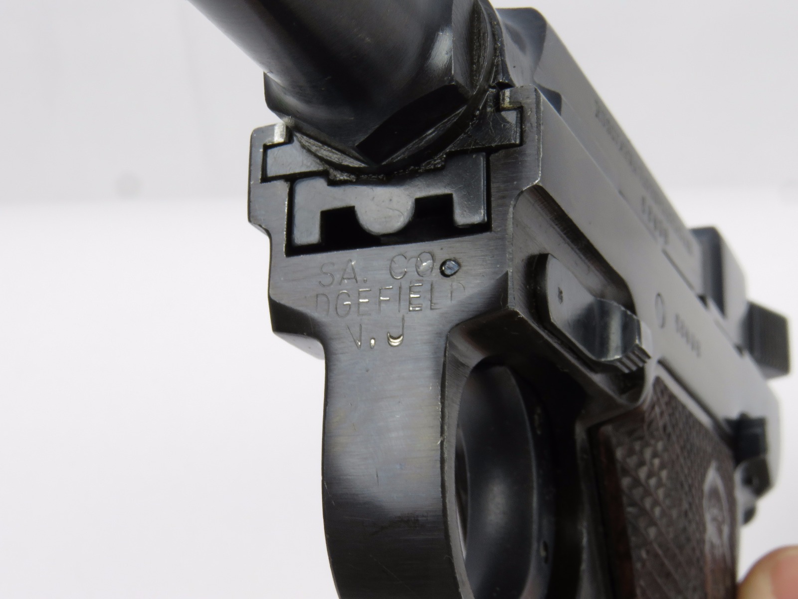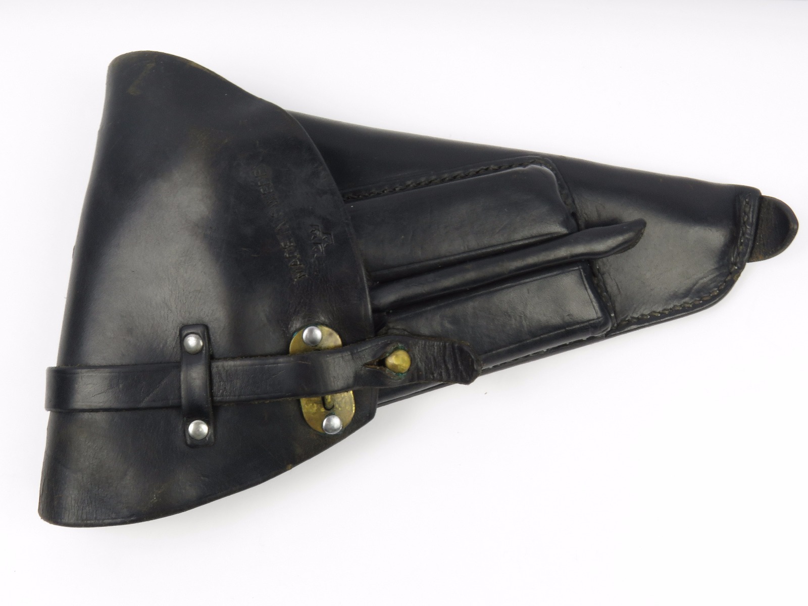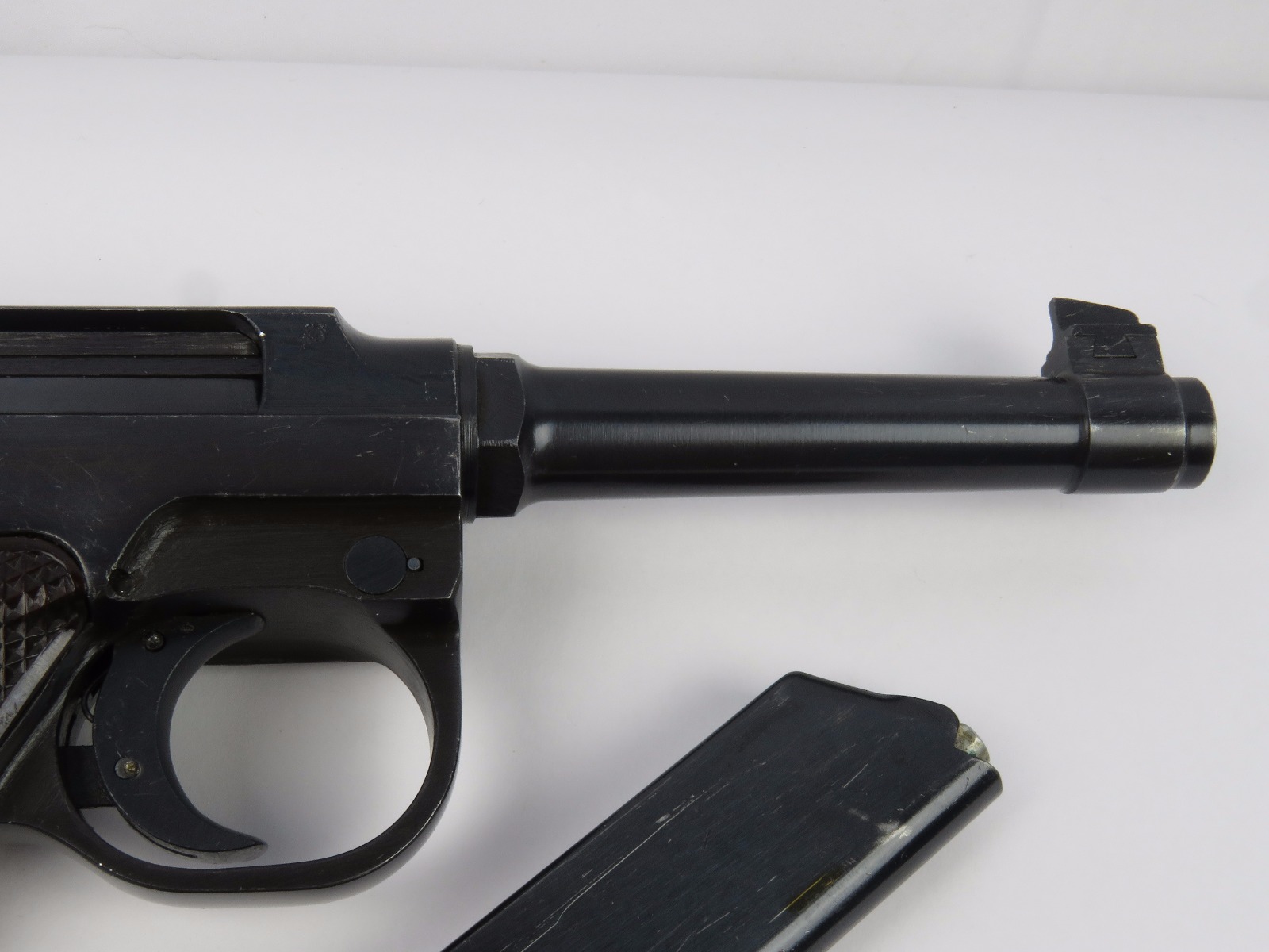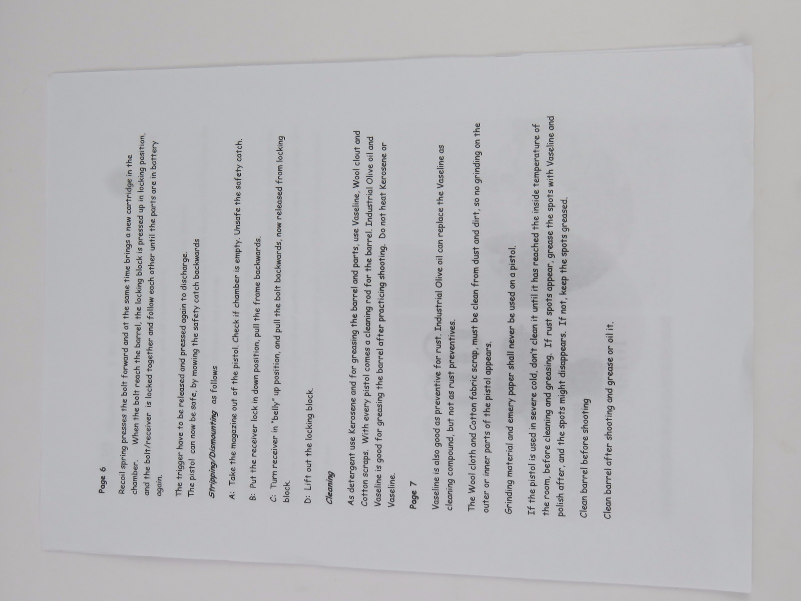 11/8/17 – This is an original late WW2 production Husqvarna made in a special series of 2000 pistols for Denmark. Most of this production batch was issued to police, and the police stamp is on the right side of the frame. This pistol is marked “Rplt S 654” which means “Rikspolitiet”. The pistol is all original condition and configuration, complete with two spare magazines, a cleaning rod, and “Made in Sweden” stamped holster. There is also a copy of the original manual that came with these pistols, and a translation (all of this is presented on 8.5×11 paper). Additionally, a letter of origin from 2015 is provided. The pistol is in about 97-98% condition with very nice dark bluing. There is some light surface scratching on the right side of the pistol, and light bore/muzzle wear. The front and back straps are excellent. The bore is mint. The pistol has an import stamp on the front of the trigger guard (shown in photos).