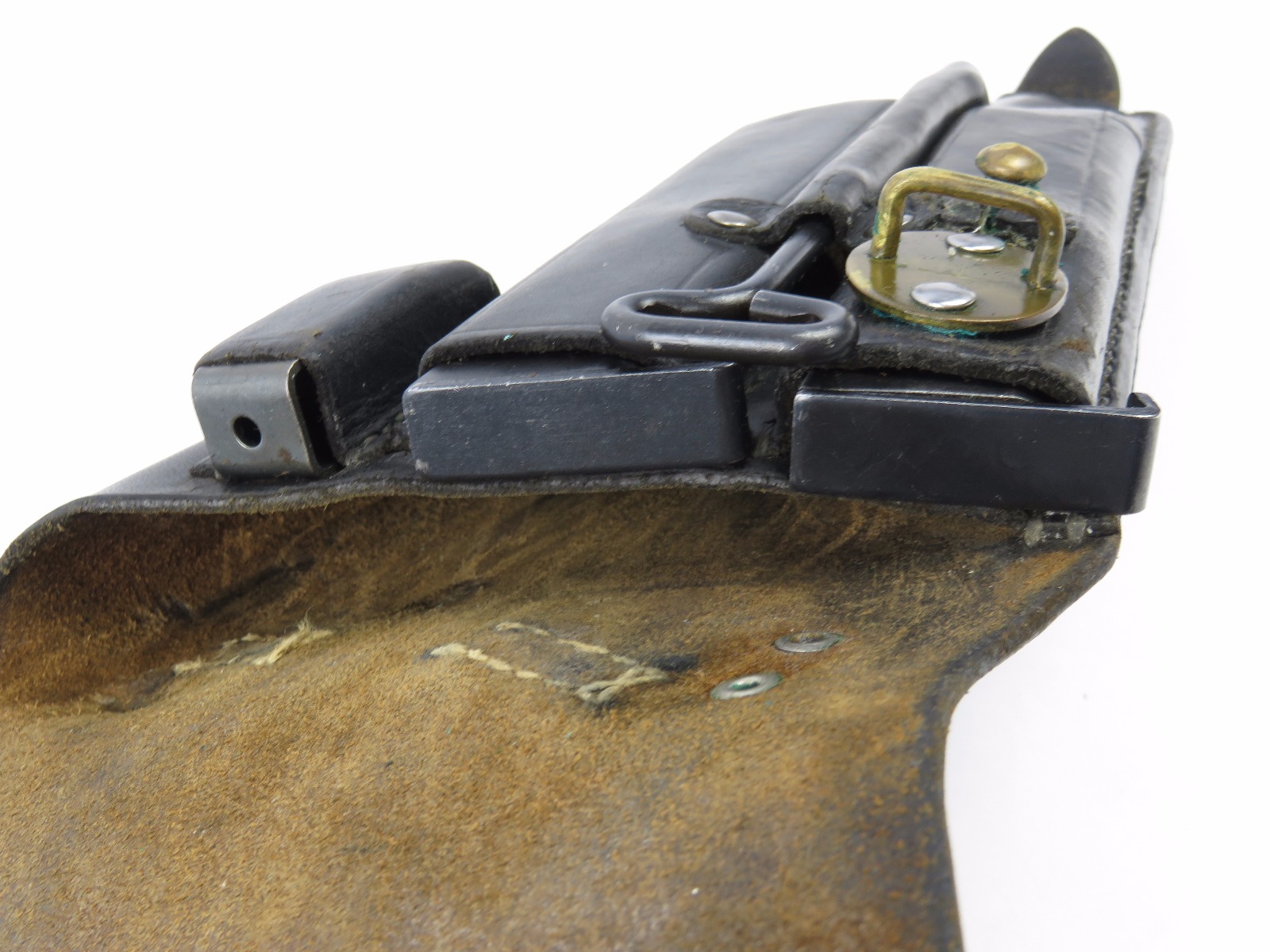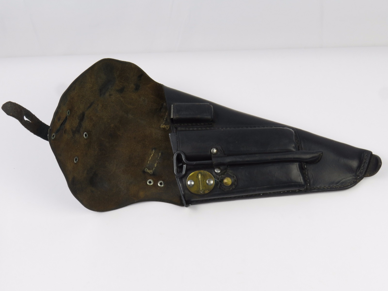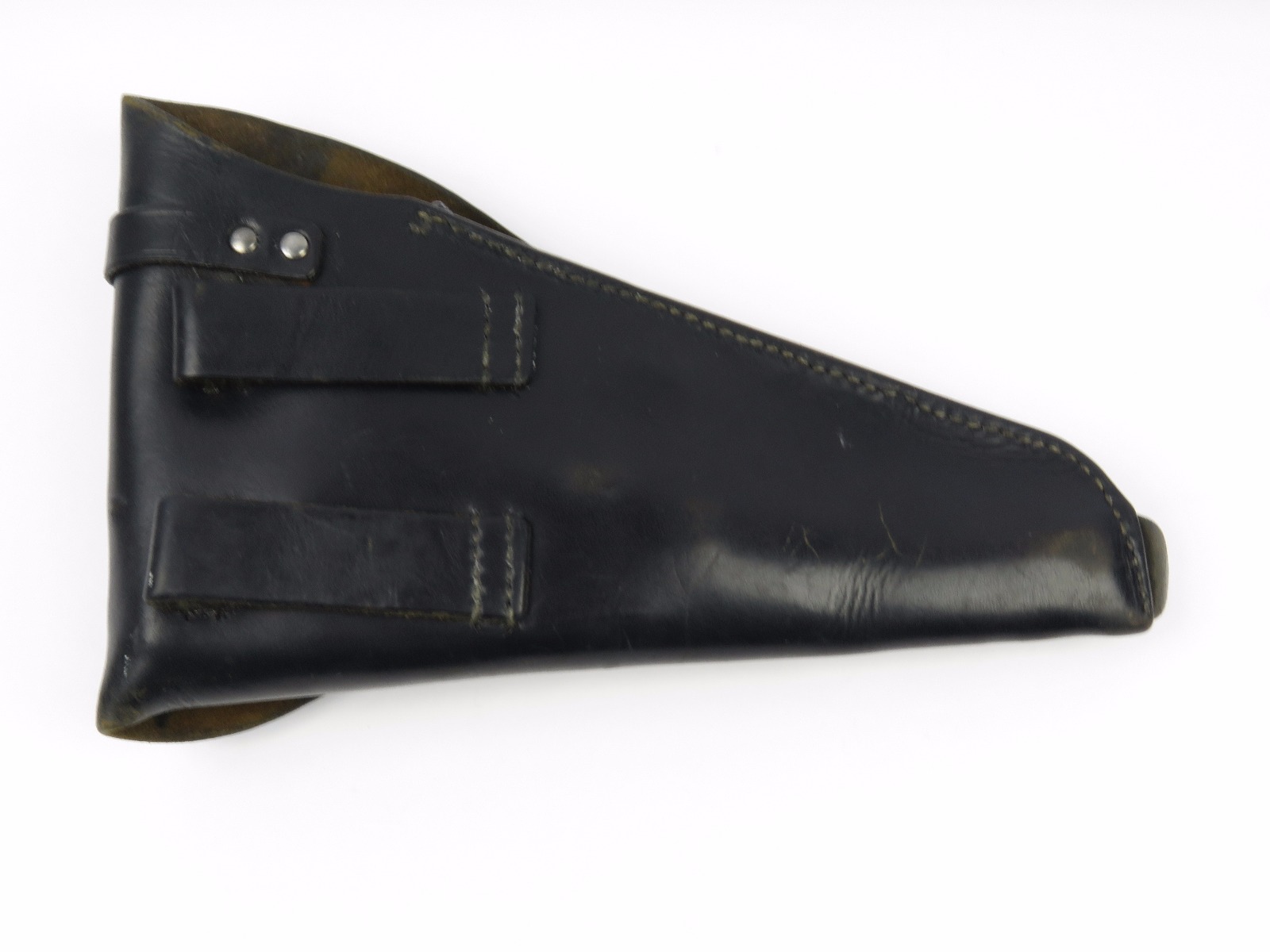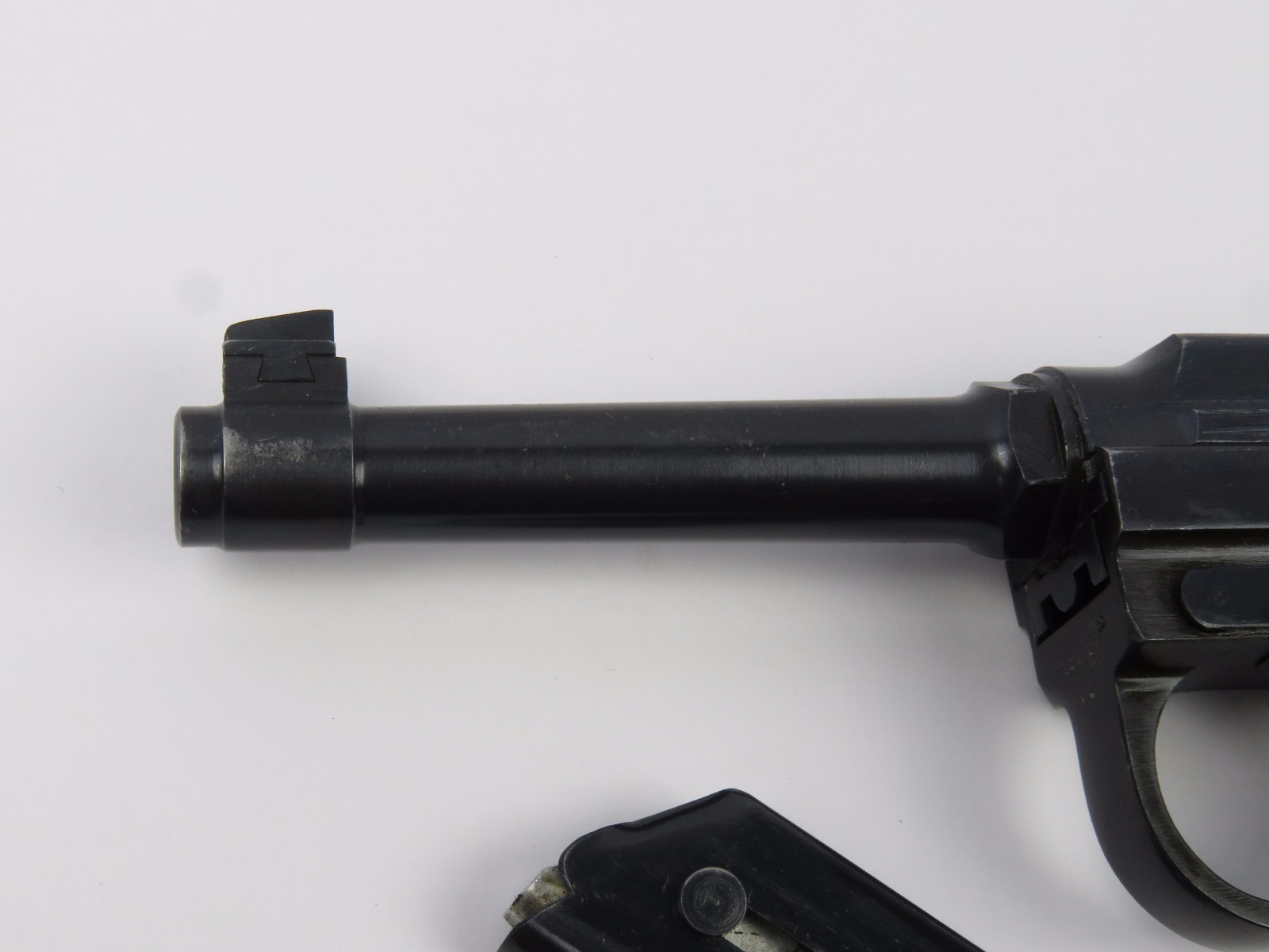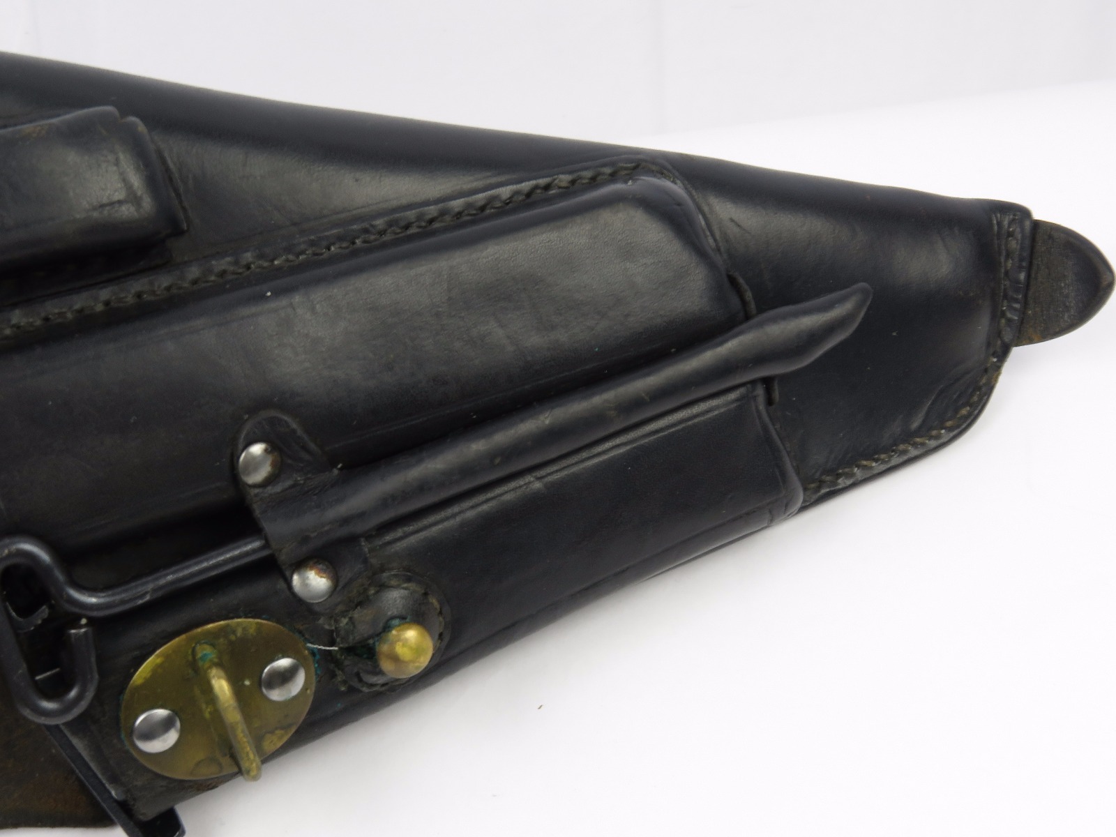 11/8/17 – This is an original late WW2 production Husqvarna made in a special series of 2000 pistols for Denmark. Most of this production batch was issued to police, and the police stamp is on the right side of the frame. This pistol is marked “Rplt S 654” which means “Rikspolitiet”. The pistol is all original condition and configuration, complete with two spare magazines, a cleaning rod, and “Made in Sweden” stamped holster. There is also a copy of the original manual that came with these pistols, and a translation (all of this is presented on 8.5×11 paper). Additionally, a letter of origin from 2015 is provided. The pistol is in about 97-98% condition with very nice dark bluing. There is some light surface scratching on the right side of the pistol, and light bore/muzzle wear. The front and back straps are excellent. The bore is mint. The pistol has an import stamp on the front of the trigger guard (shown in photos).