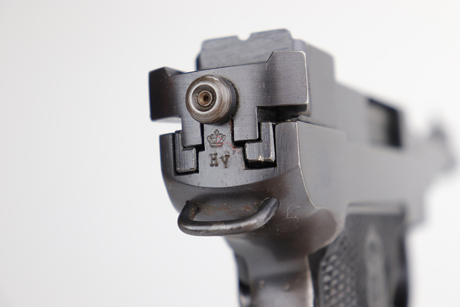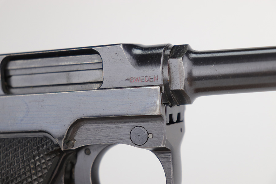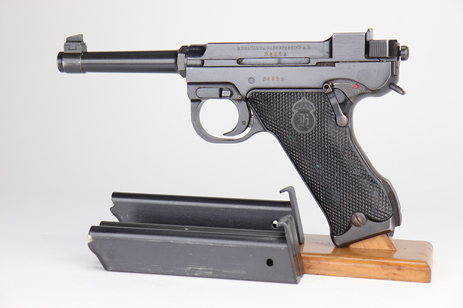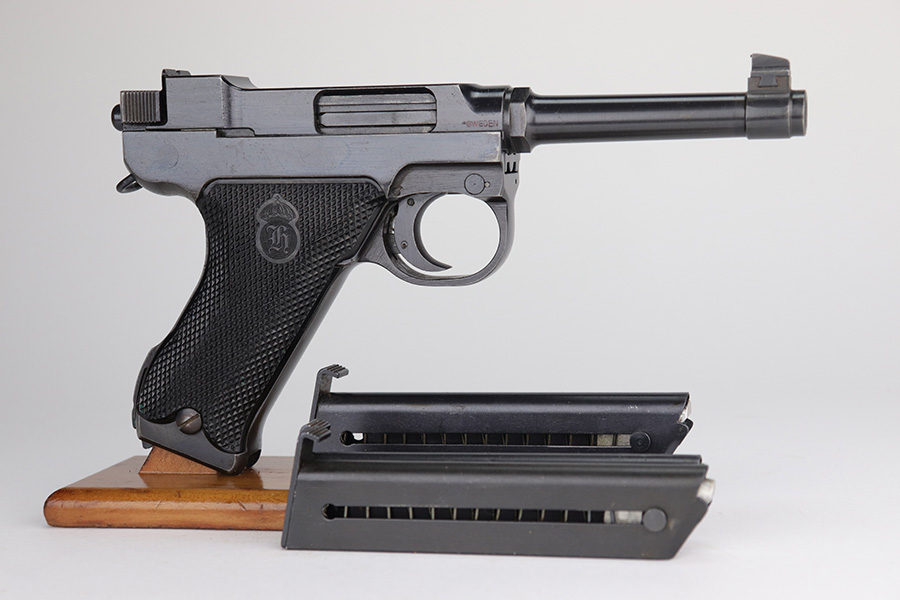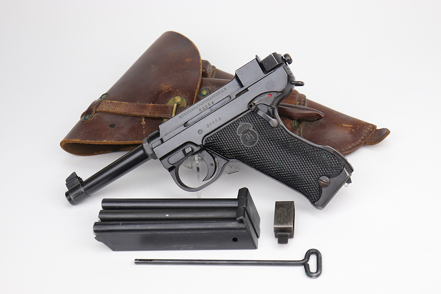 1/6/23 – This is an excellent example of a complete Husqvarna M40 rig that was part of a Danish Police contract, as indicated by the ‘D’ prefix in the serial. This is a Swedish made copy of the Lahtl L-35, as the Swedish army realized there would be a shortage of pistols in the event of large scale military mobilization in Europe. Originally adopting the Walther P38 in 1939, Germany’s entry into World War II stopped the export of P38s to Sweden. To compensate, Sweden adopted the Lahti pistol but was unable to import L-35-type guns because of Finland’s conflicts with the USSR. Production was licensed to Svenska Automatvapen AB but the immediate collapse of the company passed the contract to Husqvarna Vapenfabriks Aktiebolag. The first m/40s were delivered to the Swedish military by 1942 with slight differences from the Finnish L-35 Lahtis. The grips of the m/40 have the Husqvarna “crown H” motif engraved and the front sight was slightly larger. The barrel is also slightly longer on the m/40 than the Finnish Lahti with the m/40’s trigger guard being heavier, and the pistol does not have the loaded chamber indicator and lock-retaining spring of the Finnish Lahti. This one is all matching and has a “Crown HV” proof on the tang. It comes as a complete rig with a holster (“Crown HV” proofed), tool, cleaning rod, and three total magazines. It has retained about 92-93% of its bluing with most of the wear on the straps. Excellent bore. No import marks.