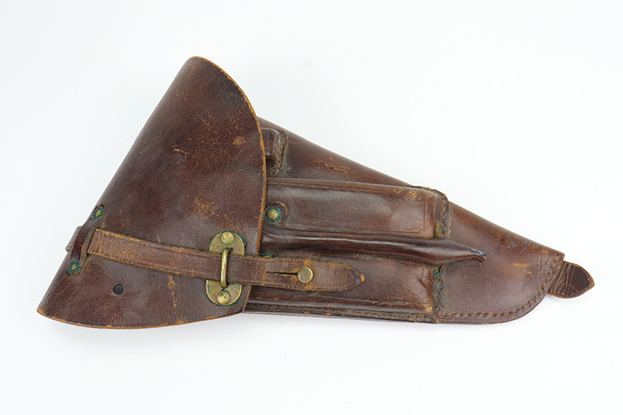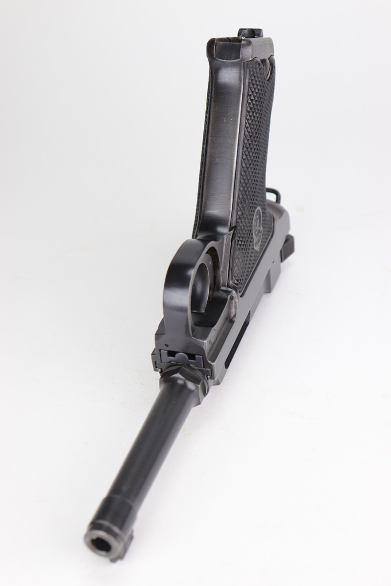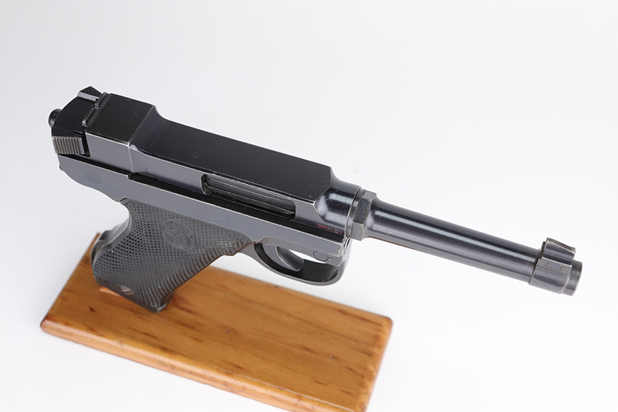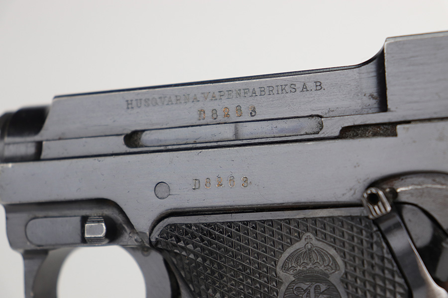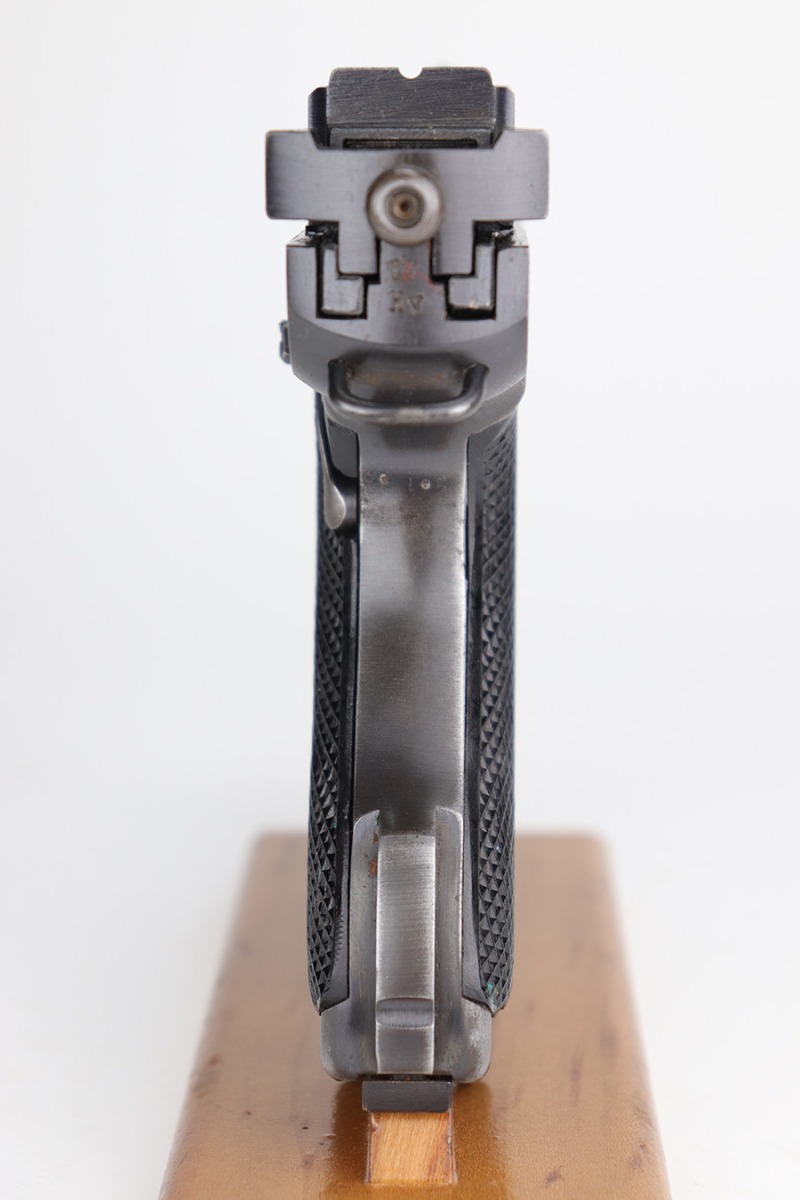 1/6/23 – This is an excellent example of a complete Husqvarna M40 rig that was part of a Danish Police contract, as indicated by the ‘D’ prefix in the serial. This is a Swedish made copy of the Lahtl L-35, as the Swedish army realized there would be a shortage of pistols in the event of large scale military mobilization in Europe. Originally adopting the Walther P38 in 1939, Germany’s entry into World War II stopped the export of P38s to Sweden. To compensate, Sweden adopted the Lahti pistol but was unable to import L-35-type guns because of Finland’s conflicts with the USSR. Production was licensed to Svenska Automatvapen AB but the immediate collapse of the company passed the contract to Husqvarna Vapenfabriks Aktiebolag. The first m/40s were delivered to the Swedish military by 1942 with slight differences from the Finnish L-35 Lahtis. The grips of the m/40 have the Husqvarna “crown H” motif engraved and the front sight was slightly larger. The barrel is also slightly longer on the m/40 than the Finnish Lahti with the m/40’s trigger guard being heavier, and the pistol does not have the loaded chamber indicator and lock-retaining spring of the Finnish Lahti. This one is all matching and has a “Crown HV” proof on the tang. It comes as a complete rig with a holster (“Crown HV” proofed), tool, cleaning rod, and three total magazines. It has retained about 92-93% of its bluing with most of the wear on the straps. Excellent bore. No import marks.
