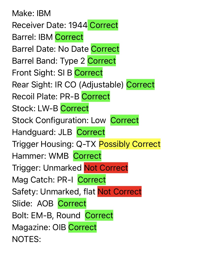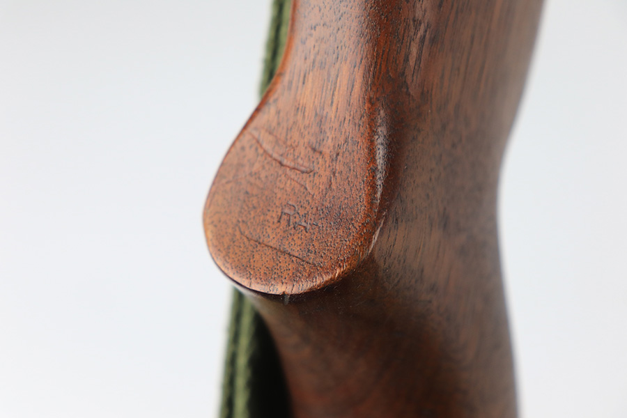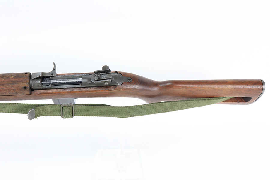 3/22/22 – This is a nice example of a nearly all-correct I.B.M. M1 Carbine from 1944. A full parts guide is included in the listing, and the unmarked trigger and safety are likely the only “incorrect” parts on the rifle. The Q-TX marking on the trigger housing is actually a rare Un-Quality example, but several resources mention they can be found on IBM carbines. The adjustable rear sight and round bolt are correct for this serial number. The finish is original and in good condition but there are some splotches in the finish on the receiver, and some thinning of the barrel. The gun has not been re-worked or been through an arsenal, though. Excellent, shiny bore. Stock is in great condition with minor dings but sharp cartouches. Comes with a canvas sling.
