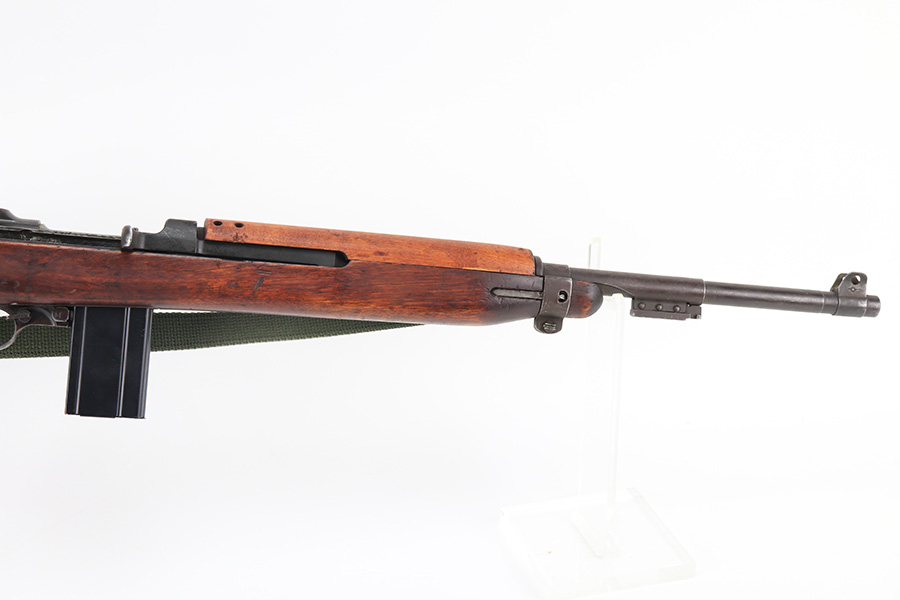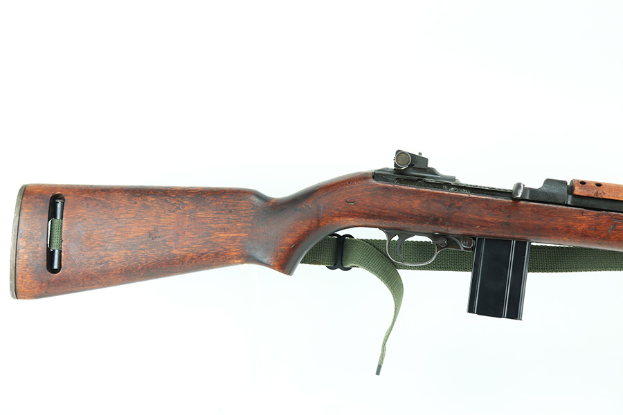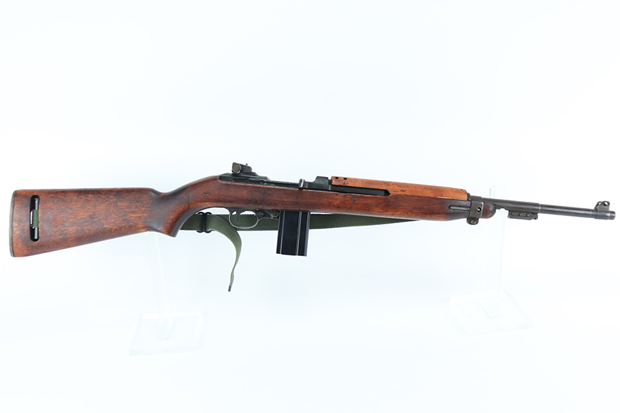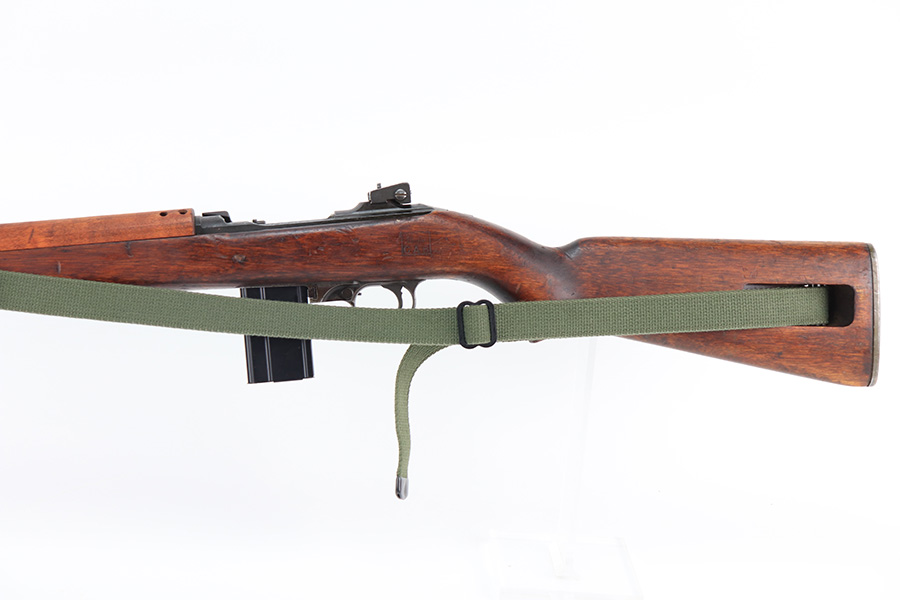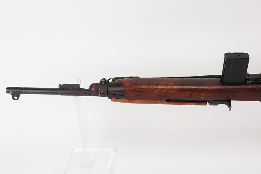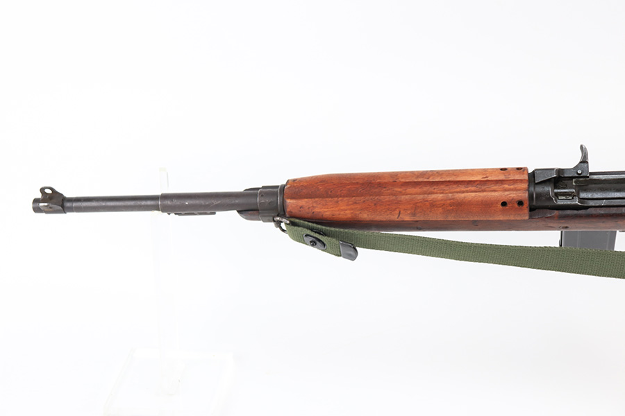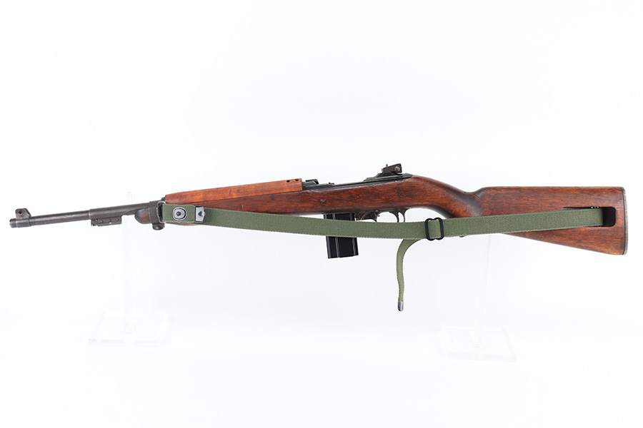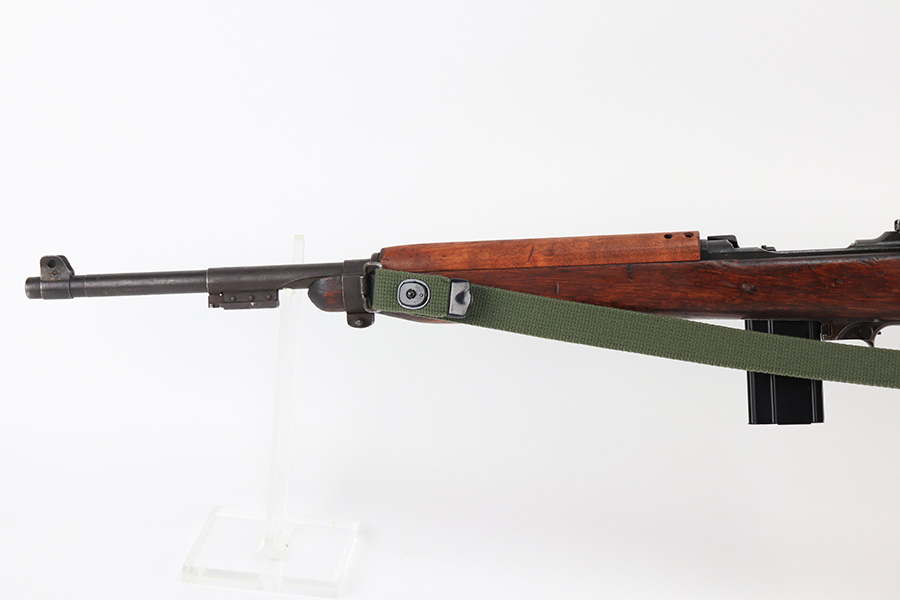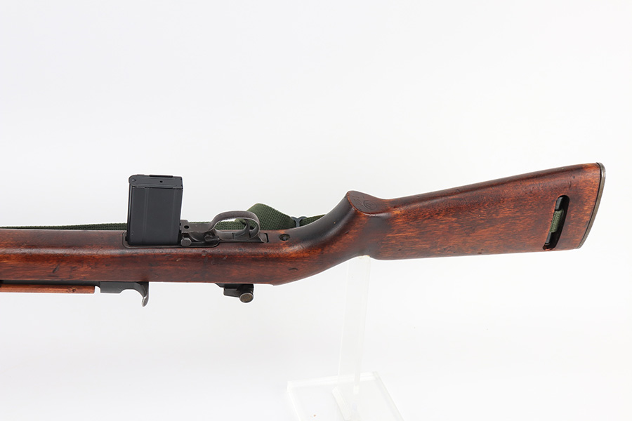 12/28/21 – This is a very nice example of an IBM M1 Carbine issued to the US military in January of 1944. A complete list of the parts and their markings is included in the photos. The gun comes with a post-war magazine, oiler, and a post-war green canvas sling. A bayonet lug and adjustable rear sight have been added, likely for use during the Korean War. Import mark on the underside of the barrel. There is a “BA CAB” marking on the stock, indicating it was reworked at an arsenal after WW2. The stock also has a “P” proof on the wrist and a military cross-canon cartouche on the right side of the stock. Flaming bomb on the barrel. Overall, the gun is in very nice condition. There is minor wear around the muzzle and high edges in general. Some light scratches and light brown patina along the barrel. The stock is very nice with minor dings and dents here and there. Hairline crack in the stock just behind the recoil plate that does not appear to affect the integrity of the stock. The bore is mint. Note: The slide locks back automatically with this magazine.