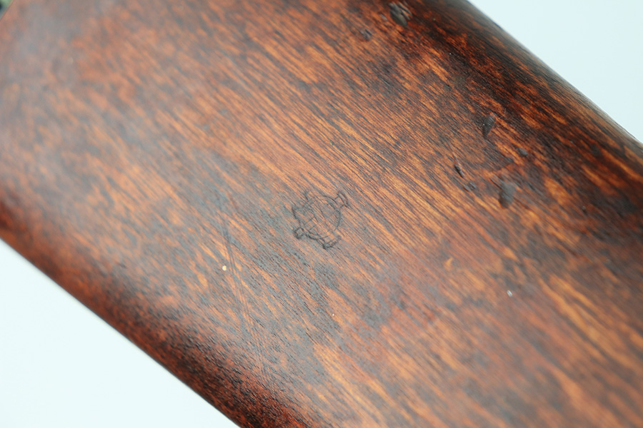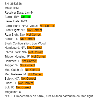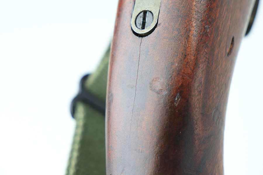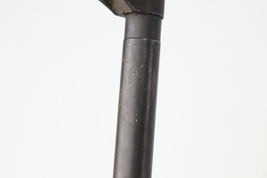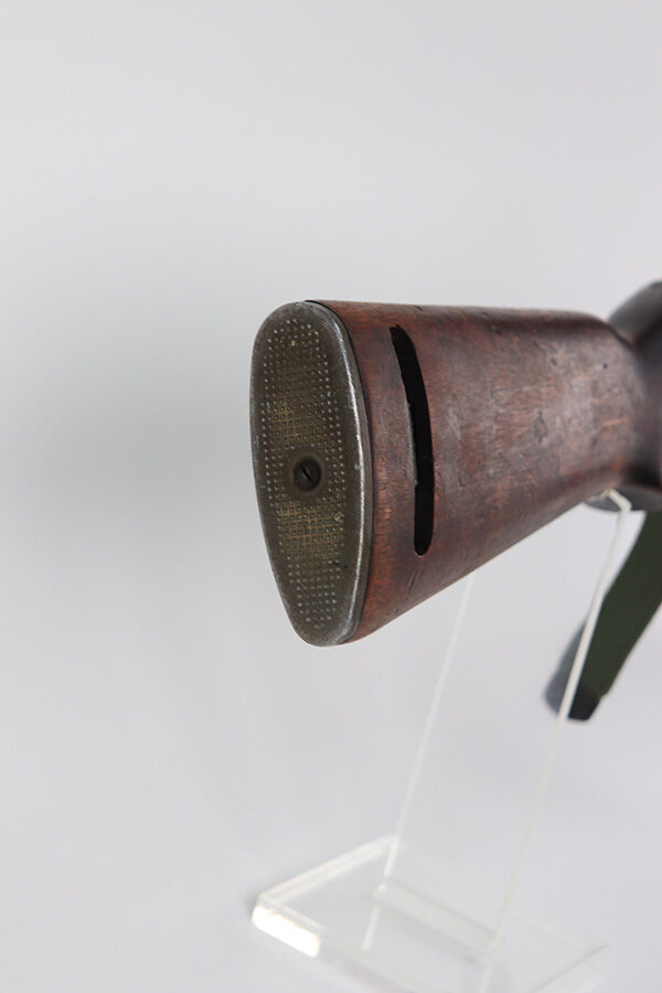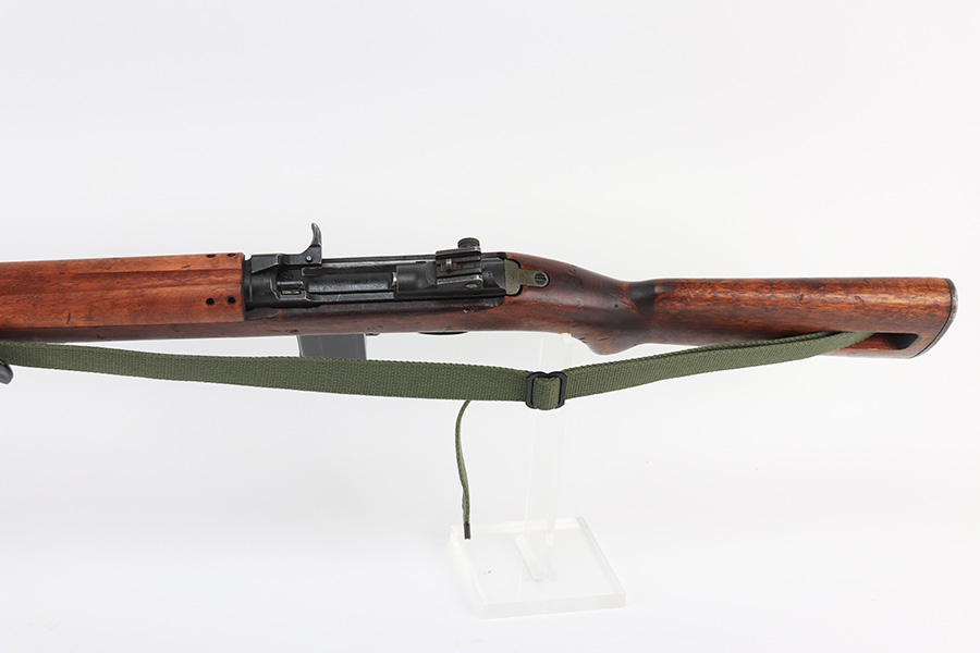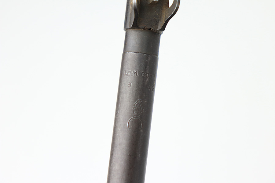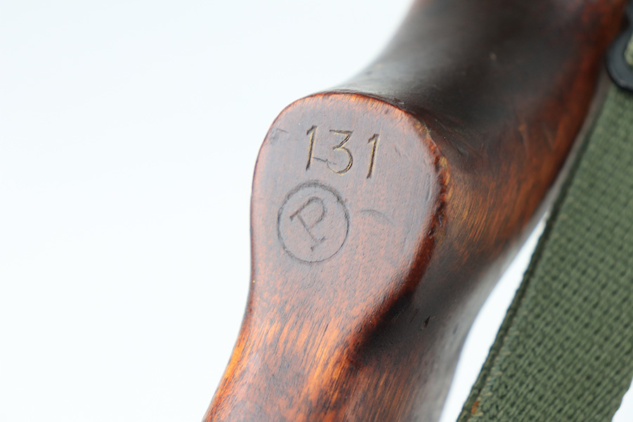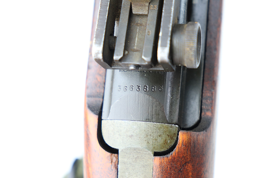 12/28/21 – This is a very nice example of an IBM M1 Carbine issued to the US military in January of 1944. A complete list of the parts and their markings is included in the photos. The gun comes with a post-war magazine, oiler, and a post-war green canvas sling. A bayonet lug and adjustable rear sight have been added, likely for use during the Korean War. Import mark on the underside of the barrel. There is a “BA CAB” marking on the stock, indicating it was reworked at an arsenal after WW2. The stock also has a “P” proof on the wrist and a military cross-canon cartouche on the right side of the stock. Flaming bomb on the barrel. Overall, the gun is in very nice condition. There is minor wear around the muzzle and high edges in general. Some light scratches and light brown patina along the barrel. The stock is very nice with minor dings and dents here and there. Hairline crack in the stock just behind the recoil plate that does not appear to affect the integrity of the stock. The bore is mint. Note: The slide locks back automatically with this magazine.