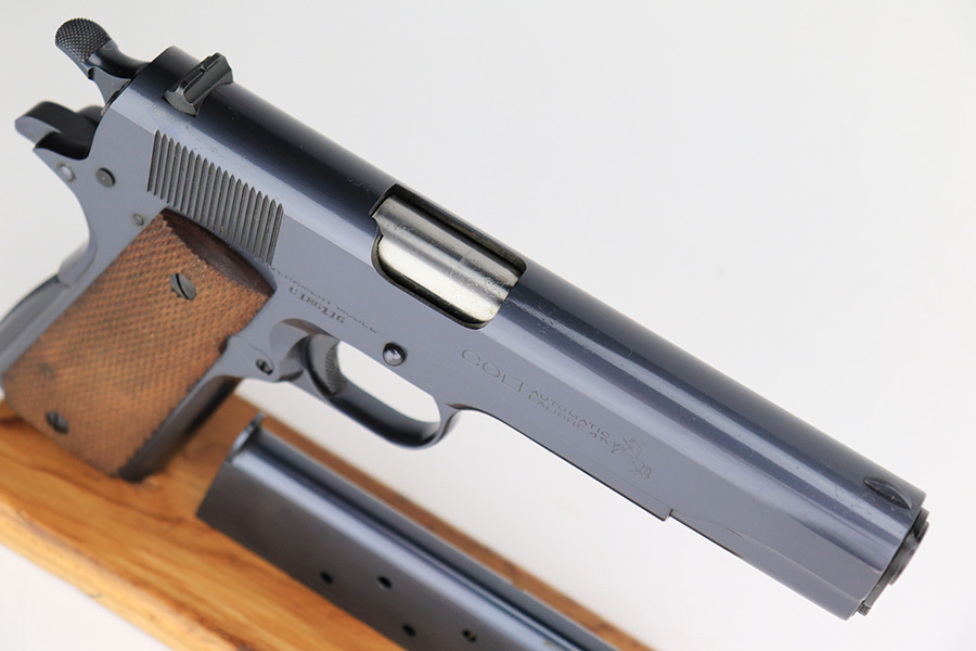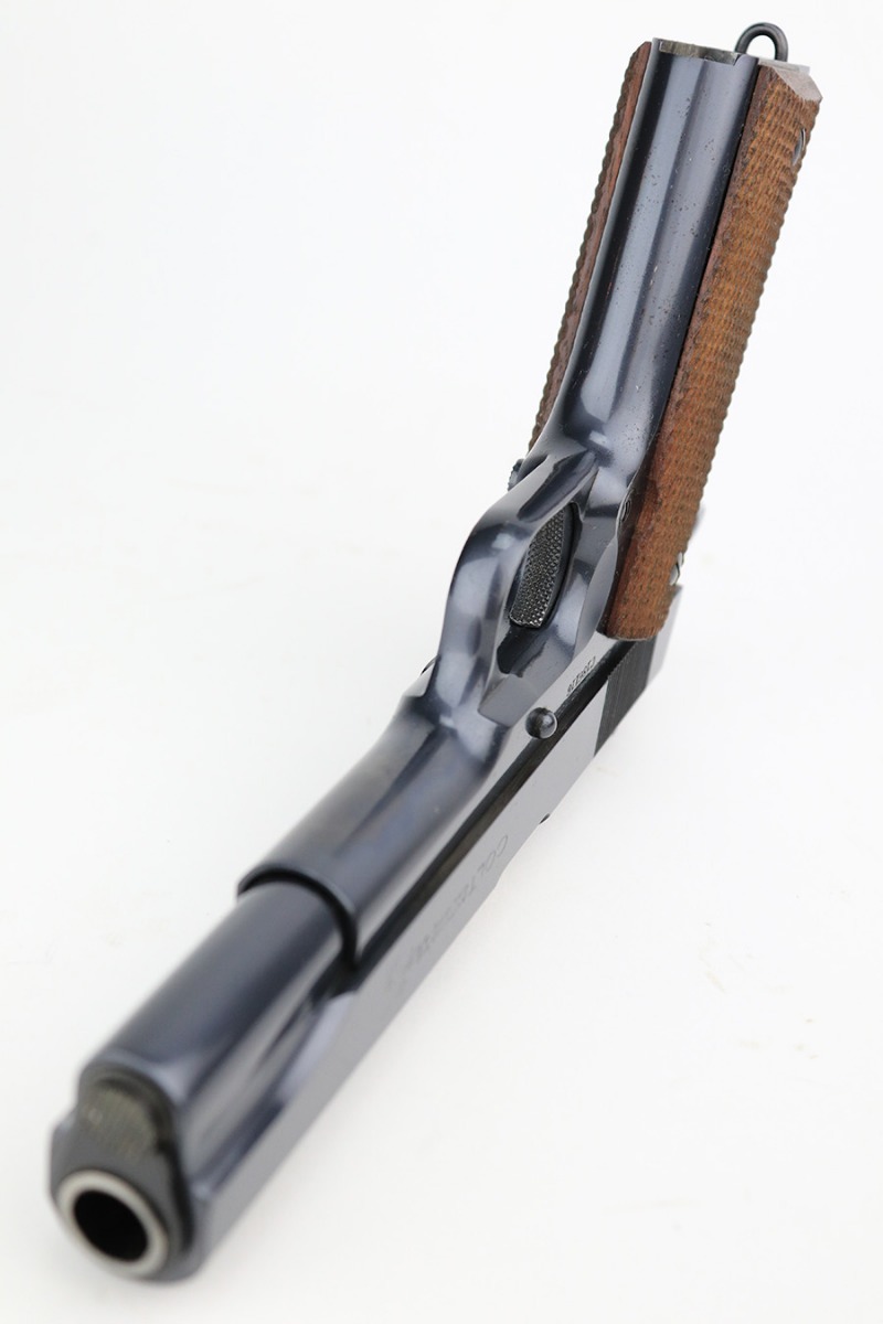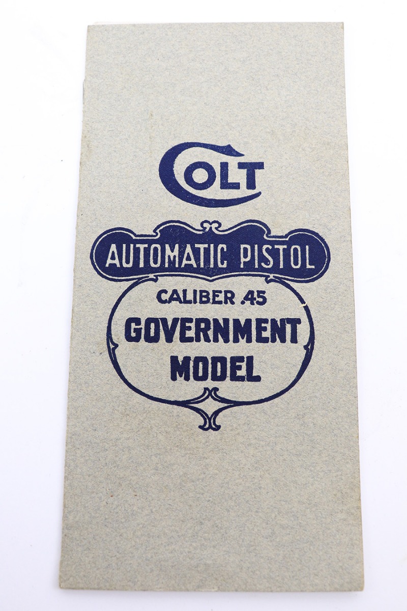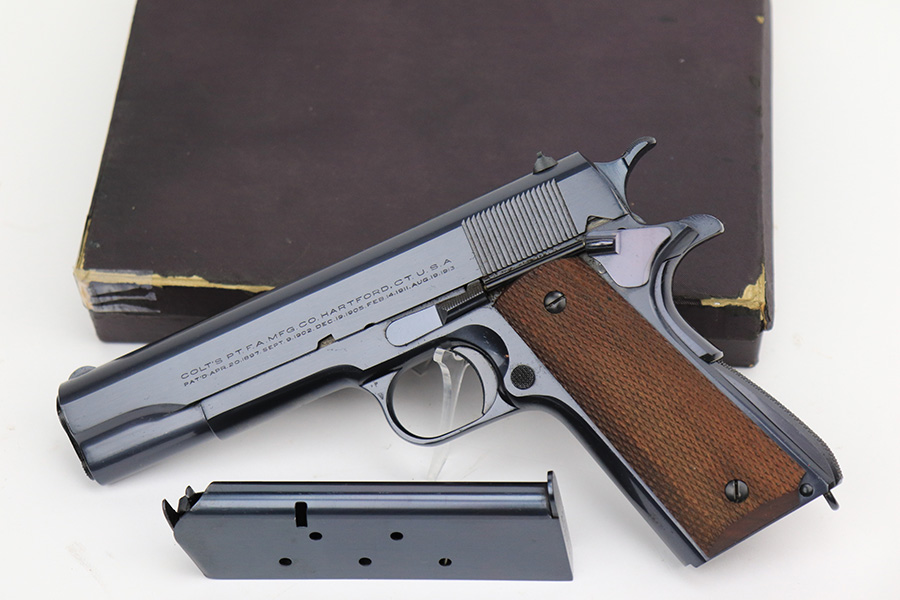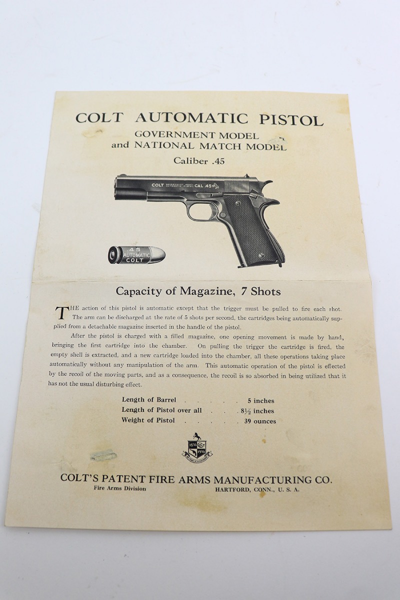 5/30/23 – This is a truly exceptional Colt Government Model 1911A1 from 1937-38 in its original box. The pistol appears to be in nearly unfired condition, and is probably the finest commercial 1911A1 we have ever offered, it simply can’t be upgrade. Mint bore, mint grips, mint mag. The pistol shows only a tiny hint of a takedown scratch on the frame, but otherwise looks like it just left the factory. Not only does it come with the original Colt box, which is hand numbered and matching on the bottom, but even has the original manuals and mailing envelope it was sent with.