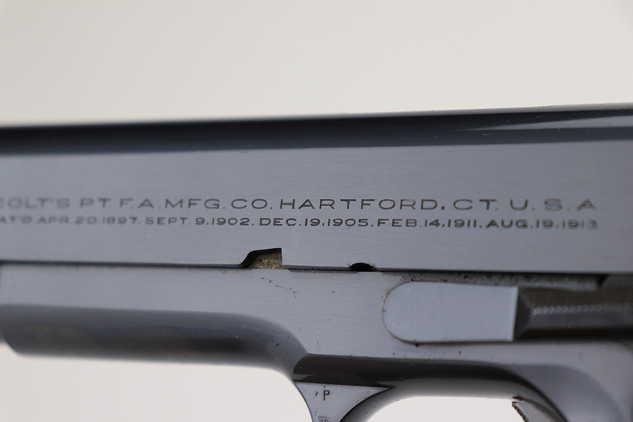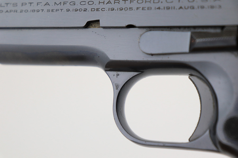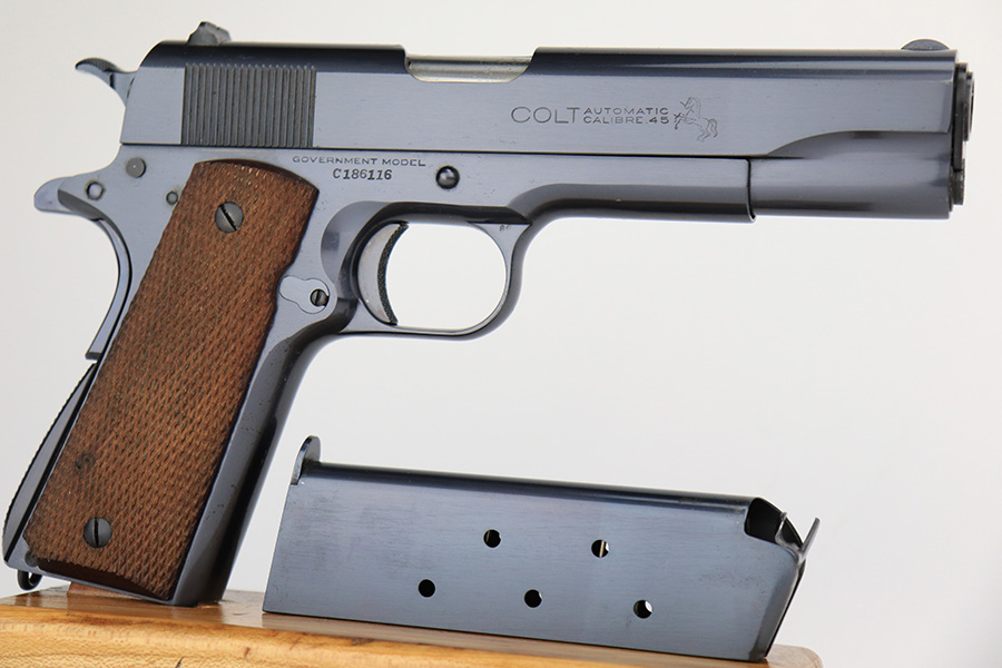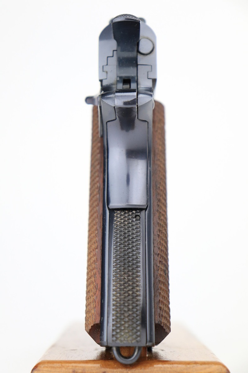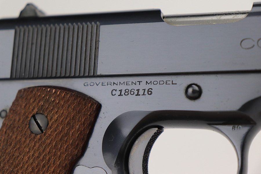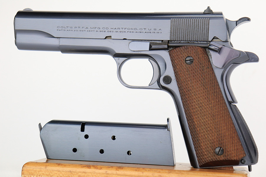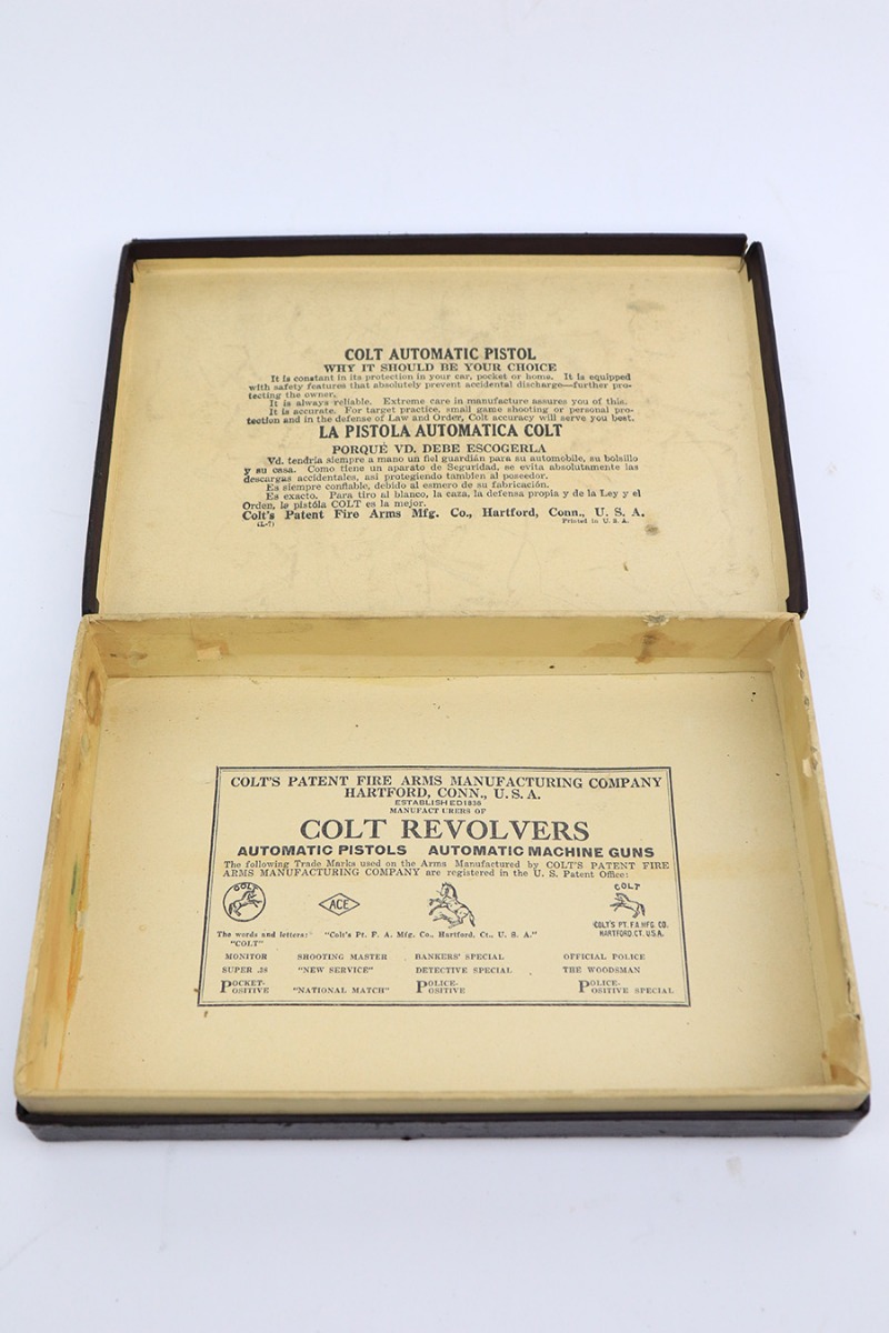 5/30/23 – This is a truly exceptional Colt Government Model 1911A1 from 1937-38 in its original box. The pistol appears to be in nearly unfired condition, and is probably the finest commercial 1911A1 we have ever offered, it simply can’t be upgrade. Mint bore, mint grips, mint mag. The pistol shows only a tiny hint of a takedown scratch on the frame, but otherwise looks like it just left the factory. Not only does it come with the original Colt box, which is hand numbered and matching on the bottom, but even has the original manuals and mailing envelope it was sent with.