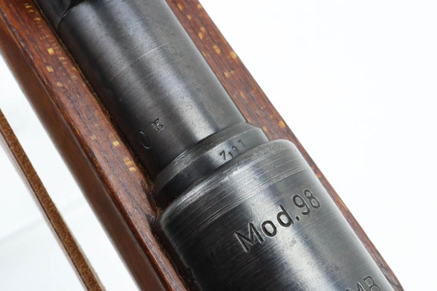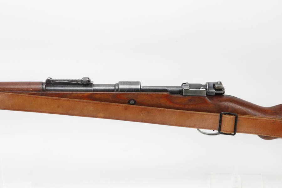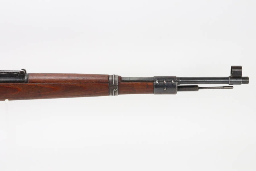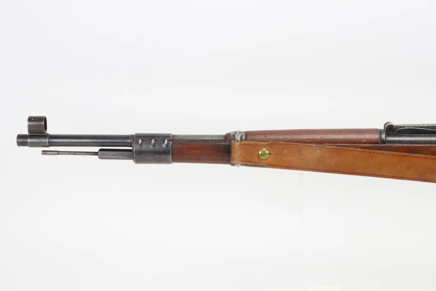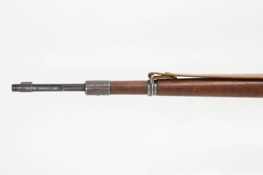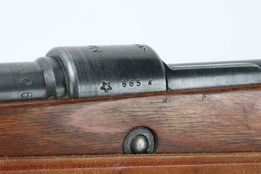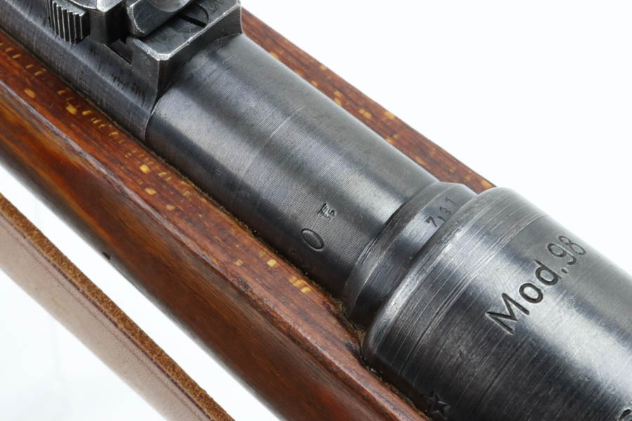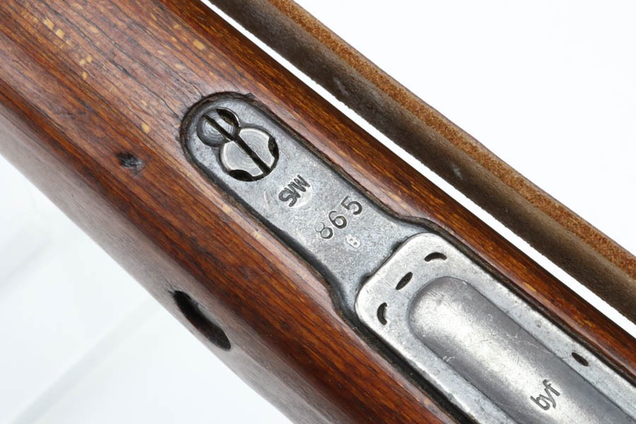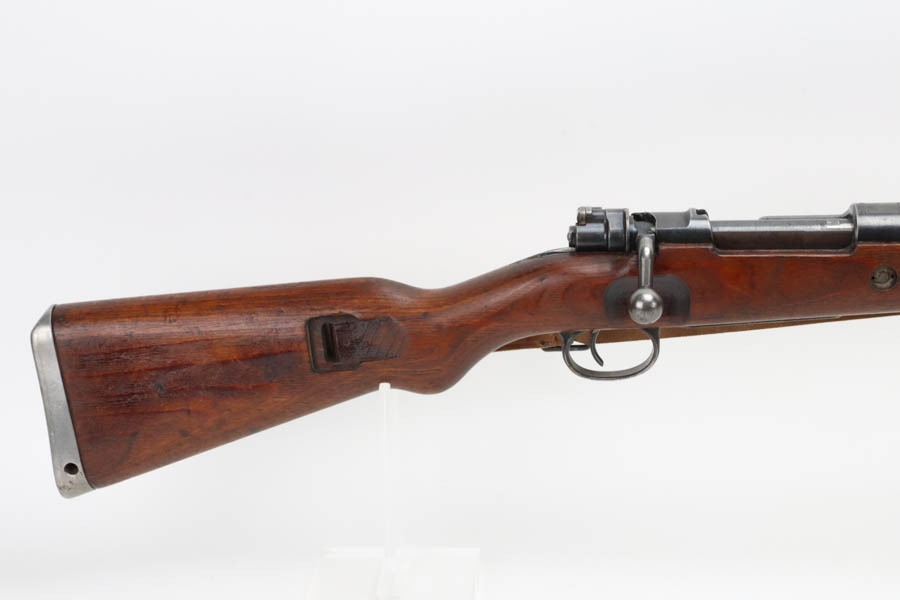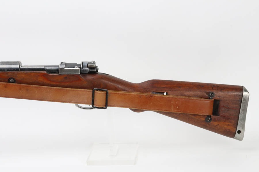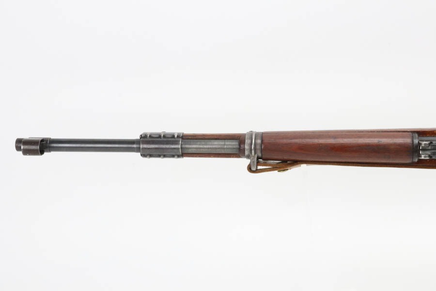 11/21/24 – This is a very nice example of a Mauser K98 put together by the French immediately after WW2 using leftover Nazi parts. It is all matching with French Star proofs. A few of the small parts have German waffen military proofs. The finish on the metal parts rates roughly 85% with general high edge wear and some areas of minor thinning – most noticeable on the receiver, along the barrel, and on the floor plate. Light surface oxidation around the crown of the muzzle. The wood furniture shows no major damage, just minor bruising throughout. Very nice bore with good rifling. Comes with a minty leather sling.