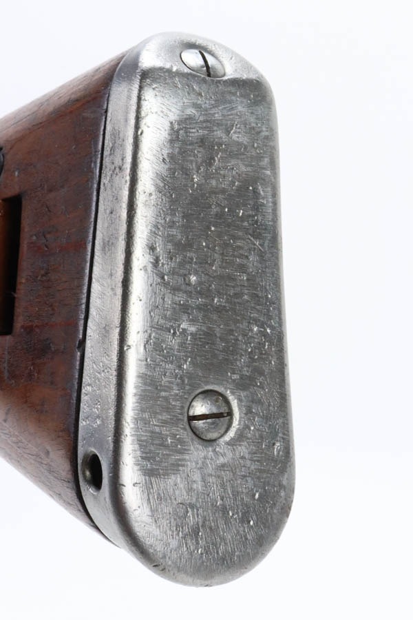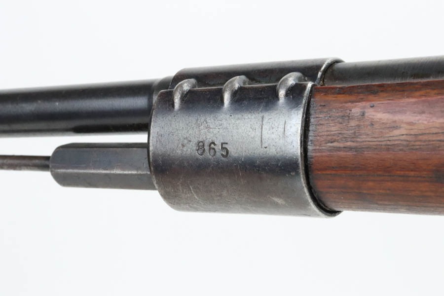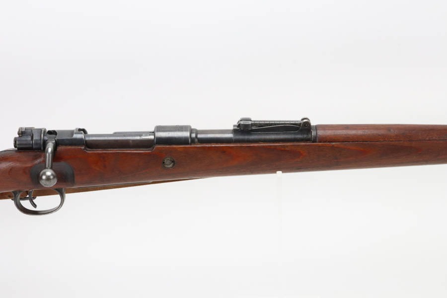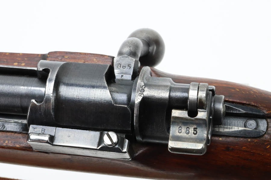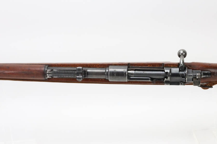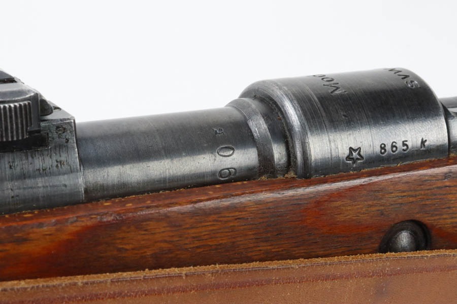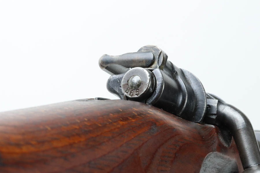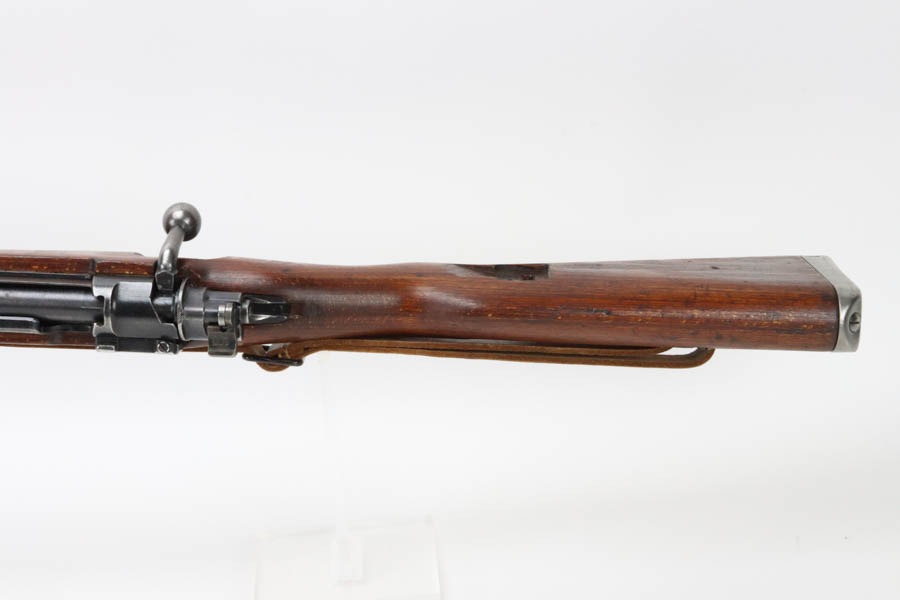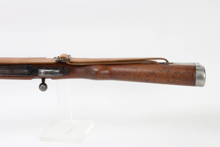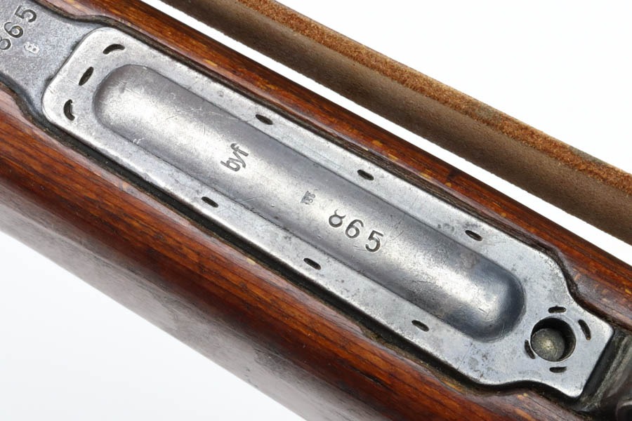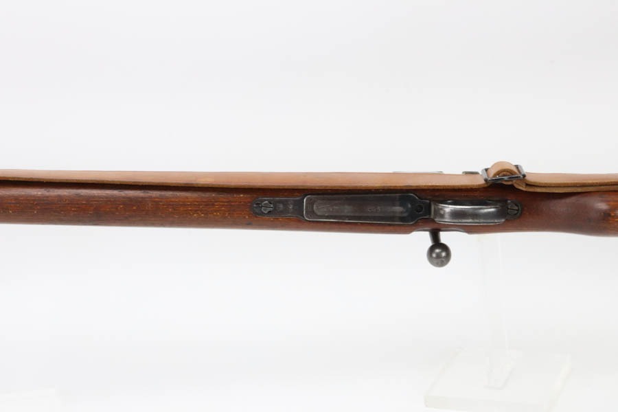 11/21/24 – This is a very nice example of a Mauser K98 put together by the French immediately after WW2 using leftover Nazi parts. It is all matching with French Star proofs. A few of the small parts have German waffen military proofs. The finish on the metal parts rates roughly 85% with general high edge wear and some areas of minor thinning – most noticeable on the receiver, along the barrel, and on the floor plate. Light surface oxidation around the crown of the muzzle. The wood furniture shows no major damage, just minor bruising throughout. Very nice bore with good rifling. Comes with a minty leather sling.