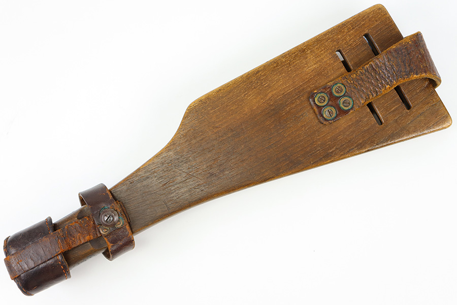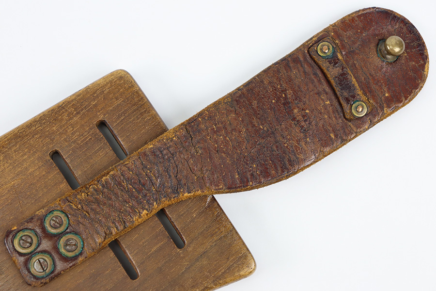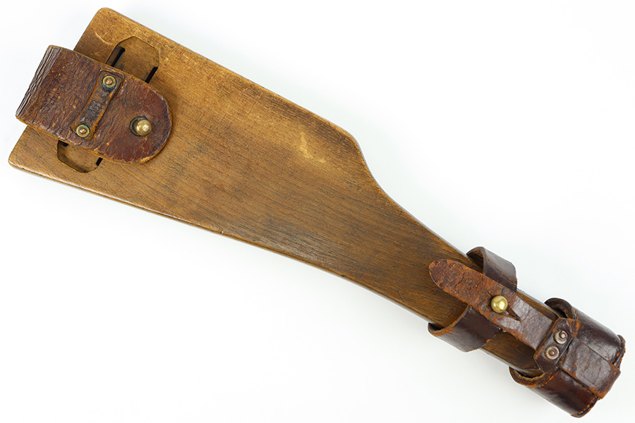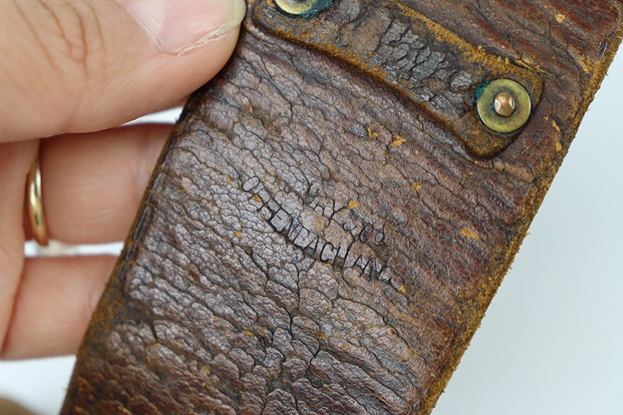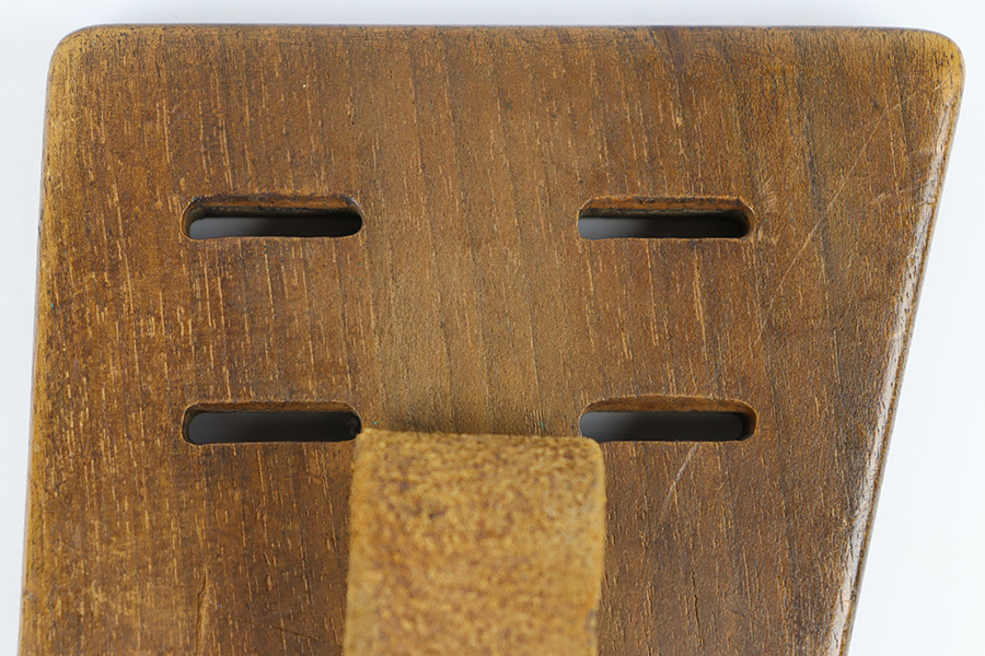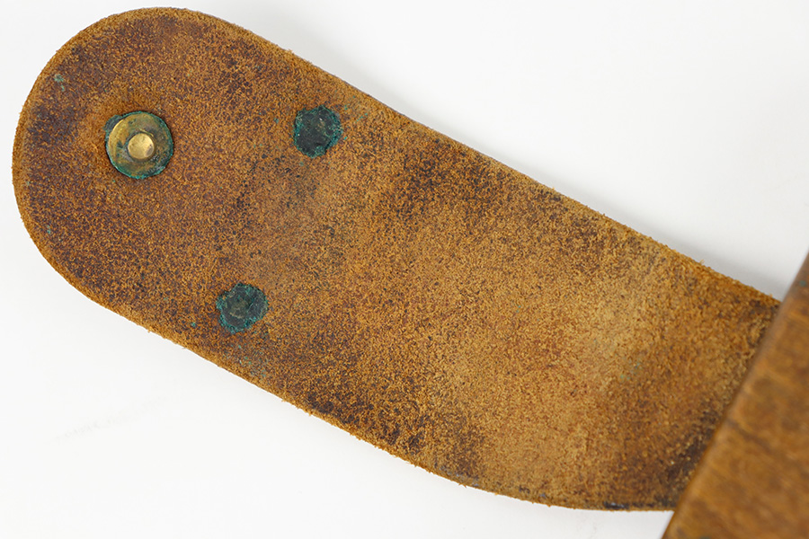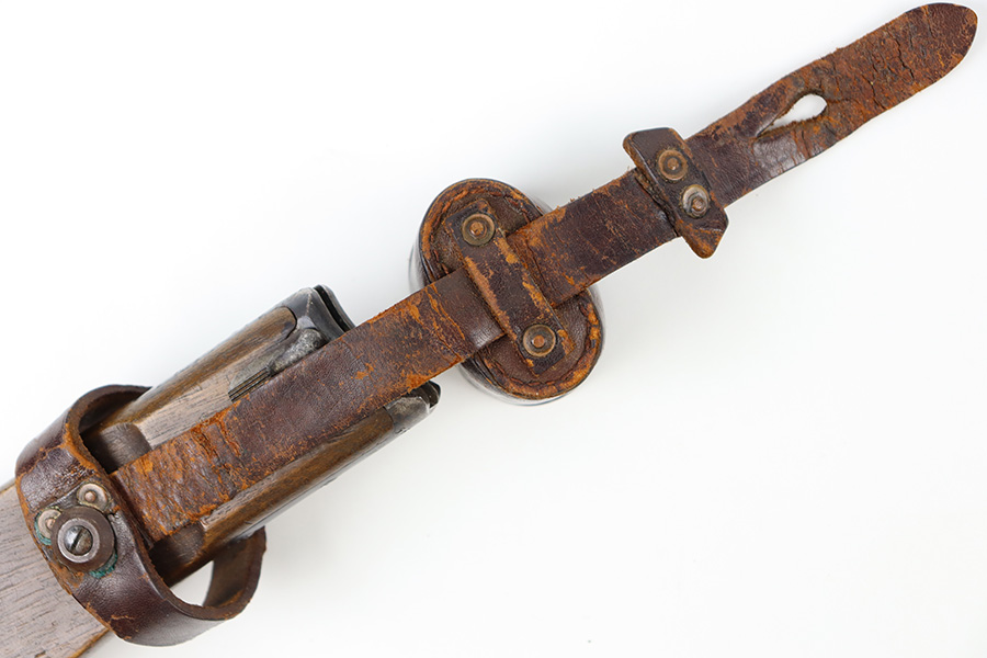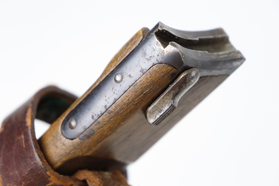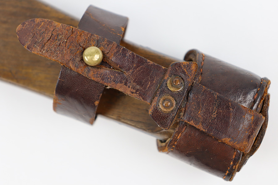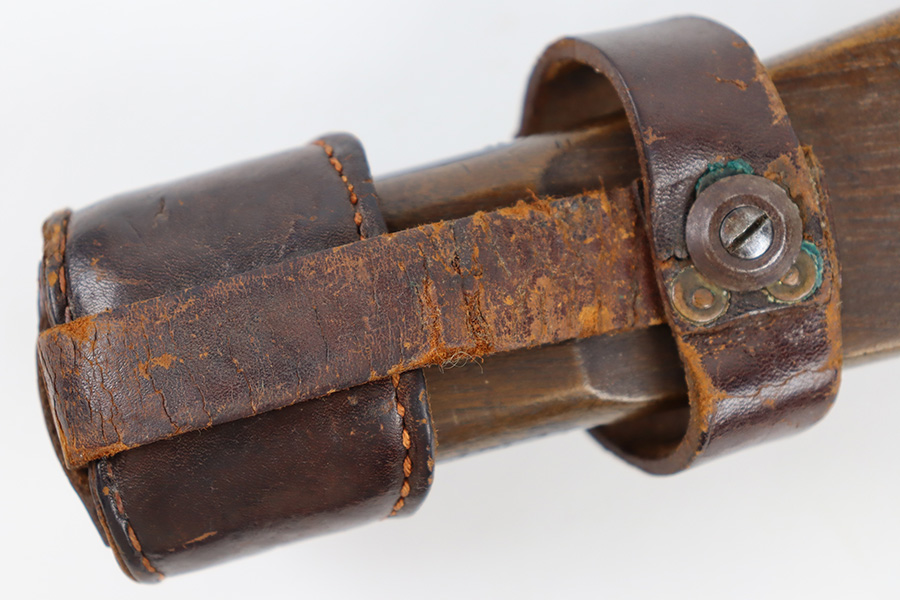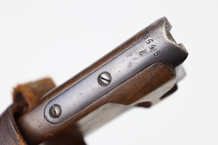 10/23/23 – This is an original WW1 Artillery Luger wood stock with original leather fittings attached. The stock is in great condition with an original Imperial proof stamp on the backside. The wood has no cracks or chips. The metal female attachment end of the stock is serial numbered “5645 L” and most of the original bluing is intact. The leather fittings are in very good overall condition with light surface wear and typical aging throughout. The leather is soft and pliable with wrinkling but no major issues. All original stitching intact as well. The top leather tongue is maker stamped, but the maker is too faint to decipher. Brass closure knobs. A very nice, all original grouping.