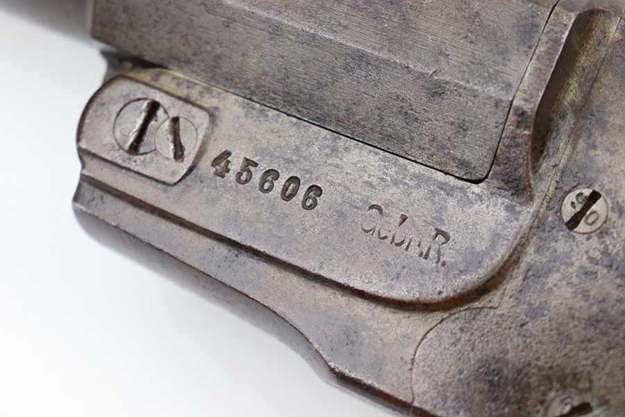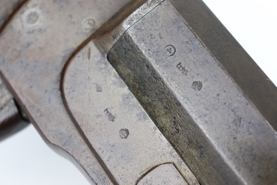 7/27/22 – This is an original WW1 German Hebel M1894 Flare pistol. The pistol is in good overall condition with some honest wear and patina throughout. There’s dark oxidation and discoloration as well as natural patina throughout the metal surfaces. The wood grip is original and in great shape with no notable cracks or chips. Fully functional with smooth action. The bore is not rifled, but has some mild patina and some pitting into the metal. This doesn’t appear to go too deep however, and the pistol should function without issue. The right side of the pistol has imperial proof stamps as shown.