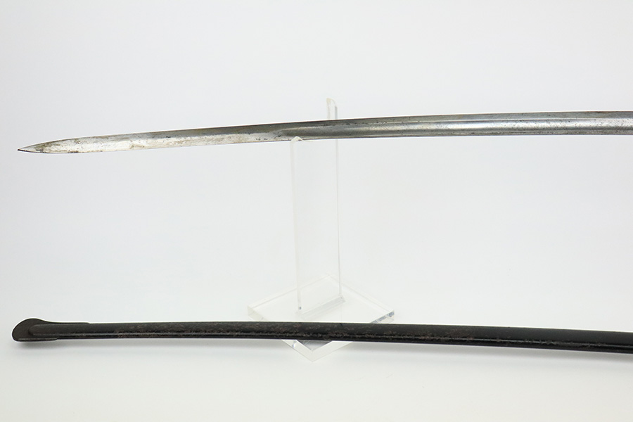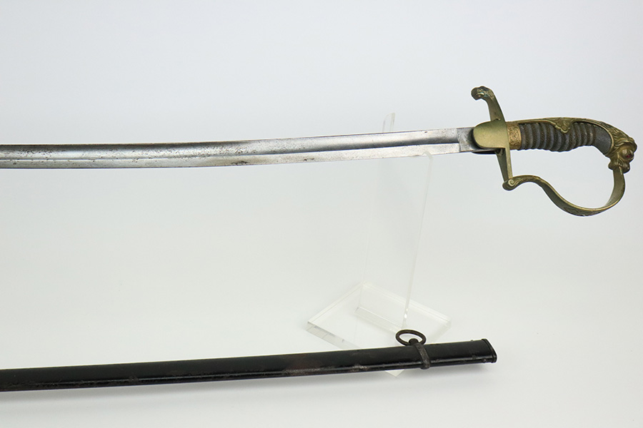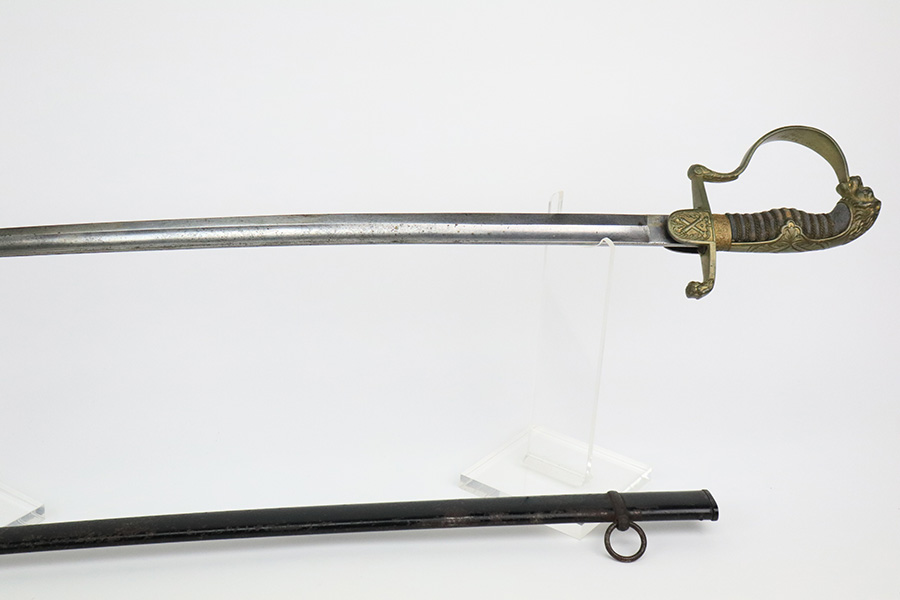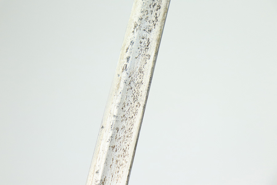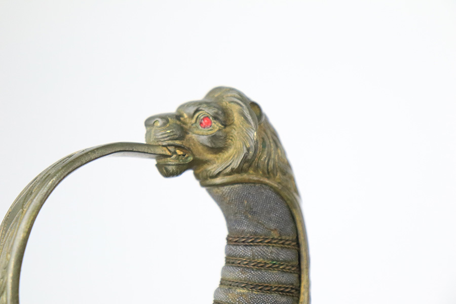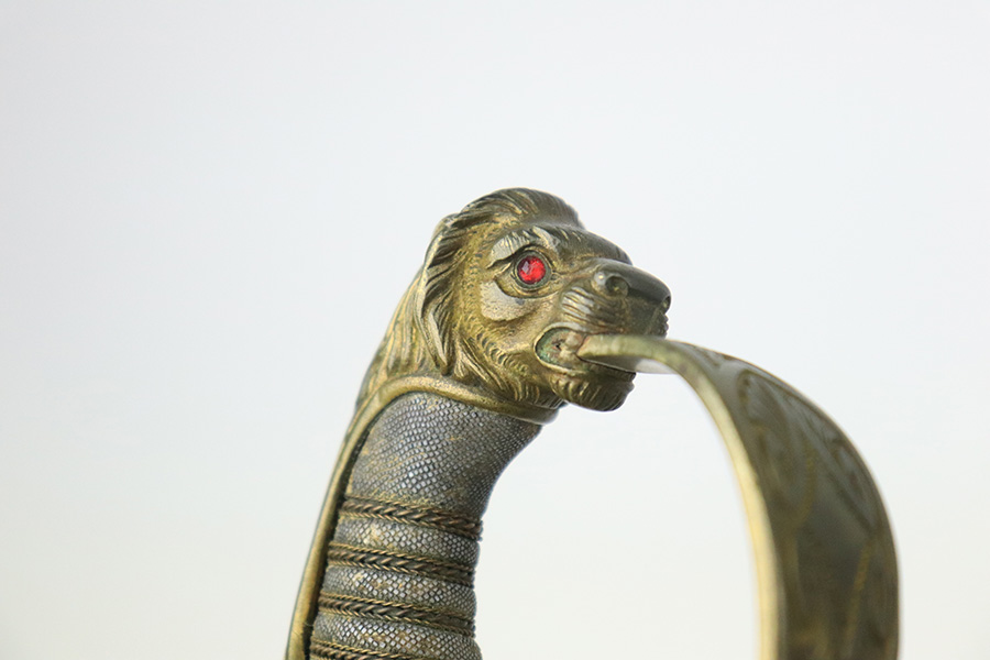 6/17/22 – This is an original WW1 German Officer’s Sword. The sword features a triple etched / engraved blade, and a lion’s head pommel with ruby eyes. The blade has very faint etching on each side as well as the spine. There’s surface patina and discoloration throughout the blade as well as signs of aging and a few small areas of pitting. The edge is unsharpened. The hilt and handle have surface patina throughout but no major issues. The scabbard has some missing paint and rust colored spotty discoloration throughout. No dents.