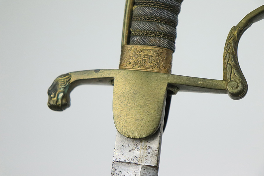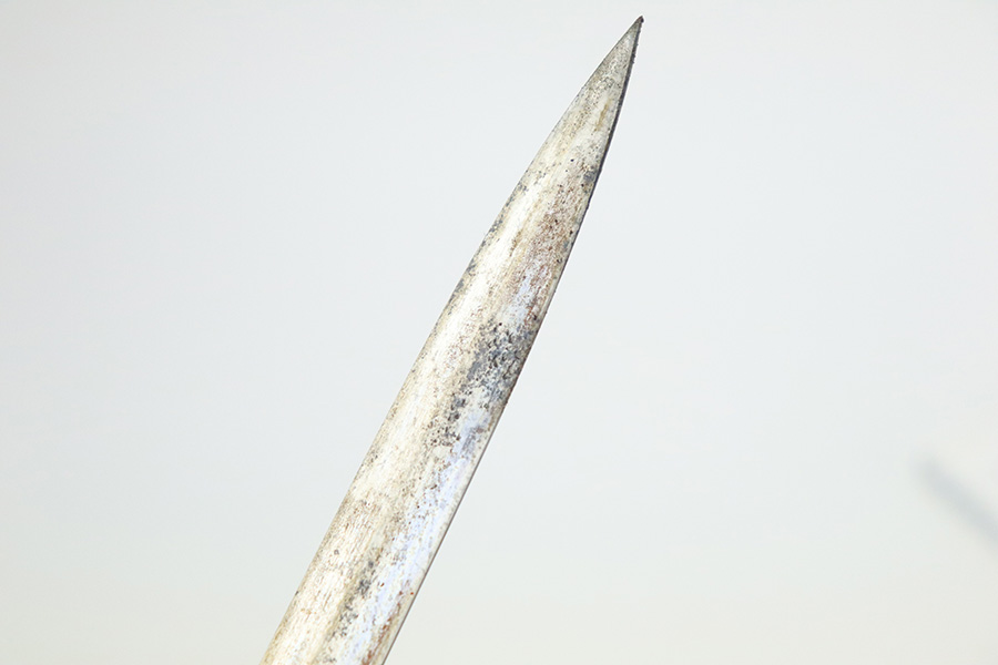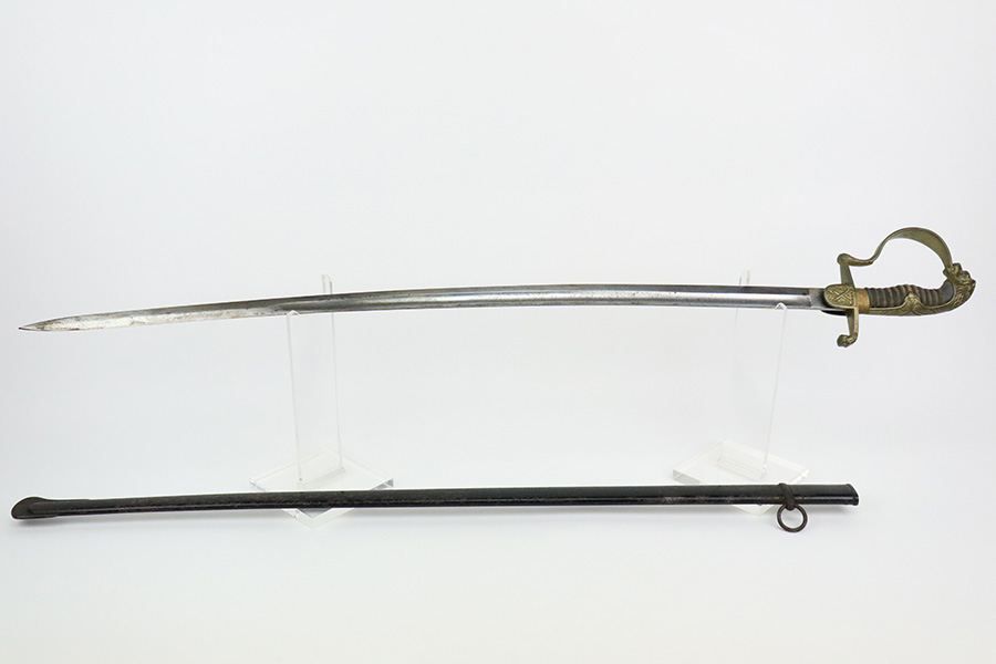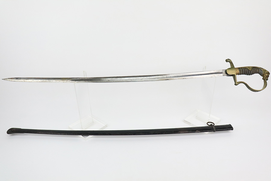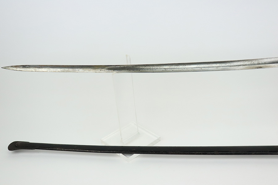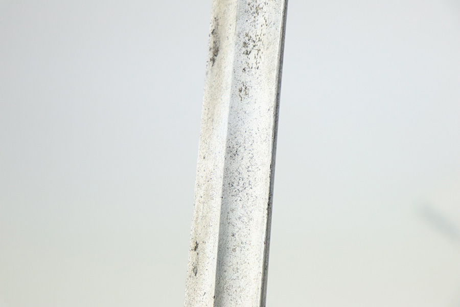 6/17/22 – This is an original WW1 German Officer’s Sword. The sword features a triple etched / engraved blade, and a lion’s head pommel with ruby eyes. The blade has very faint etching on each side as well as the spine. There’s surface patina and discoloration throughout the blade as well as signs of aging and a few small areas of pitting. The edge is unsharpened. The hilt and handle have surface patina throughout but no major issues. The scabbard has some missing paint and rust colored spotty discoloration throughout. No dents.