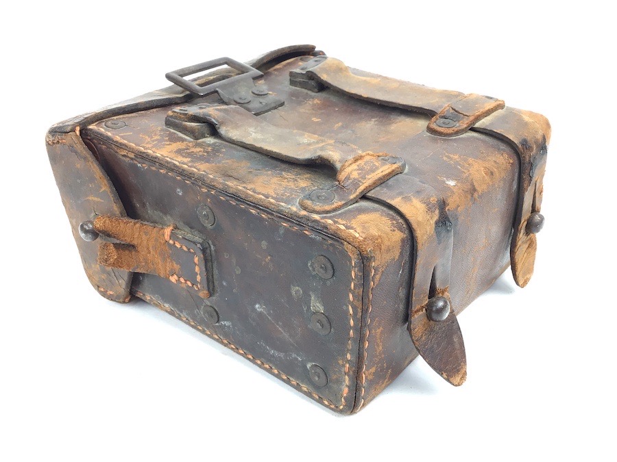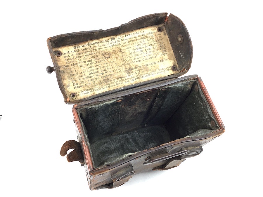1/12/23 – This is a nice pair of German Fernglas 08 bincoulars, nicely marked by C.P. GOERZ of BERLIN. They are marked with serial number Nr 31367 on the hinge tension nut, under the model name. Clear optics with operational focus adjustments on both sides. Small chip in the left eye cup. Honest use wear on the exterior. Includes original leather case, which is marked on the outside: “C.P Goerz Berlin” under the front closure loop. Some loose stitching on the top but it is intact. Some of the leather strap connections are torn. Printed information still attached to the interior lid.