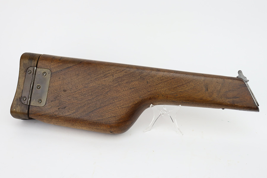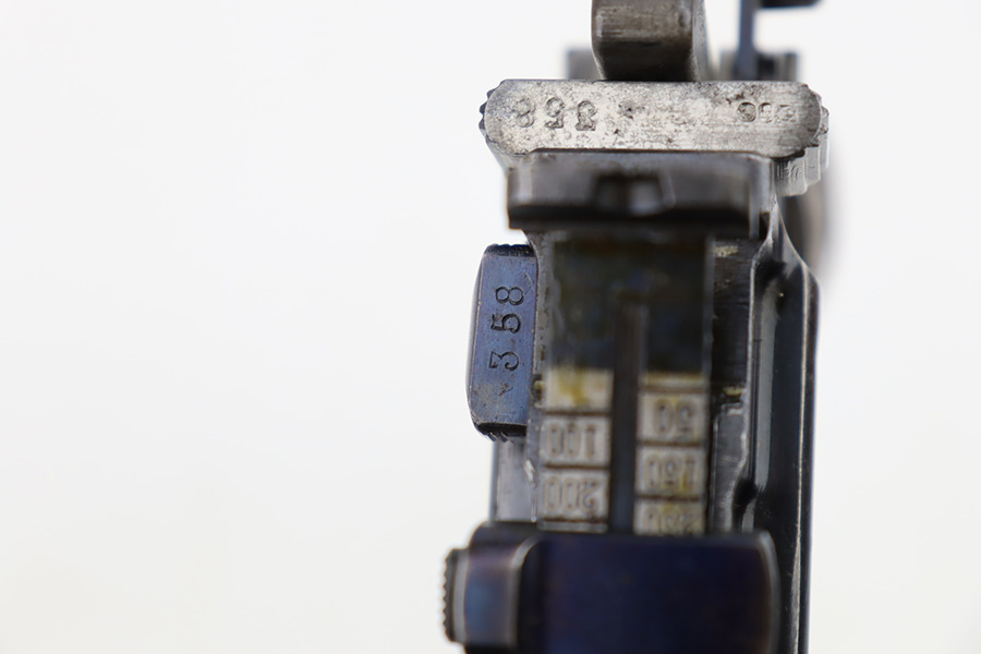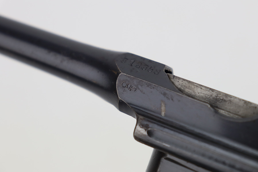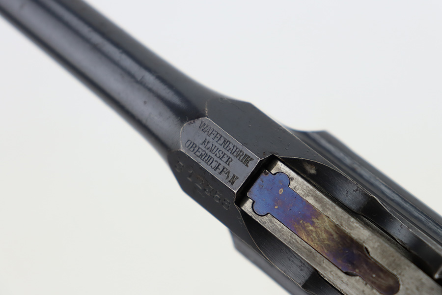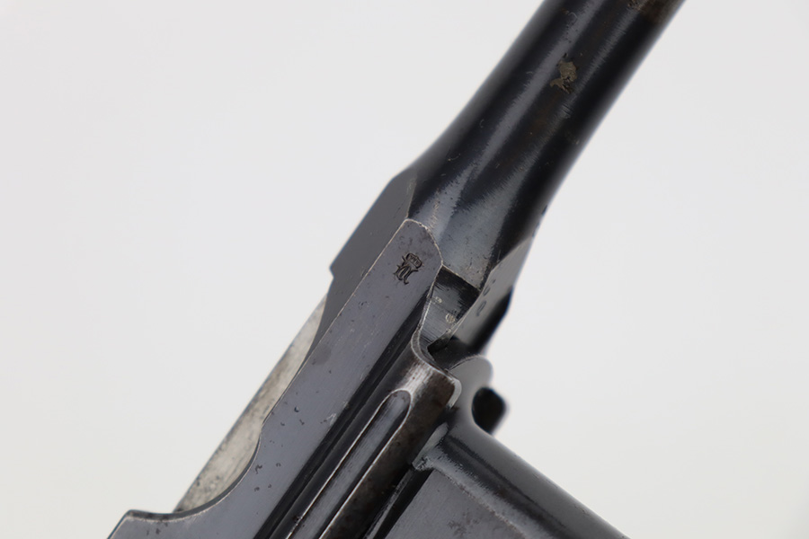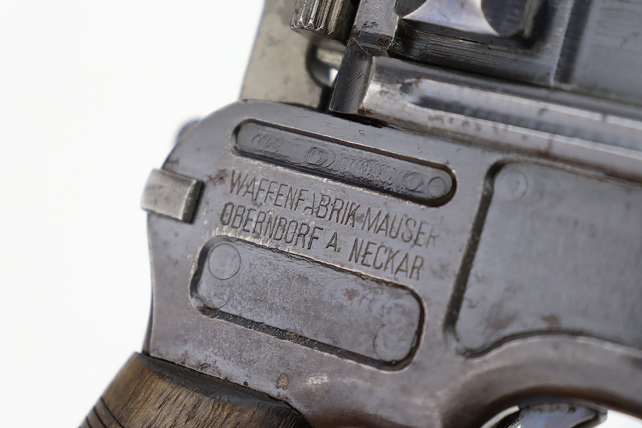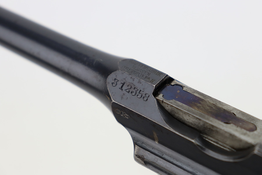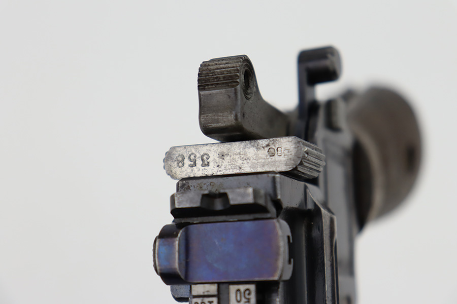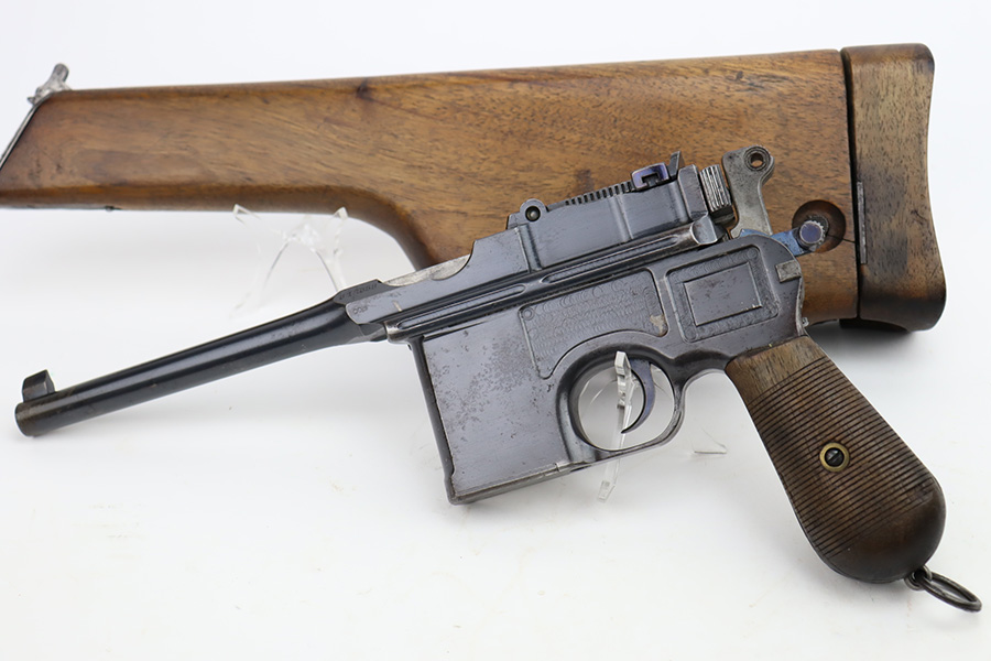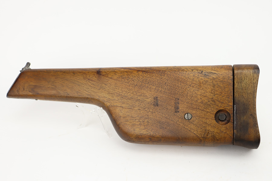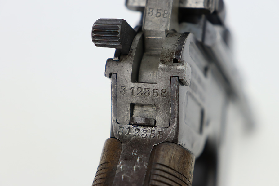 12/4/23 – This is an all matching and original Mauser C96 Broomhandle rig that was issued to the Imperial Army during WW1. Military acceptance proof on right side of receiver. Matching numbers throughout, including the original stock and grips. The bluing on the pistol rates at around 90% overall. There’s high edge wear in several areas but no major areas of bluing loss. There is some oxidation on a few different spots, with minor pitting around the muzzle, on the floorplate and front grip strap. Strong, shiny bore. Excellent grips with no notable defects. The stock has the proper Imperial proof on one side, and a couple of markings on the other side that we can’t discern. Thin surface crack around the push button release.