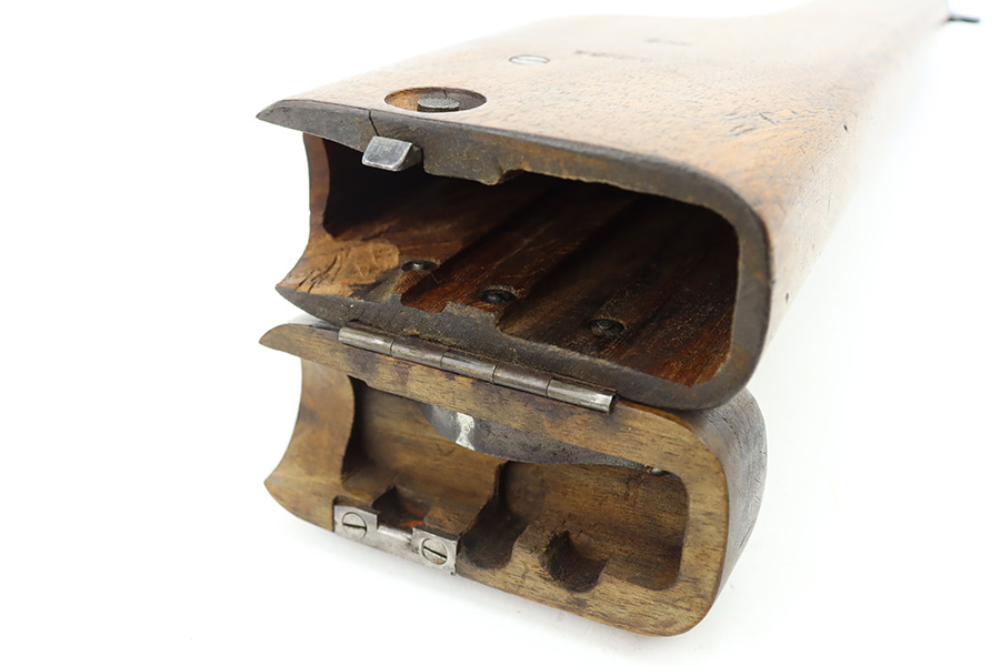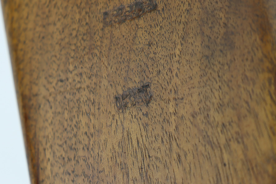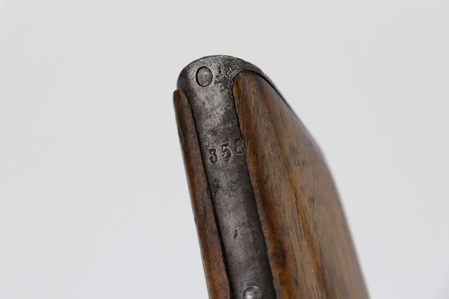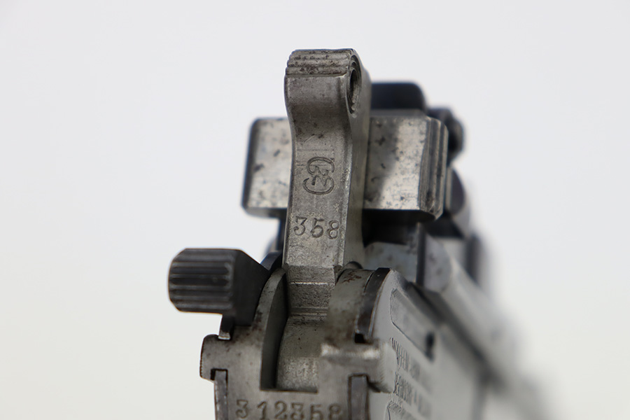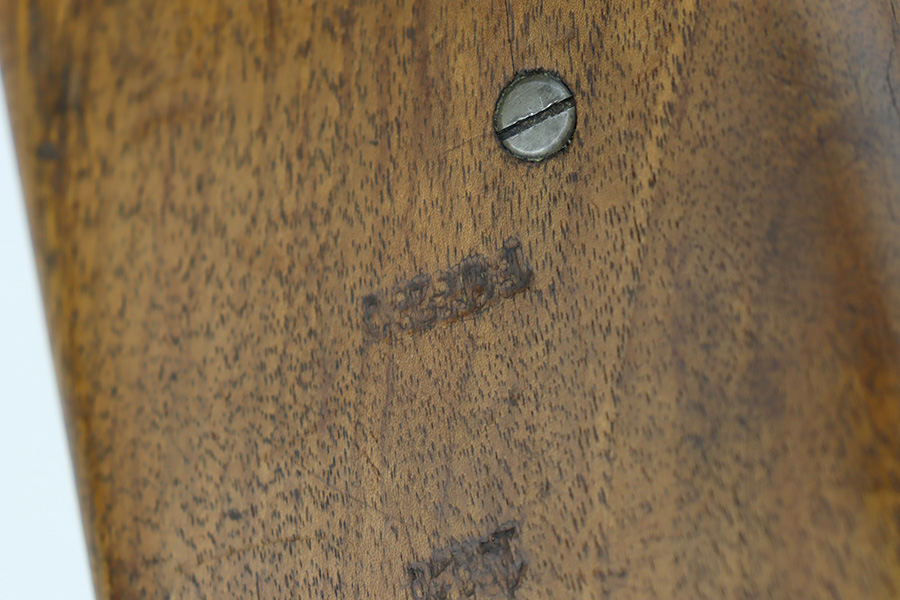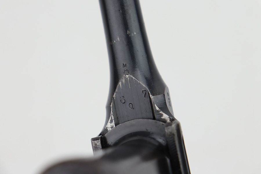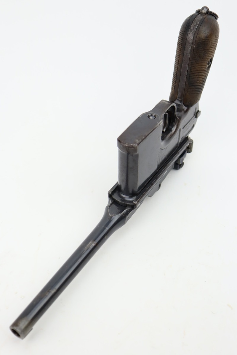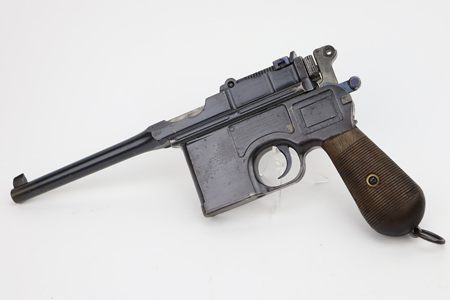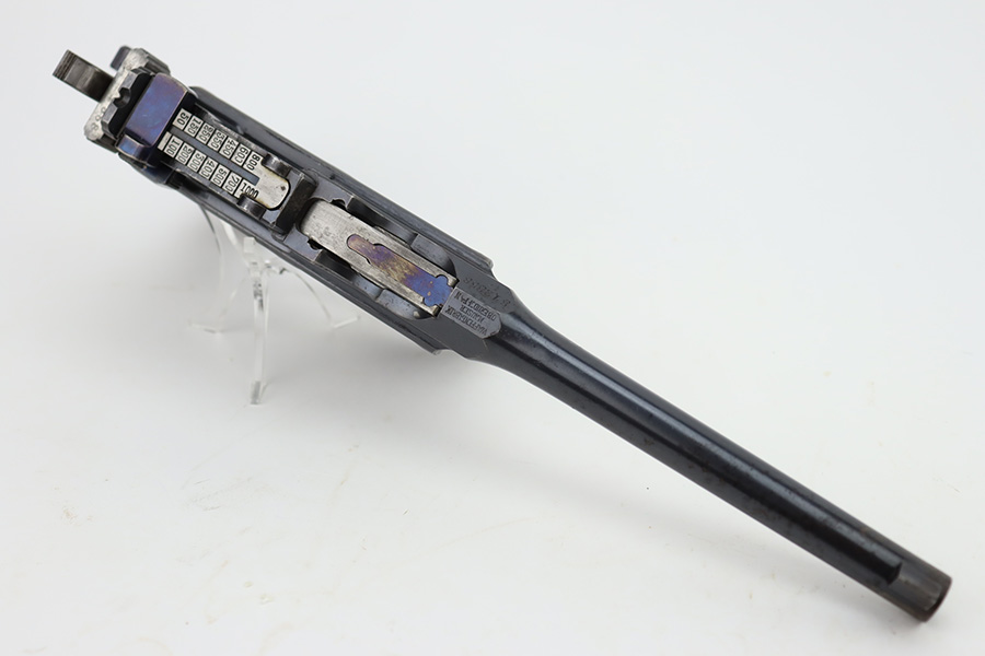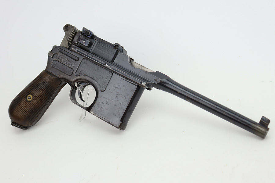 12/4/23 – This is an all matching and original Mauser C96 Broomhandle rig that was issued to the Imperial Army during WW1. Military acceptance proof on right side of receiver. Matching numbers throughout, including the original stock and grips. The bluing on the pistol rates at around 90% overall. There’s high edge wear in several areas but no major areas of bluing loss. There is some oxidation on a few different spots, with minor pitting around the muzzle, on the floorplate and front grip strap. Strong, shiny bore. Excellent grips with no notable defects. The stock has the proper Imperial proof on one side, and a couple of markings on the other side that we can’t discern. Thin surface crack around the push button release.