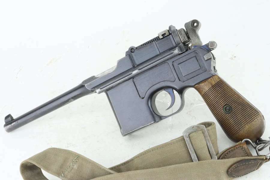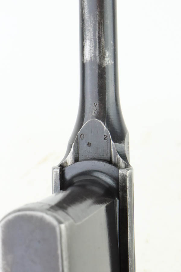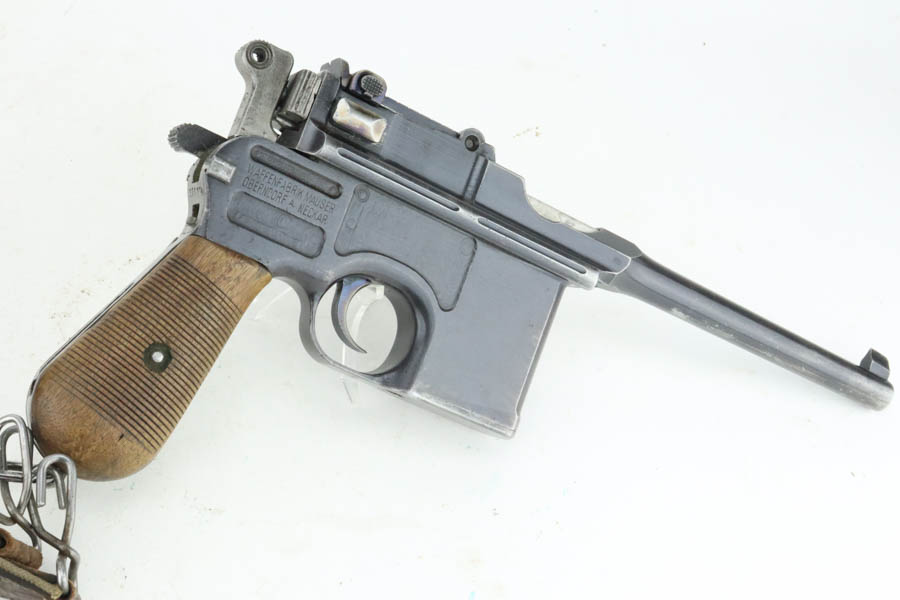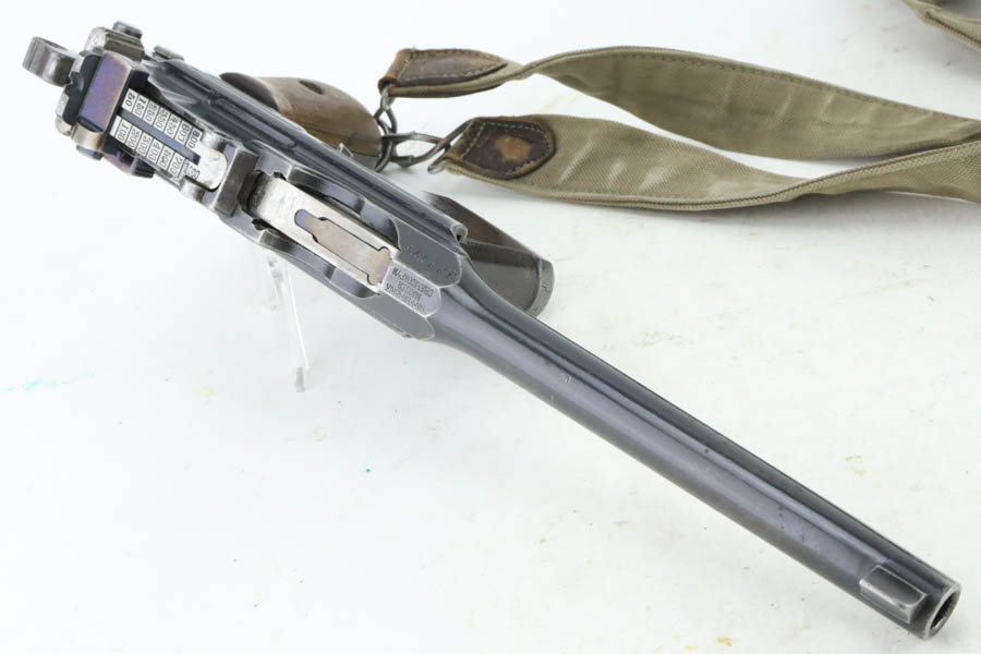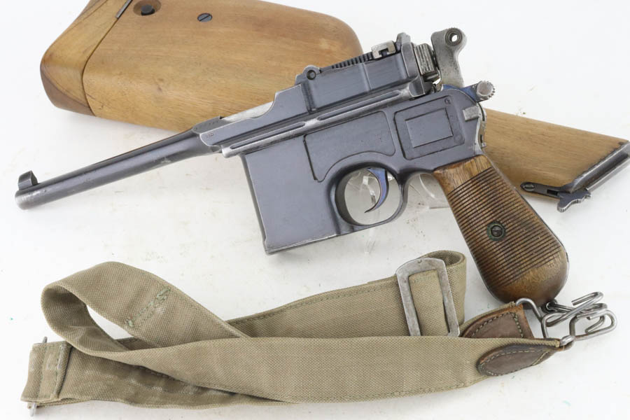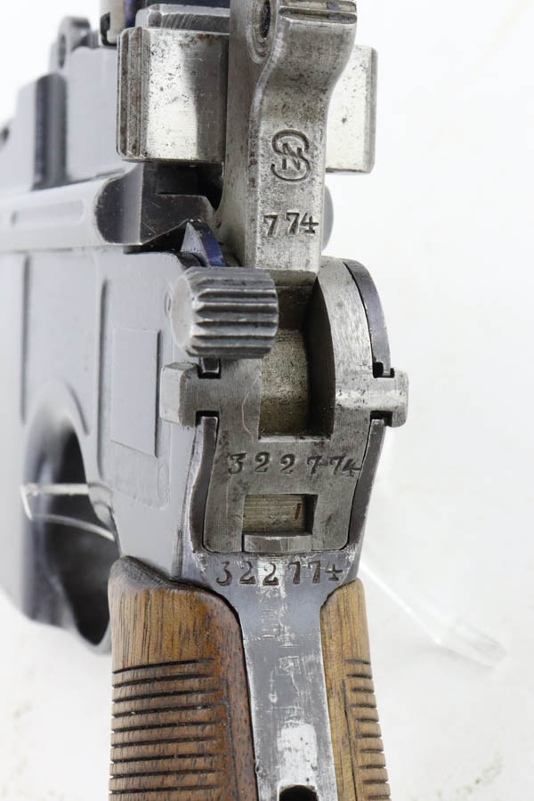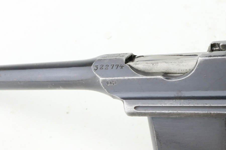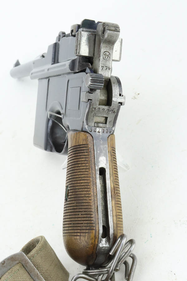 6/3/24 – This is an all matching and original Mauser C96 Broomhandle rig that was issued to the Imperial Army during WW1. Military acceptance proof on right side of receiver. Matching numbers throughout. It comes as a rig with a wood stock/holster and an original lanyard. The metal on the stock appears to be original. The wood may be a high quality reproduction. There is a repaired hairline crack in the lid of the stock. The gun has retained roughly 85% of its original finish with general high edge wear, muzzle wear, and finish on the grip straps. Fitted with excellent matching-numbered wood grips. The bore shows spotty surface oxidation throughout.