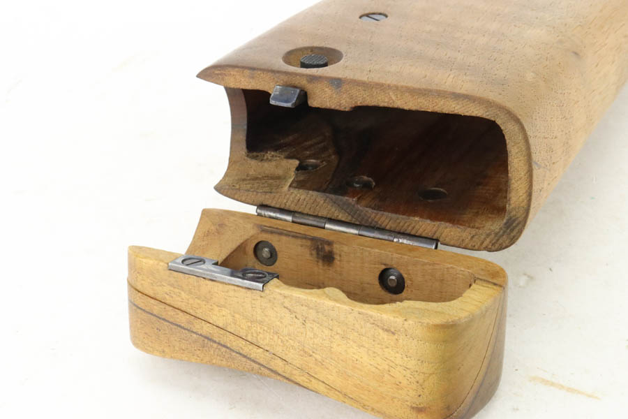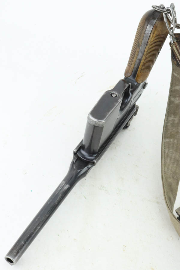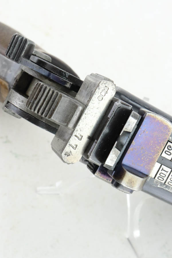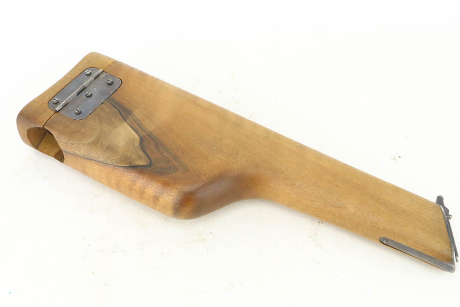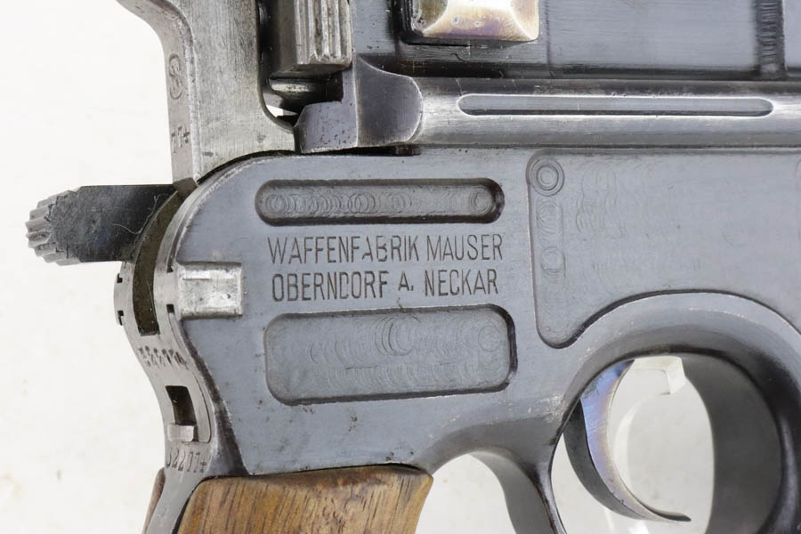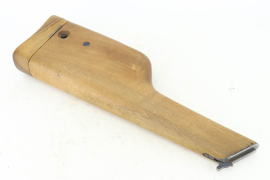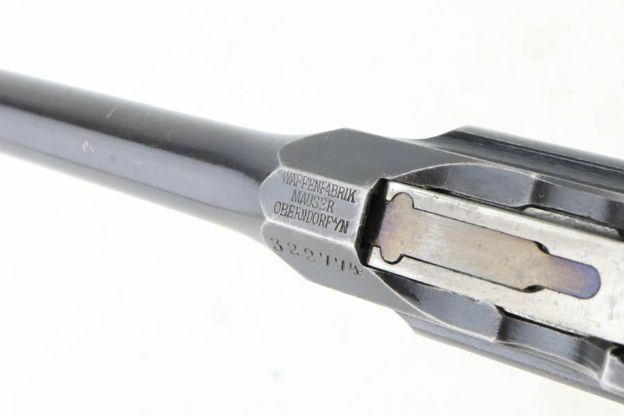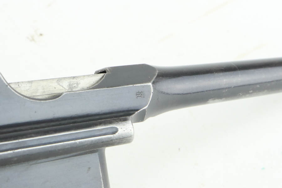 6/3/24 – This is an all matching and original Mauser C96 Broomhandle rig that was issued to the Imperial Army during WW1. Military acceptance proof on right side of receiver. Matching numbers throughout. It comes as a rig with a wood stock/holster and an original lanyard. The metal on the stock appears to be original. The wood may be a high quality reproduction. There is a repaired hairline crack in the lid of the stock. The gun has retained roughly 85% of its original finish with general high edge wear, muzzle wear, and finish on the grip straps. Fitted with excellent matching-numbered wood grips. The bore shows spotty surface oxidation throughout.