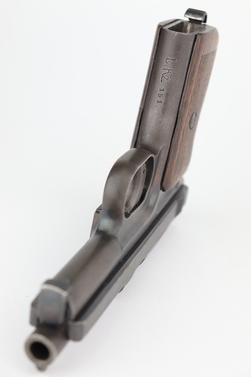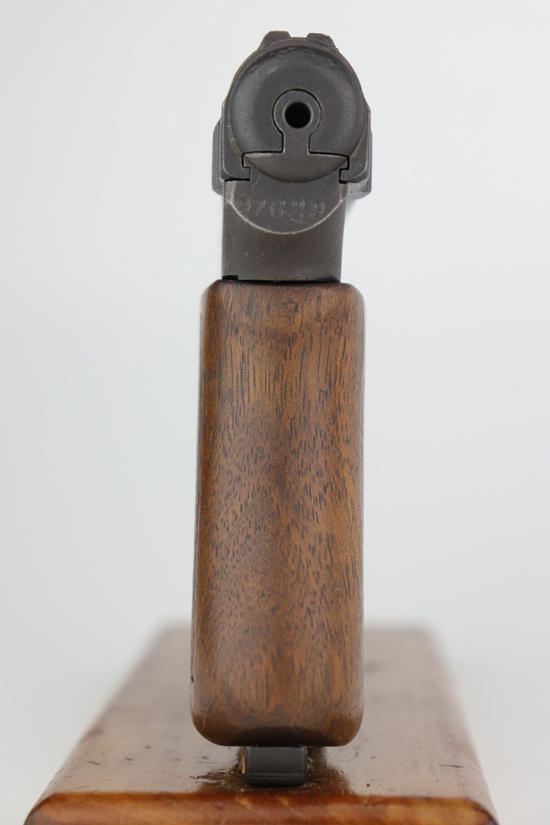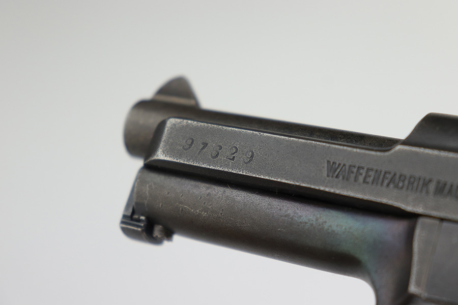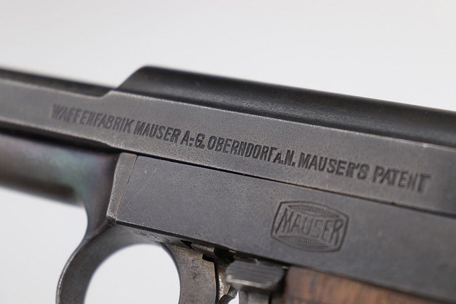 3/21/23 – This is a nice example of a Mauser Model 1914 issued to the Imperial German military during WW1. It is all matching, has an Imperial proof on the top of the slide, and has a military unit marking on the front strap. The entire gun has been refinished with a dull, almost parkerized finish. Very little finish loss. Nice period-correct wood grip. Comes with one proper magazine. The rifling in the bore is worn with pin-pricking throughout.