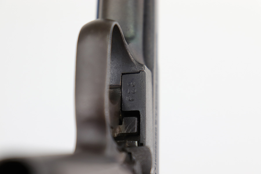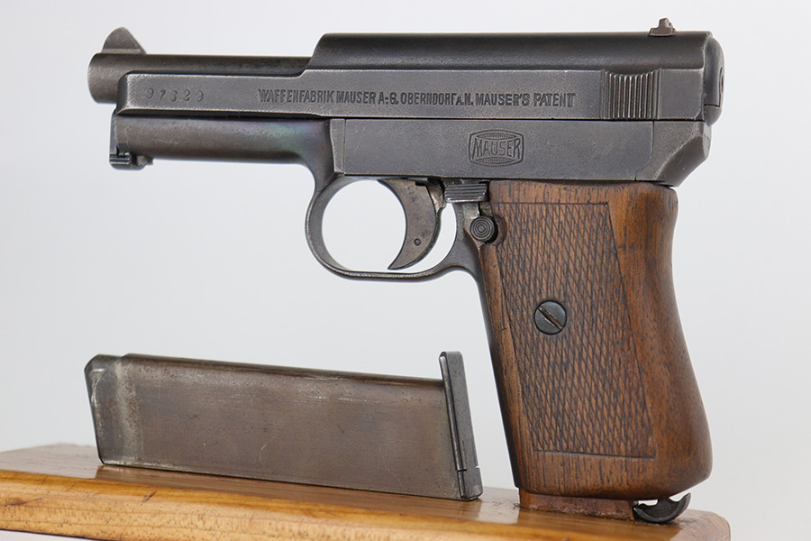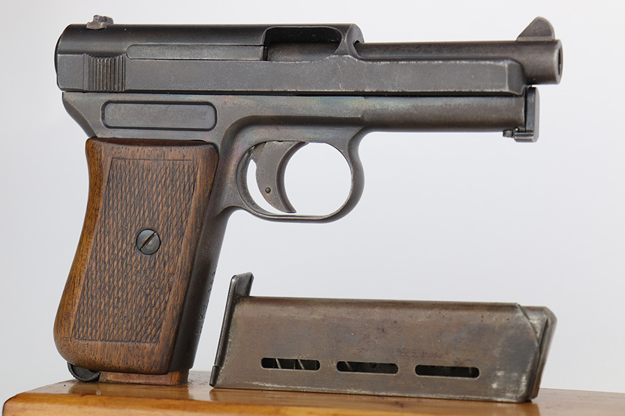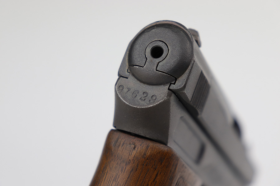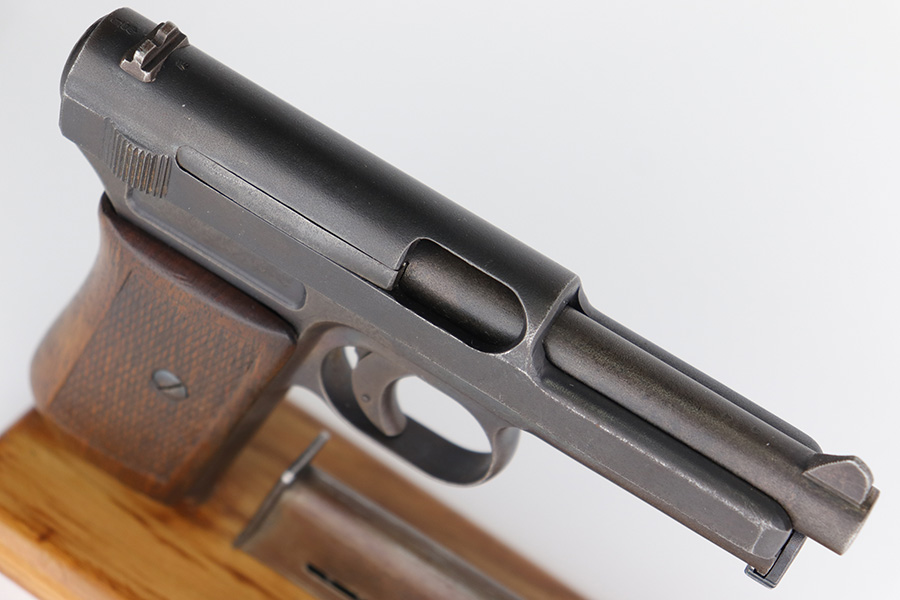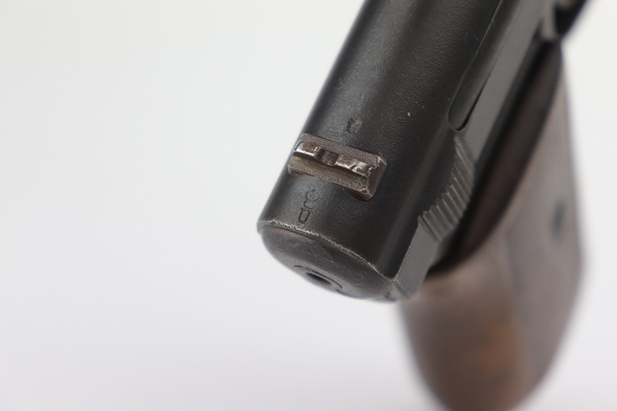 3/21/23 – This is a nice example of a Mauser Model 1914 issued to the Imperial German military during WW1. It is all matching, has an Imperial proof on the top of the slide, and has a military unit marking on the front strap. The entire gun has been refinished with a dull, almost parkerized finish. Very little finish loss. Nice period-correct wood grip. Comes with one proper magazine. The rifling in the bore is worn with pin-pricking throughout.