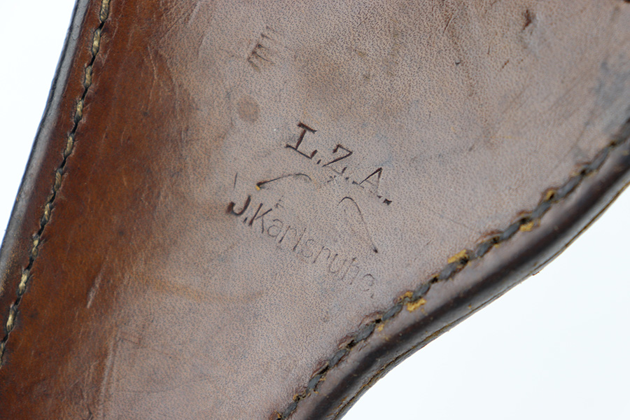 11/29/22 – This is a rare variation WW1 Imperial Navy Luger holster. The holster is stamped on the back and interior leather with “LZA” distributor stamps. These are commonly found on WW1 production pieces as LZA was the inspector for quality leather goods during WW1. This holster has very nice leather that shows some honest wear and aging throughout the front and top leather. There’s surface wrinkling and some mild cracking, but none of the cracking goes deep into the leather. The back leather is fairly clean. Normal pliability overall. The black stitching is tight and intact throughout the holster. The cleaning rod side pouch is in great condition.