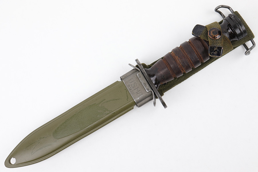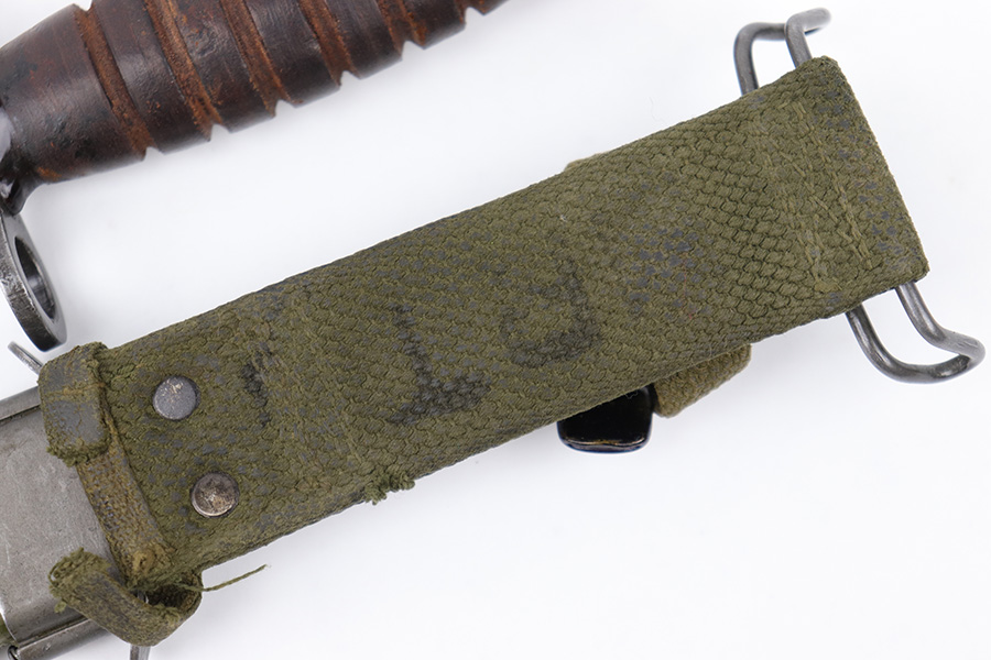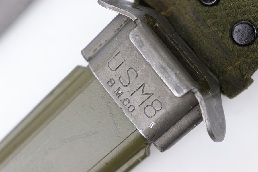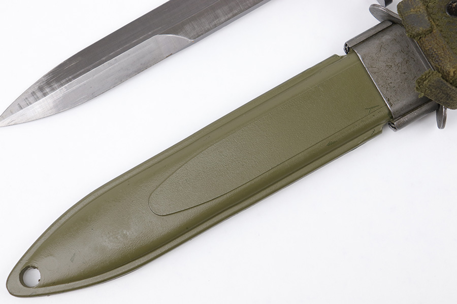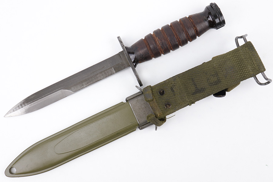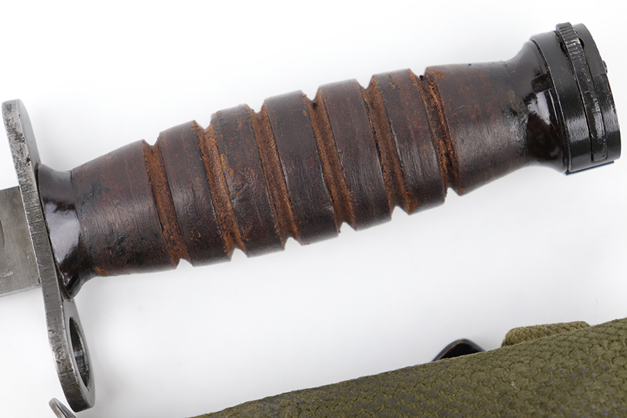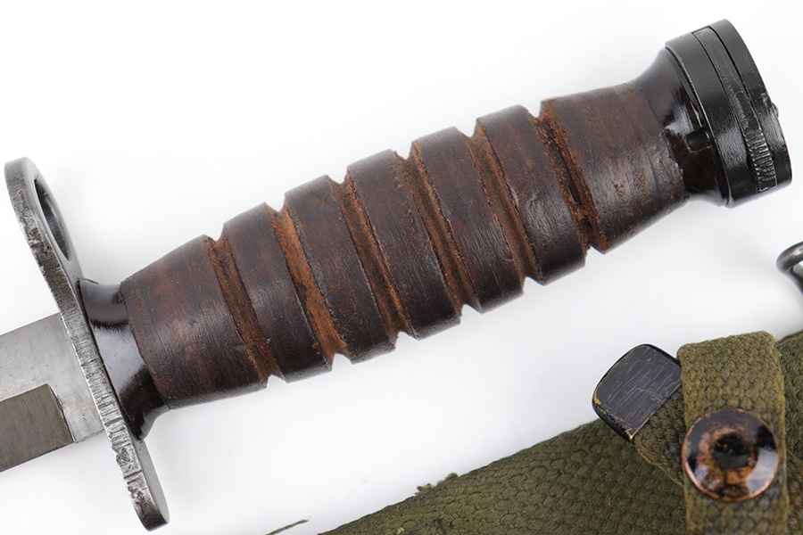 4/4/23 – This is an original late WW2 production Imperial US M4 bayonet for a M1 Carbine rifle. The bayonet features dark brown plastic spacers on the handle, and a fairly clean blade that retains most of the original finish. The majority of finish loss is near the tip, and the edge is unsharpened. The crossguard is maker stamped and ordnance stamped. There’s similar light surface wear on the crossguard and pommel, but no major issues. Excellent leather grip. Comes with a US M8 scabbard with canvas frog that’s in great overall condition.
