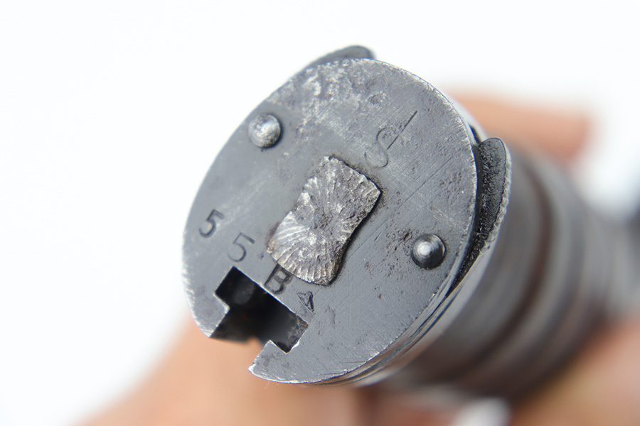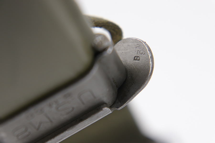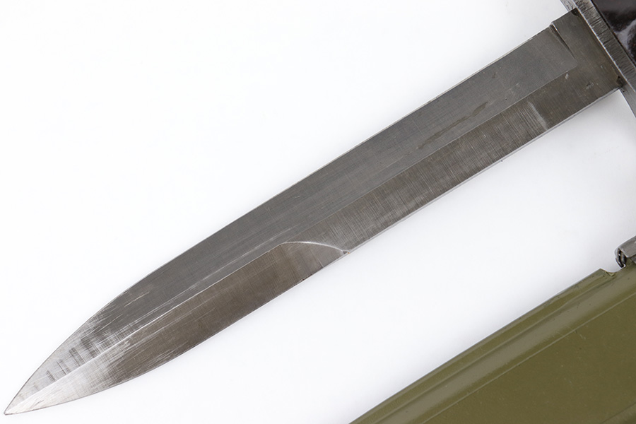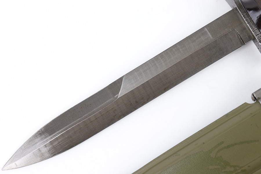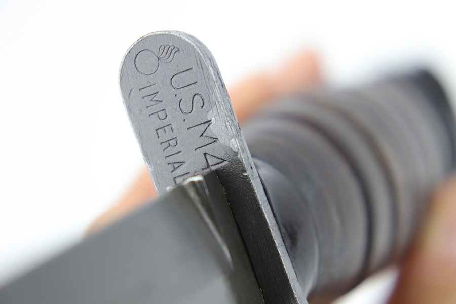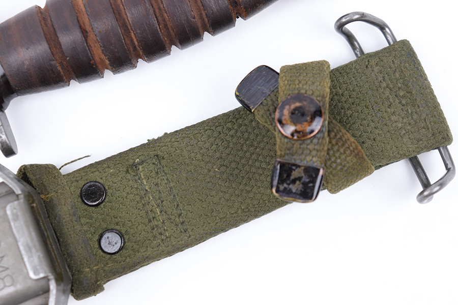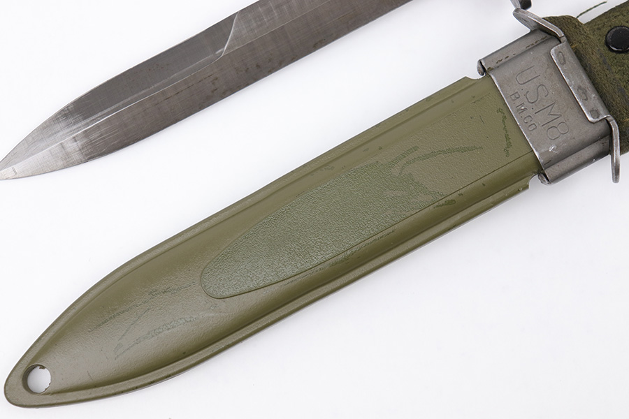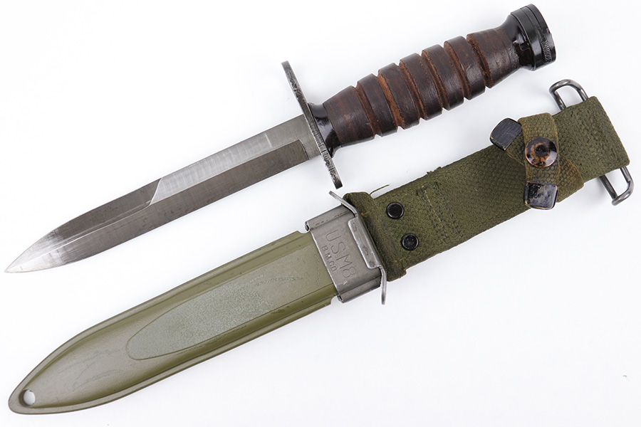 4/4/23 – This is an original late WW2 production Imperial US M4 bayonet for a M1 Carbine rifle. The bayonet features dark brown plastic spacers on the handle, and a fairly clean blade that retains most of the original finish. The majority of finish loss is near the tip, and the edge is unsharpened. The crossguard is maker stamped and ordnance stamped. There’s similar light surface wear on the crossguard and pommel, but no major issues. Excellent leather grip. Comes with a US M8 scabbard with canvas frog that’s in great overall condition.