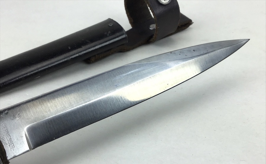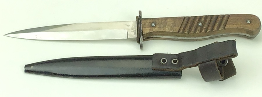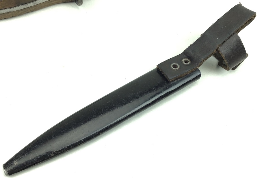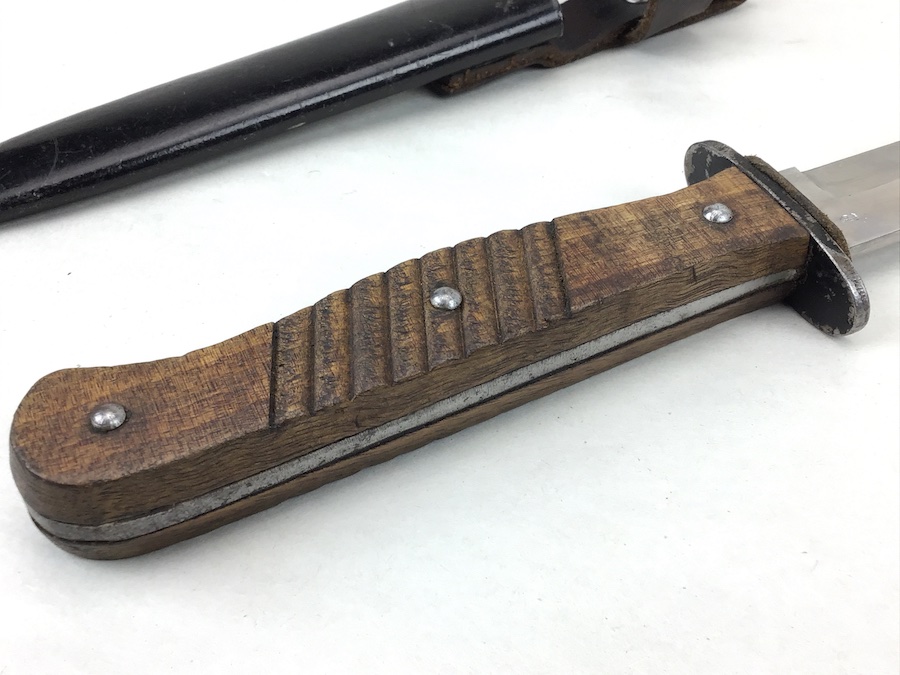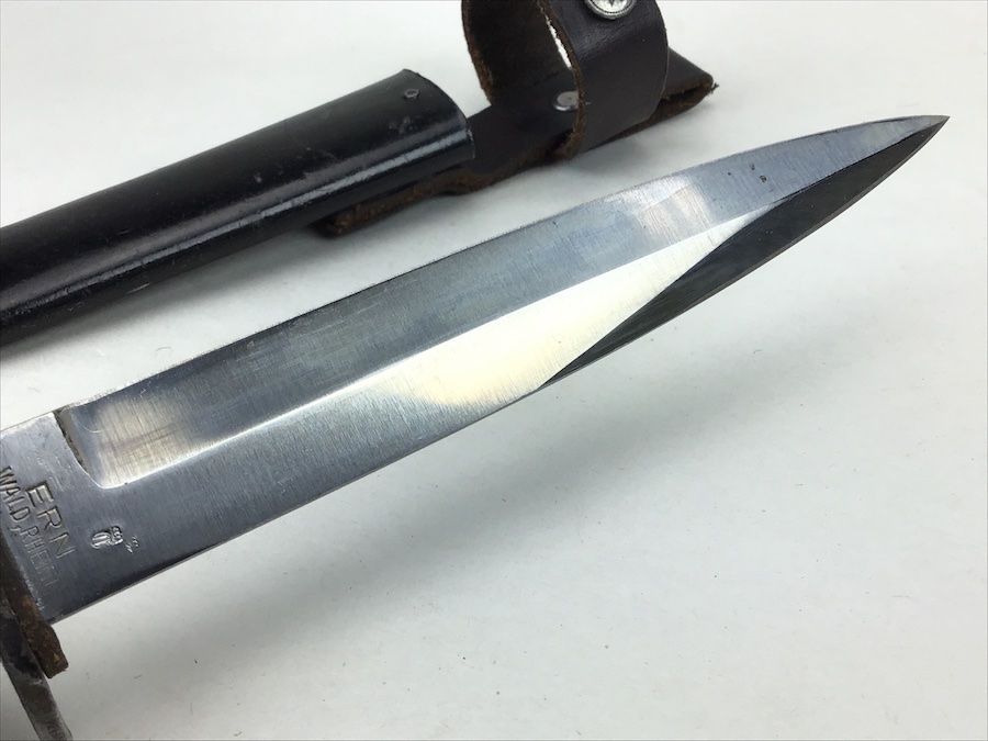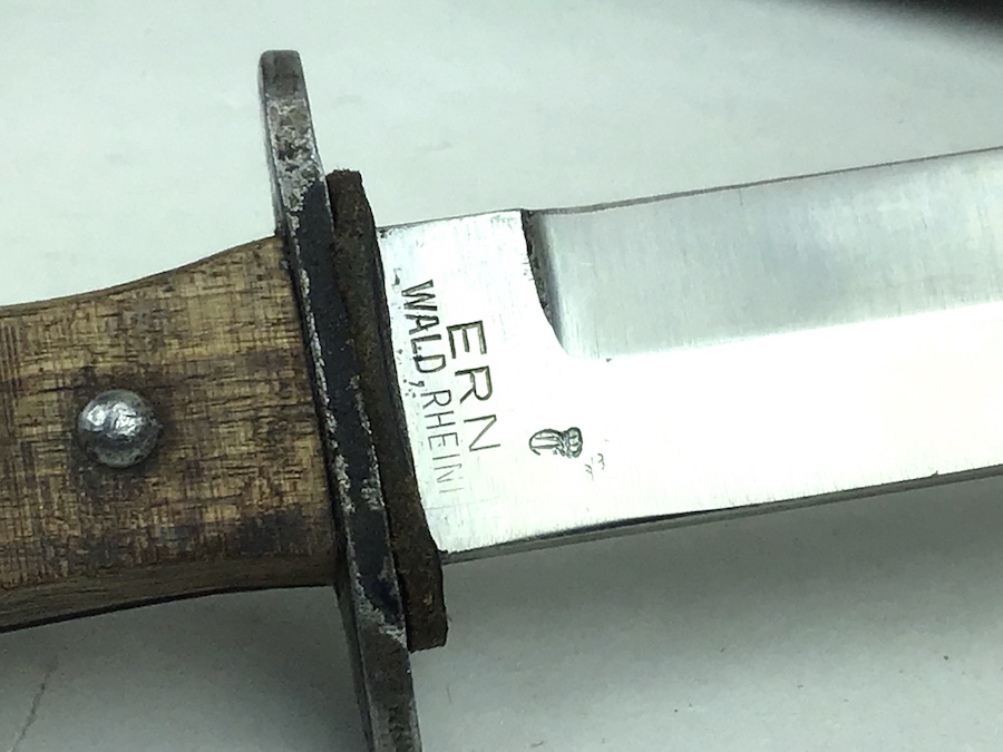 1/20/20 – This is an early German Ern Imperial Fighting / Boot Knife. This blade is an excellent example with no sharpening or abuse. Hilt is stamped “RASIERMESSER-FABRIK” and the Reverse “ERN WALD.RHEINL.” Proofed with a king’s head under a crown. Oak grip plates are in minty condition with very little use wear. Blade is in excellent condition. It retains it’s original shape and edge with no evidence of sharpening. Slight bend in the tip, but not very noticeable. Scabbard is black with a nice finish. Leather strap is in great shape with a functional snap. Measures 11-3/8″ long in scabbard. Knife measurements are a little over 10-3/4″ long. Blade is 5-3/4″ long