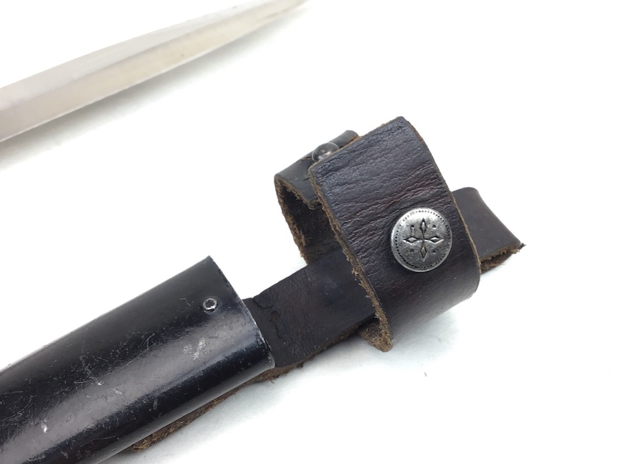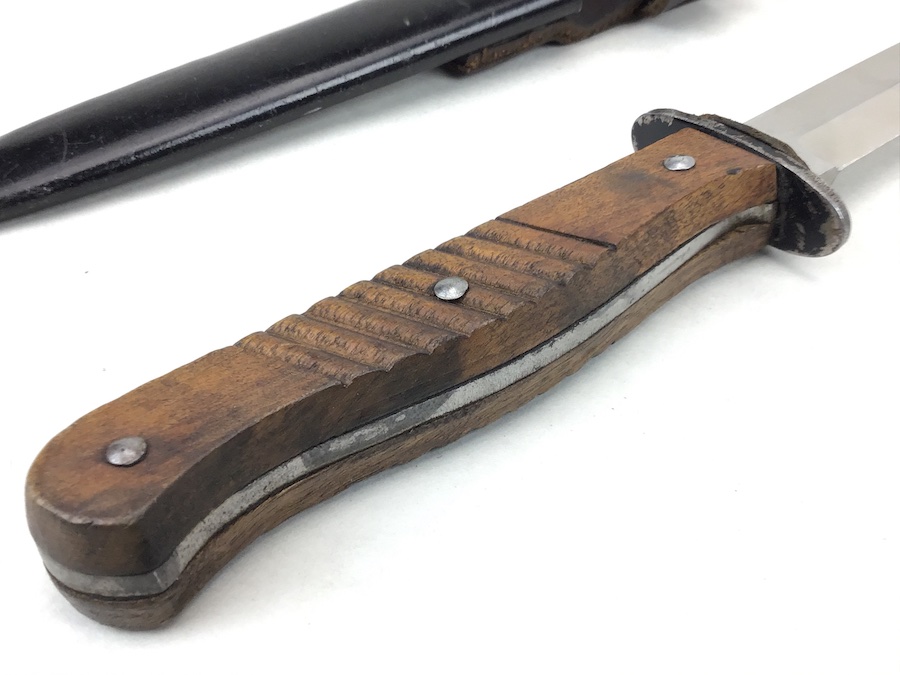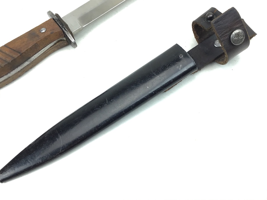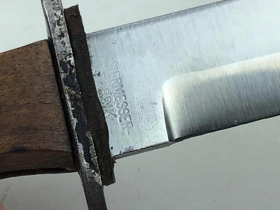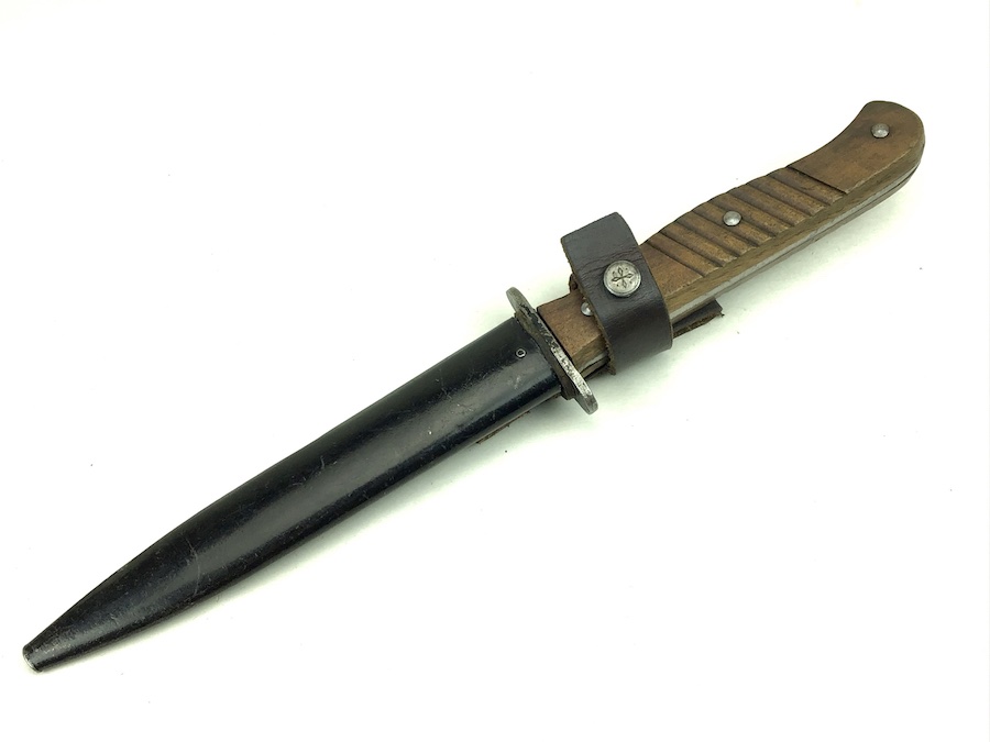 1/20/20 – This is an early German Ern Imperial Fighting / Boot Knife. This blade is an excellent example with no sharpening or abuse. Hilt is stamped “RASIERMESSER-FABRIK” and the Reverse “ERN WALD.RHEINL.” Proofed with a king’s head under a crown. Oak grip plates are in minty condition with very little use wear. Blade is in excellent condition. It retains it’s original shape and edge with no evidence of sharpening. Slight bend in the tip, but not very noticeable. Scabbard is black with a nice finish. Leather strap is in great shape with a functional snap. Measures 11-3/8″ long in scabbard. Knife measurements are a little over 10-3/4″ long. Blade is 5-3/4″ long