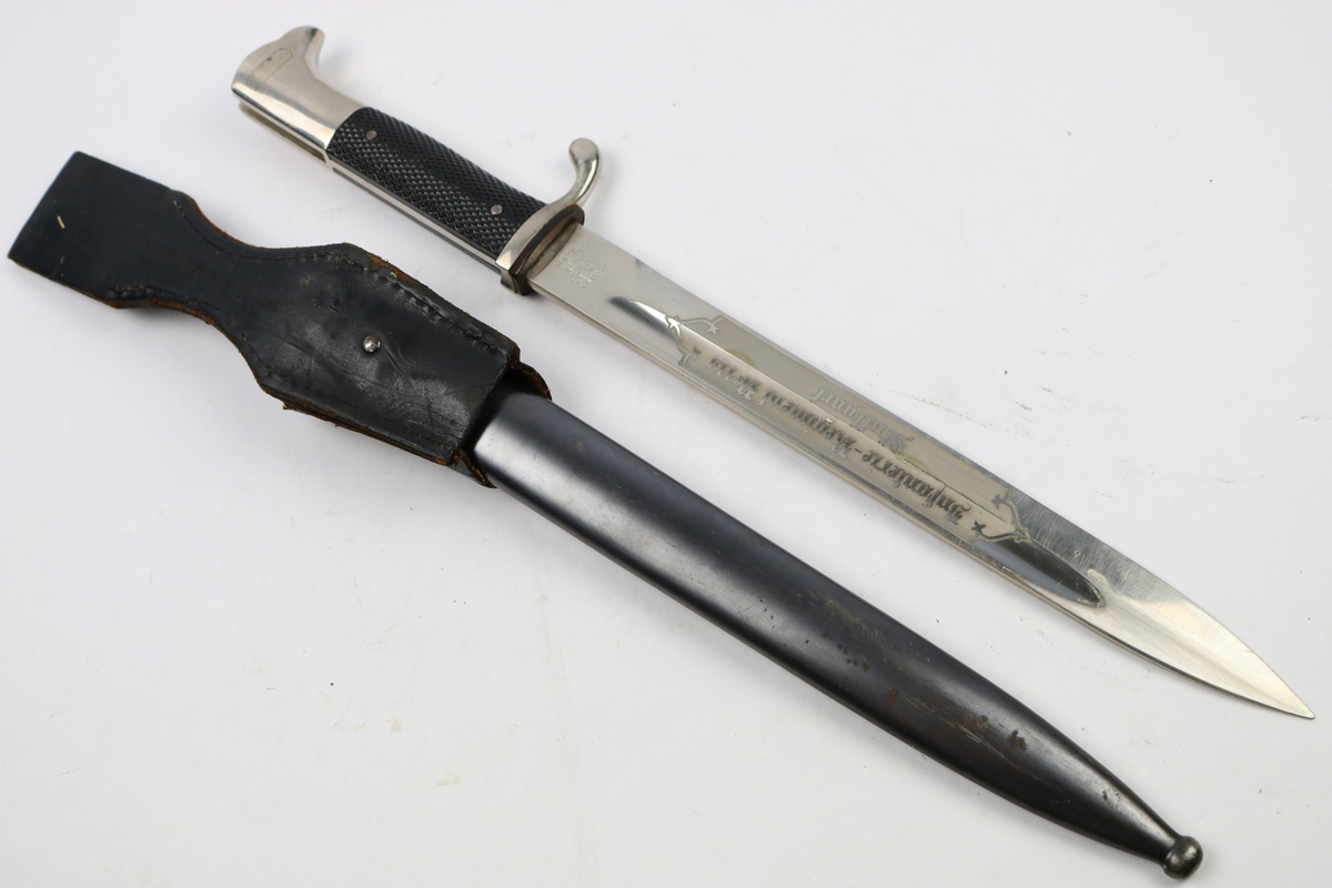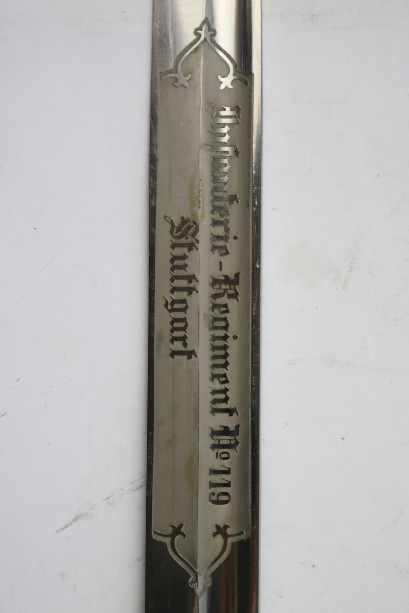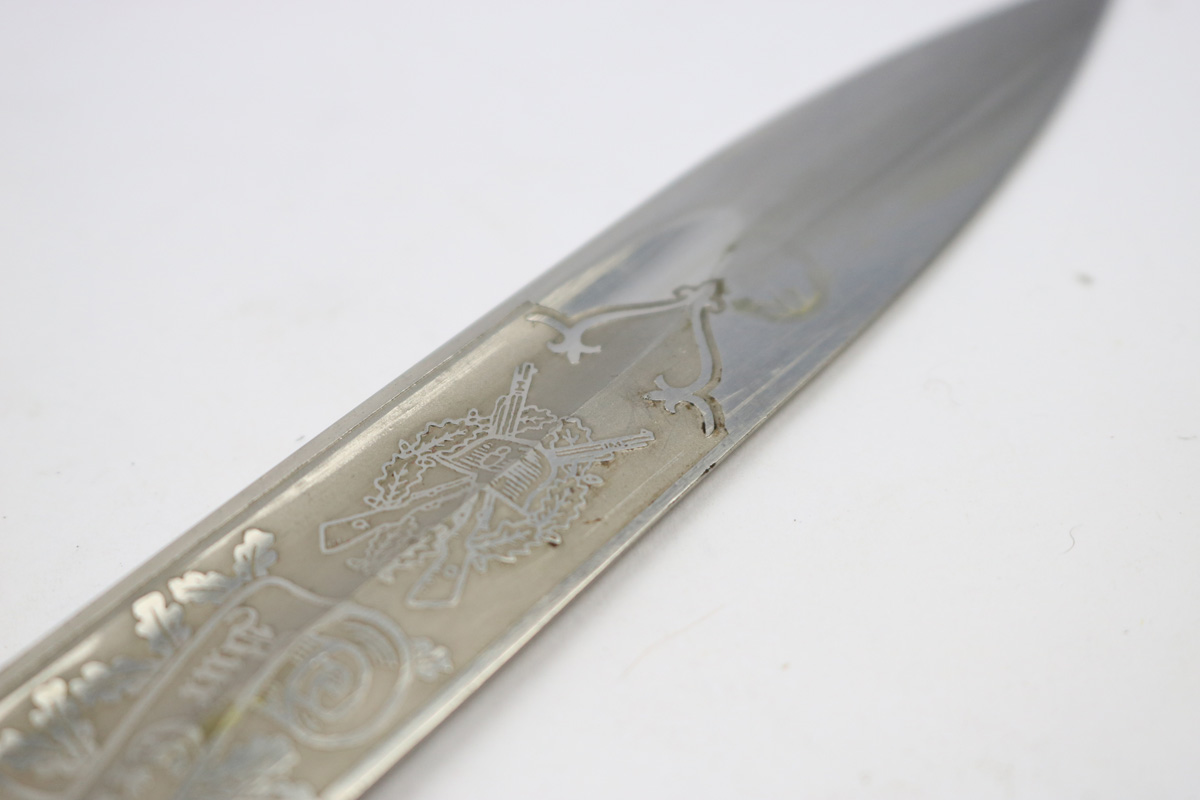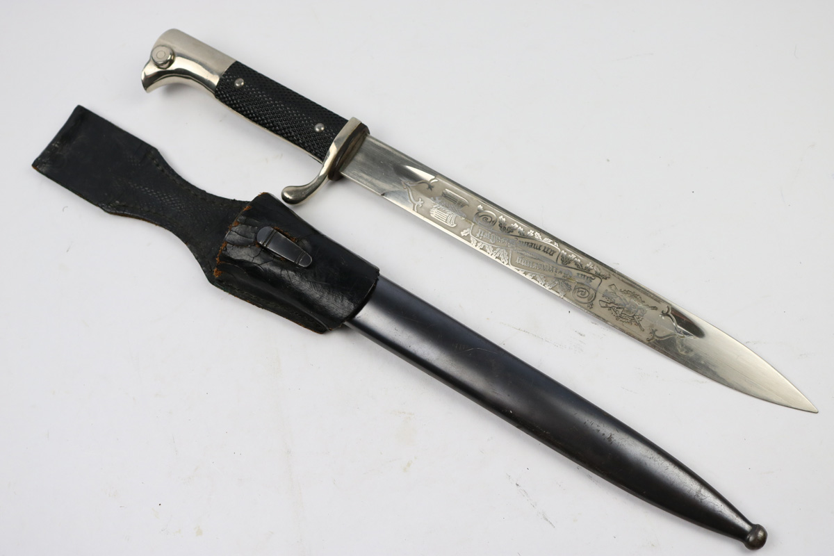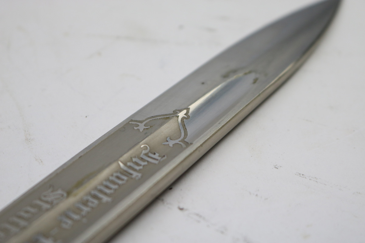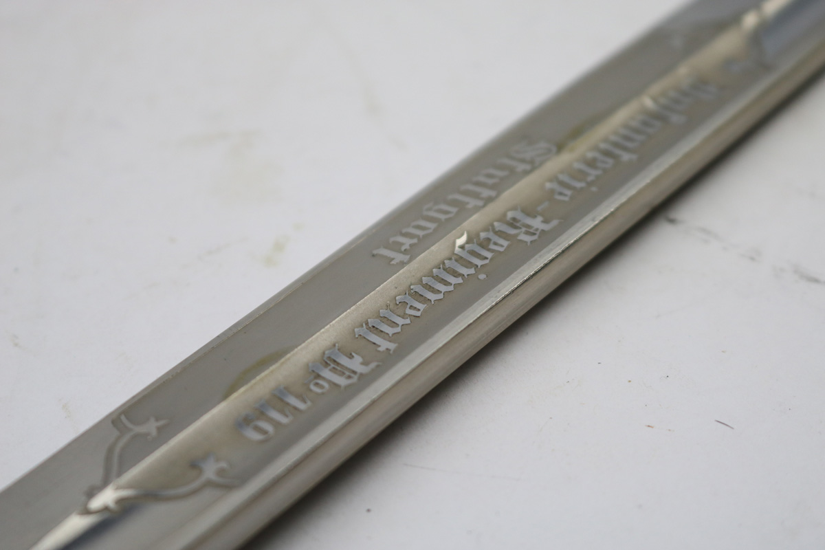 7/6/18 – This is an original etched/engraved German rifle bayonet. The blade is 7.5 inches long and in excellent, near mint condition. The blade is engraved with an inscription on each side. The inscription roughly translates to “In memory of my time in service” on one side. The Gothic German looks like “Zur Erinnerung an meine Dienstzeit…” . The reverse side is engraved for the infantry regiment number 119 out of Stuttgart. Made by Eickhorn. A very cool piece of history. The other engraved blades like this that we’ve owned are only engraved on one side, so this is pretty special. The regiment number 119 must have done something special or could afford to have this extra engraving. Guaranteed original. There’s some light surface wear, but this is normal scabbard and use wear. No signs of “field use” or sharpening. The handle is excellent as in the scabbard. The leather frog has some surface cracking and wrinkling.