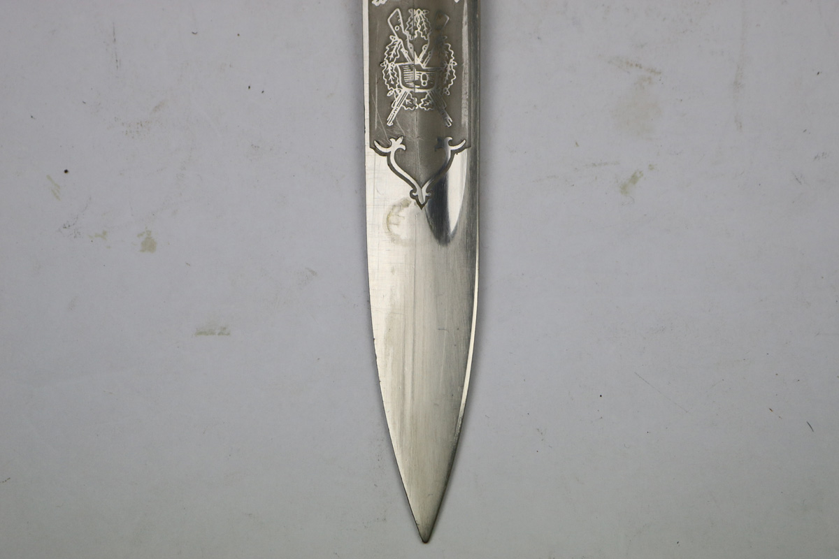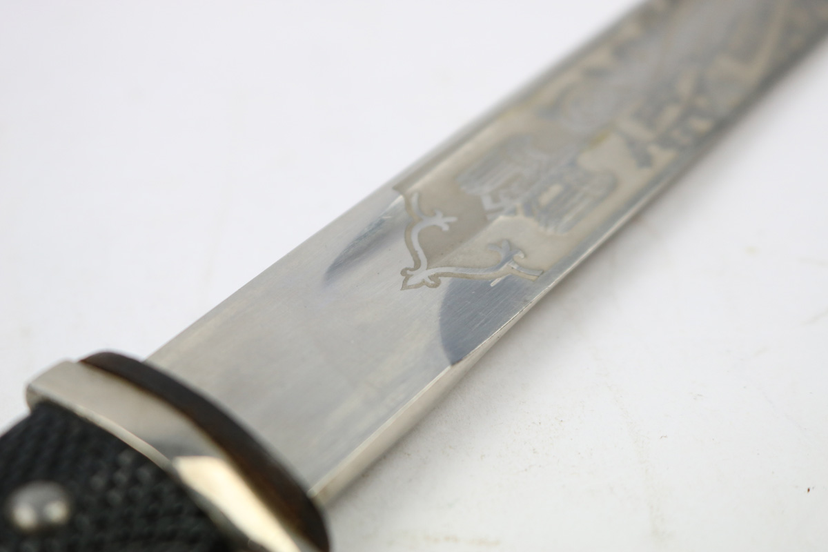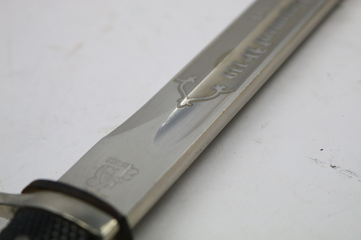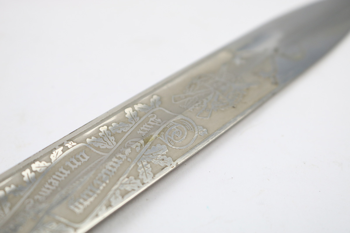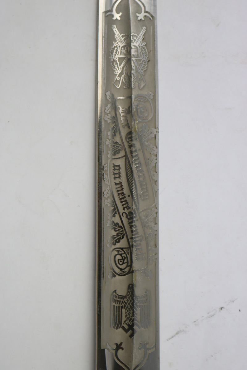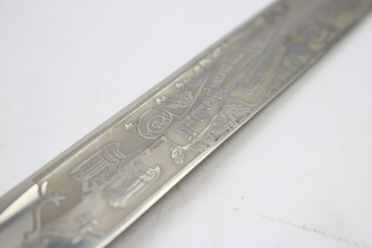 7/6/18 – This is an original etched/engraved German rifle bayonet. The blade is 7.5 inches long and in excellent, near mint condition. The blade is engraved with an inscription on each side. The inscription roughly translates to “In memory of my time in service” on one side. The Gothic German looks like “Zur Erinnerung an meine Dienstzeit…” . The reverse side is engraved for the infantry regiment number 119 out of Stuttgart. Made by Eickhorn. A very cool piece of history. The other engraved blades like this that we’ve owned are only engraved on one side, so this is pretty special. The regiment number 119 must have done something special or could afford to have this extra engraving. Guaranteed original. There’s some light surface wear, but this is normal scabbard and use wear. No signs of “field use” or sharpening. The handle is excellent as in the scabbard. The leather frog has some surface cracking and wrinkling.