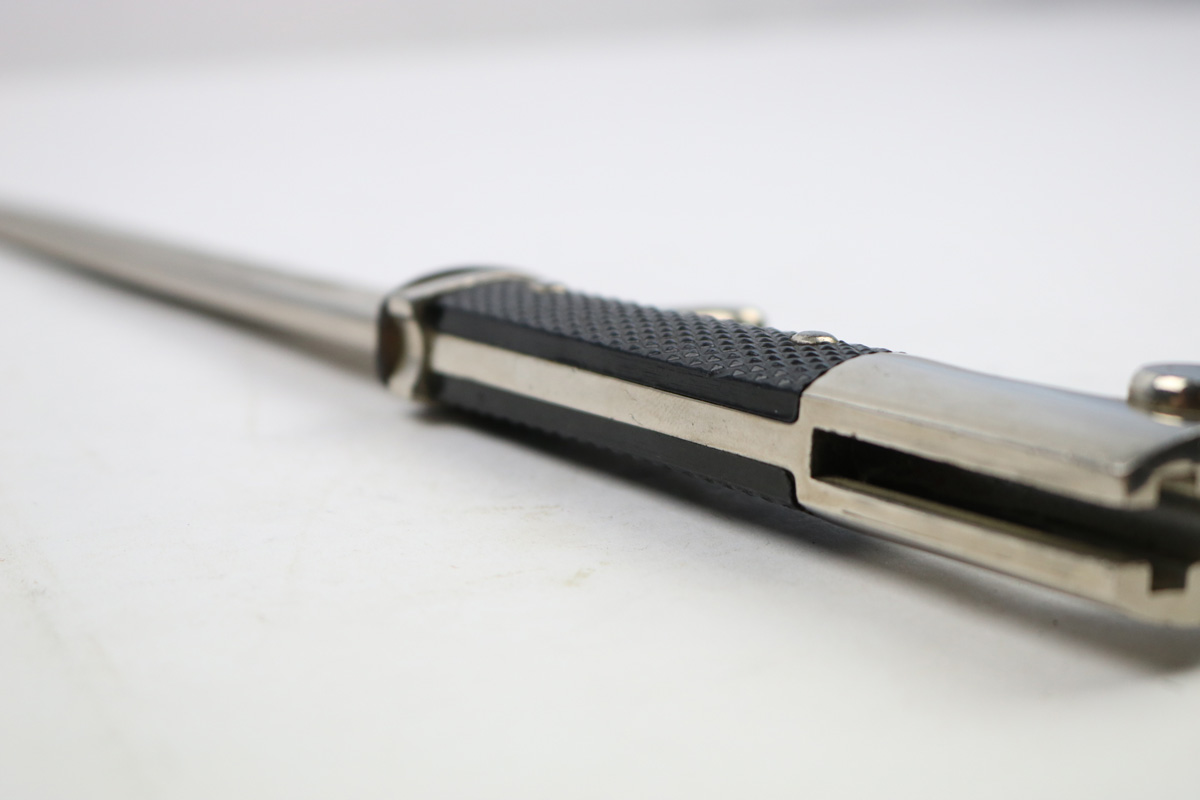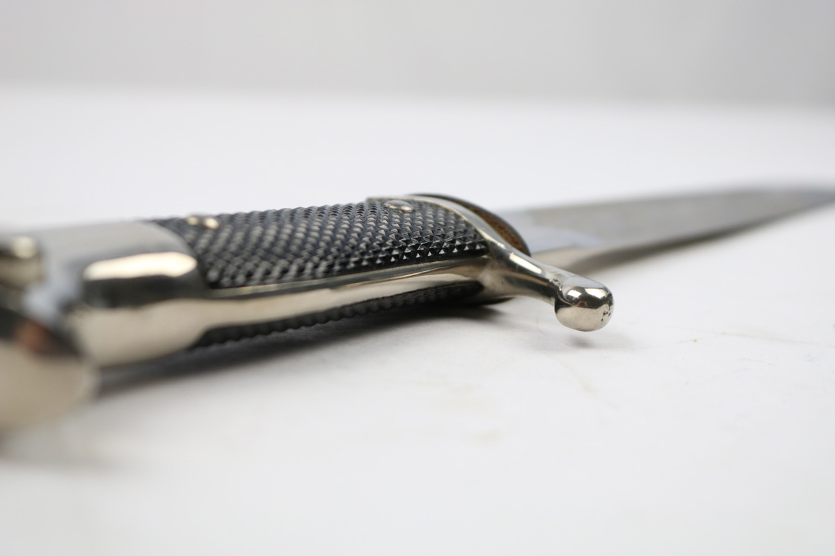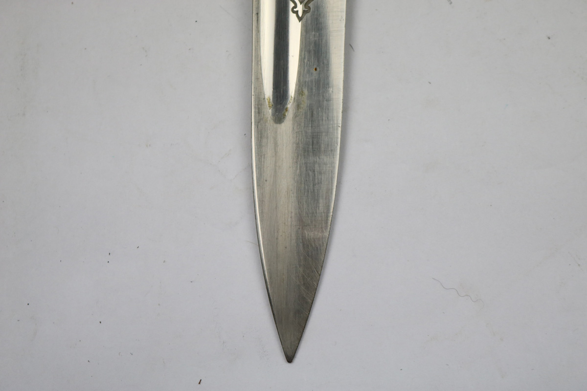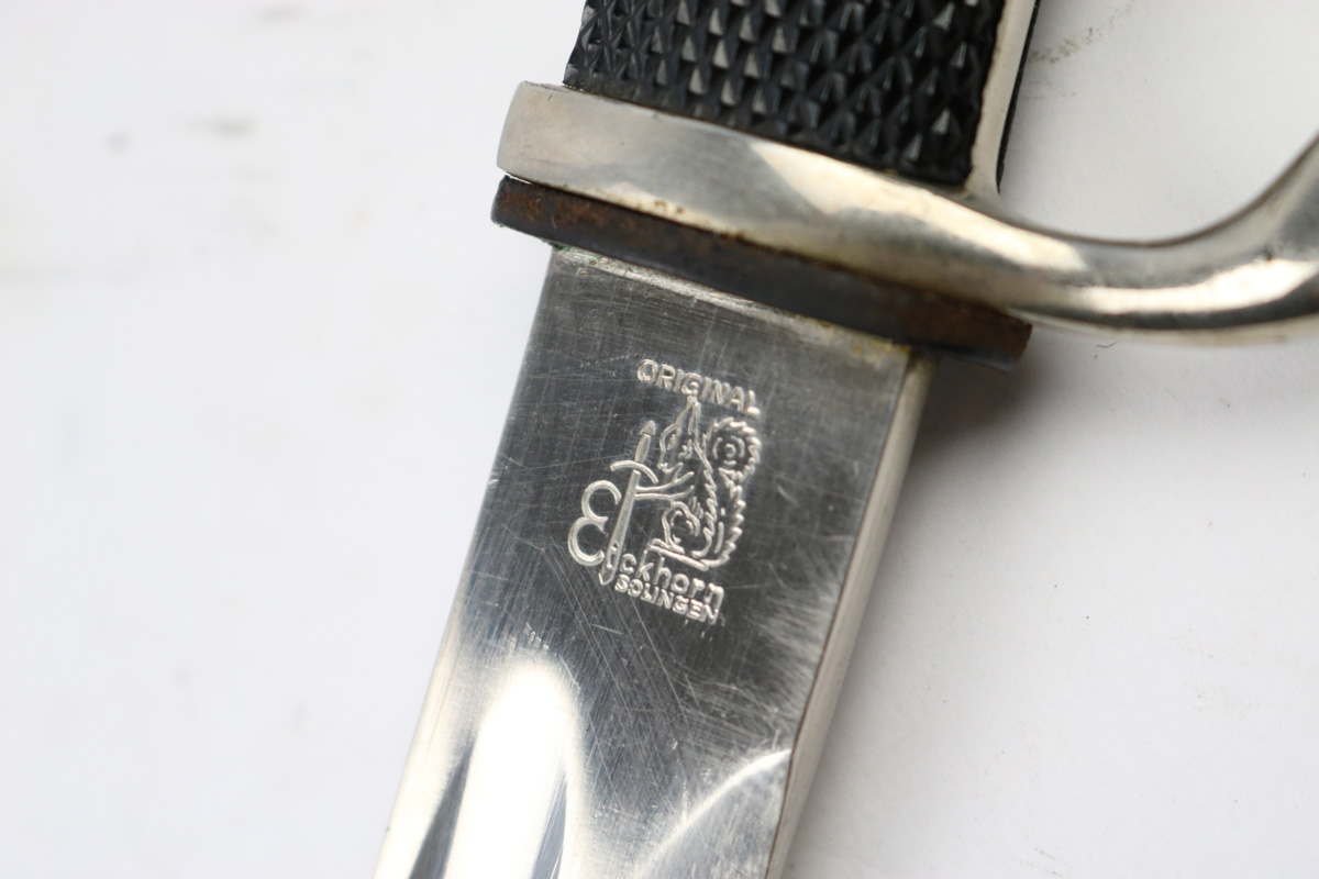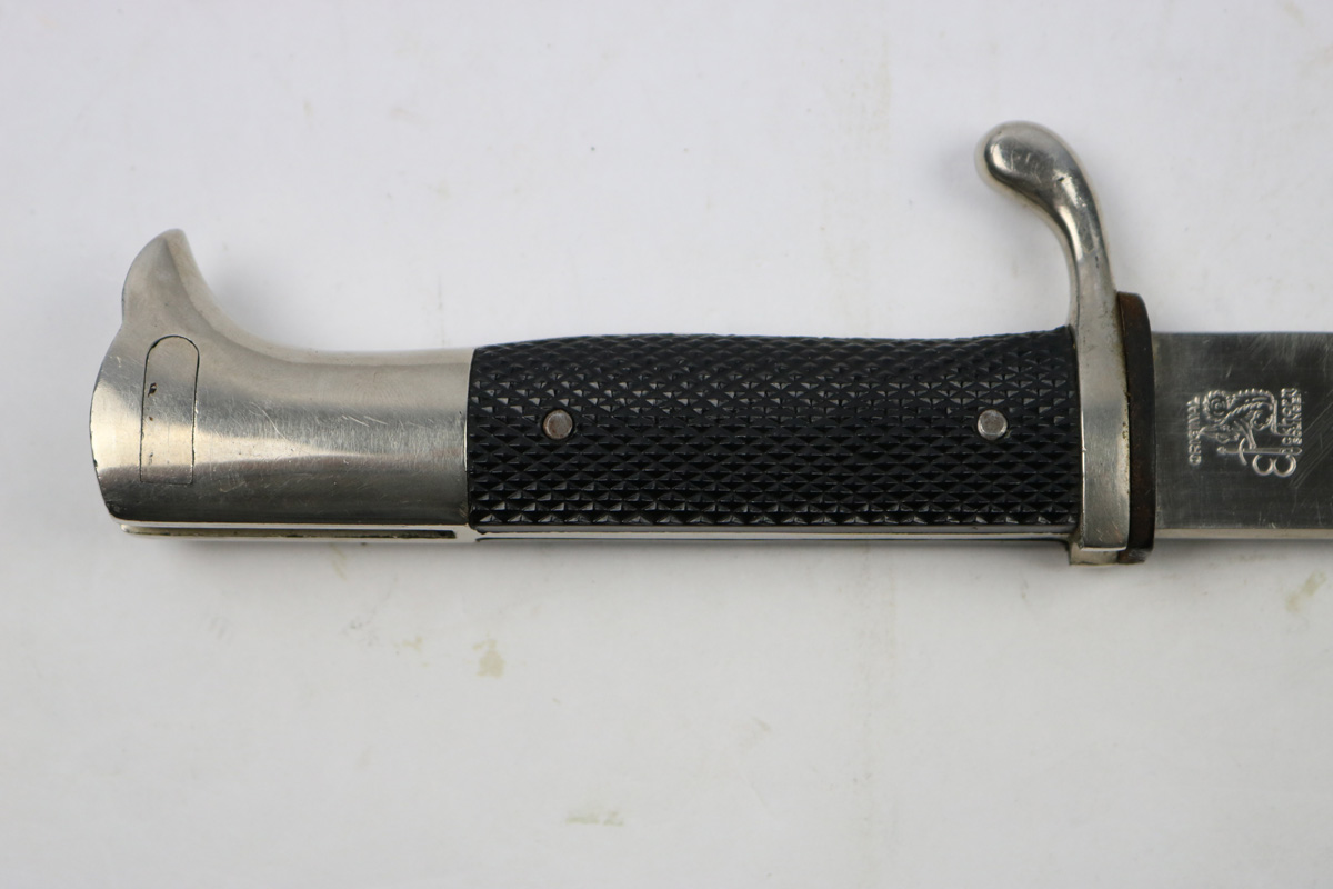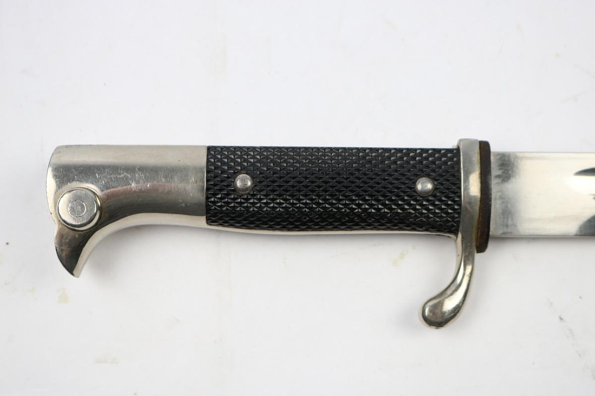 7/6/18 – This is an original etched/engraved German rifle bayonet. The blade is 7.5 inches long and in excellent, near mint condition. The blade is engraved with an inscription on each side. The inscription roughly translates to “In memory of my time in service” on one side. The Gothic German looks like “Zur Erinnerung an meine Dienstzeit…” . The reverse side is engraved for the infantry regiment number 119 out of Stuttgart. Made by Eickhorn. A very cool piece of history. The other engraved blades like this that we’ve owned are only engraved on one side, so this is pretty special. The regiment number 119 must have done something special or could afford to have this extra engraving. Guaranteed original. There’s some light surface wear, but this is normal scabbard and use wear. No signs of “field use” or sharpening. The handle is excellent as in the scabbard. The leather frog has some surface cracking and wrinkling.