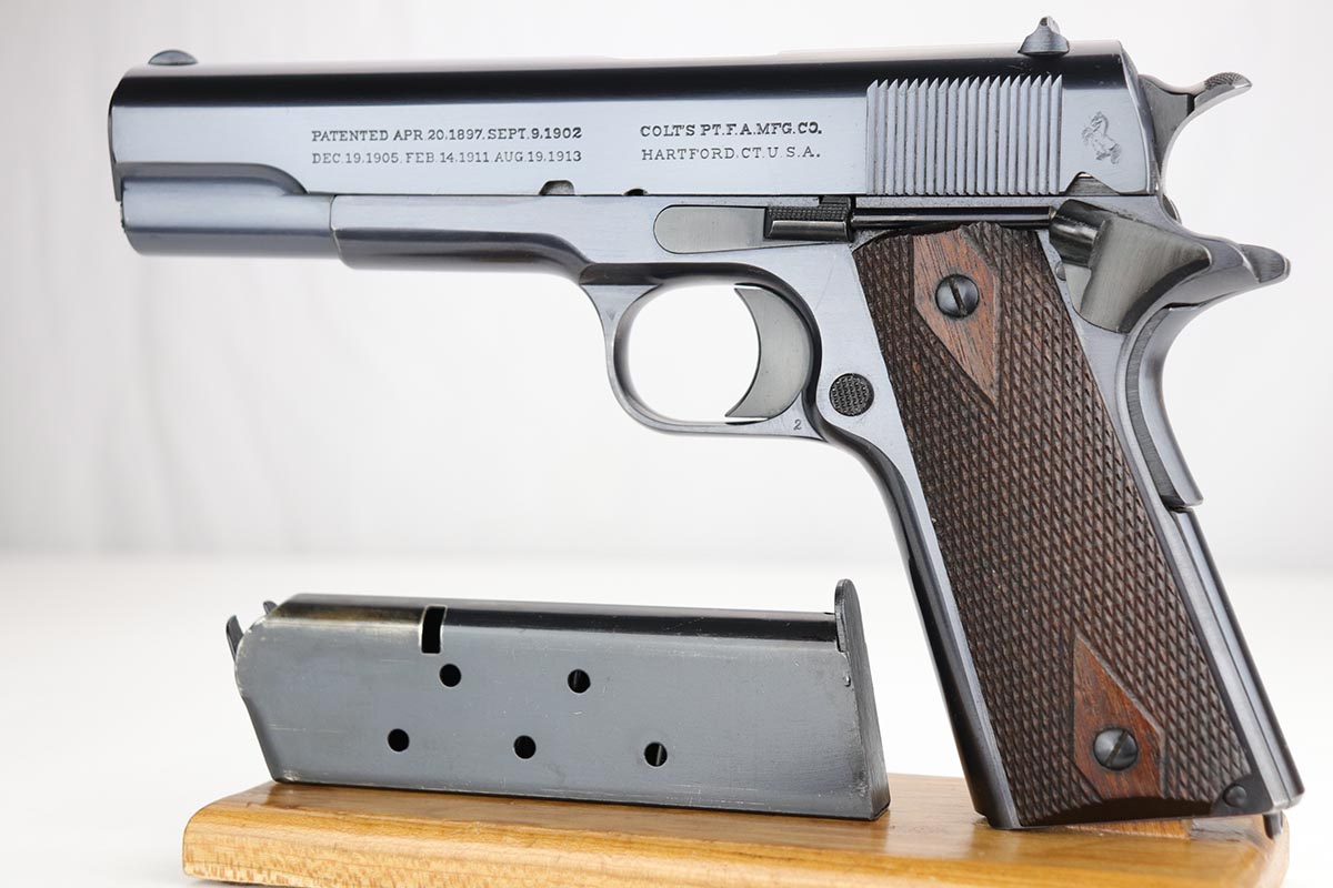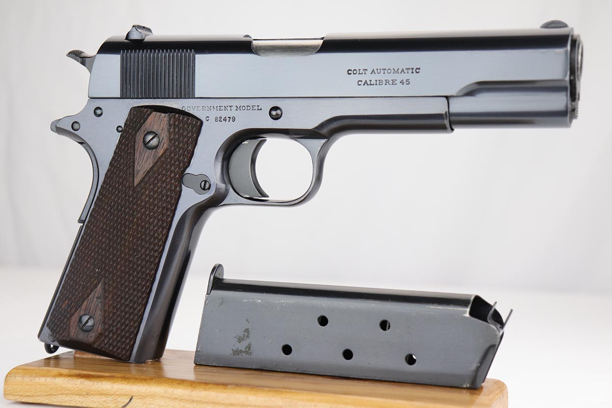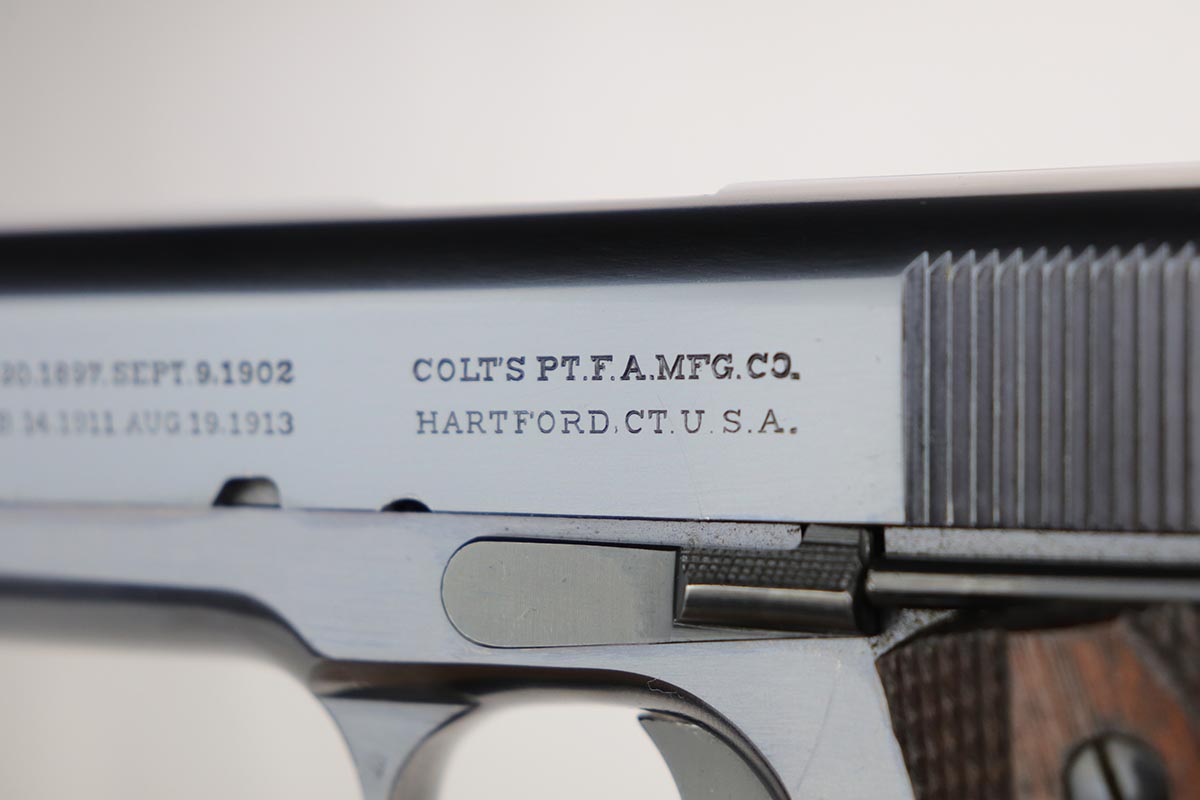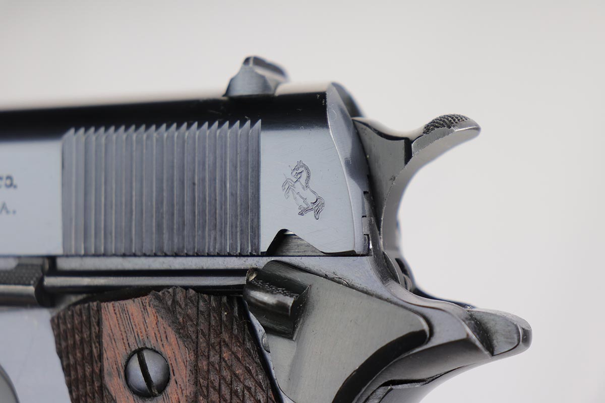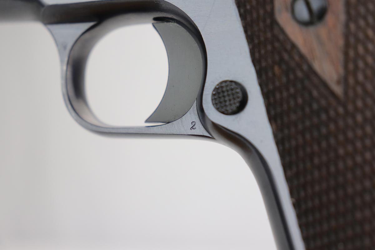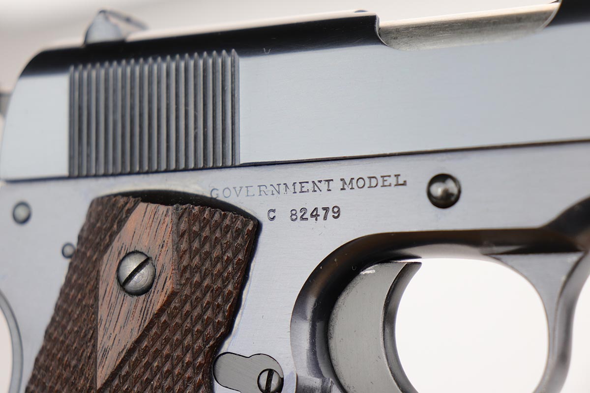 2/5/24 – This is a commercial Colt Government Model 1911 from the Great War era, and perhaps the finest we’ve offered. Made in late 1916 or early 1917, the pistol has 98% of its original, lustrous Colt bluing remaining. There’s a small spot of finish loss on the mainspring housing, and a light “takedown” scratch on the left side of the frame. The gun is otherwise immaculate with a mint bore. The grips are as nice as the rest of the gun. Unmarked, blued magazine.