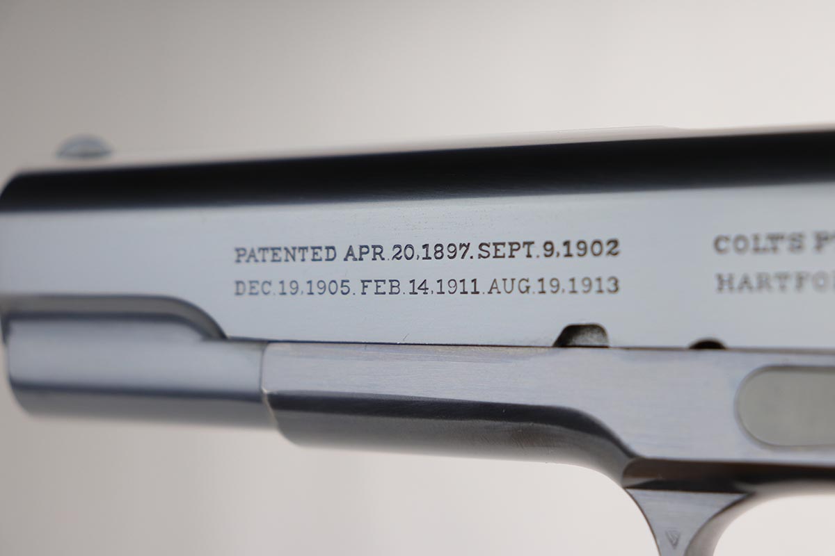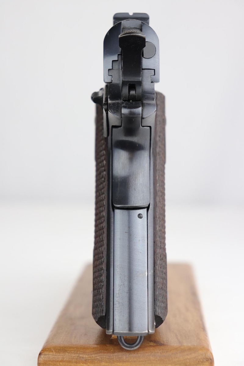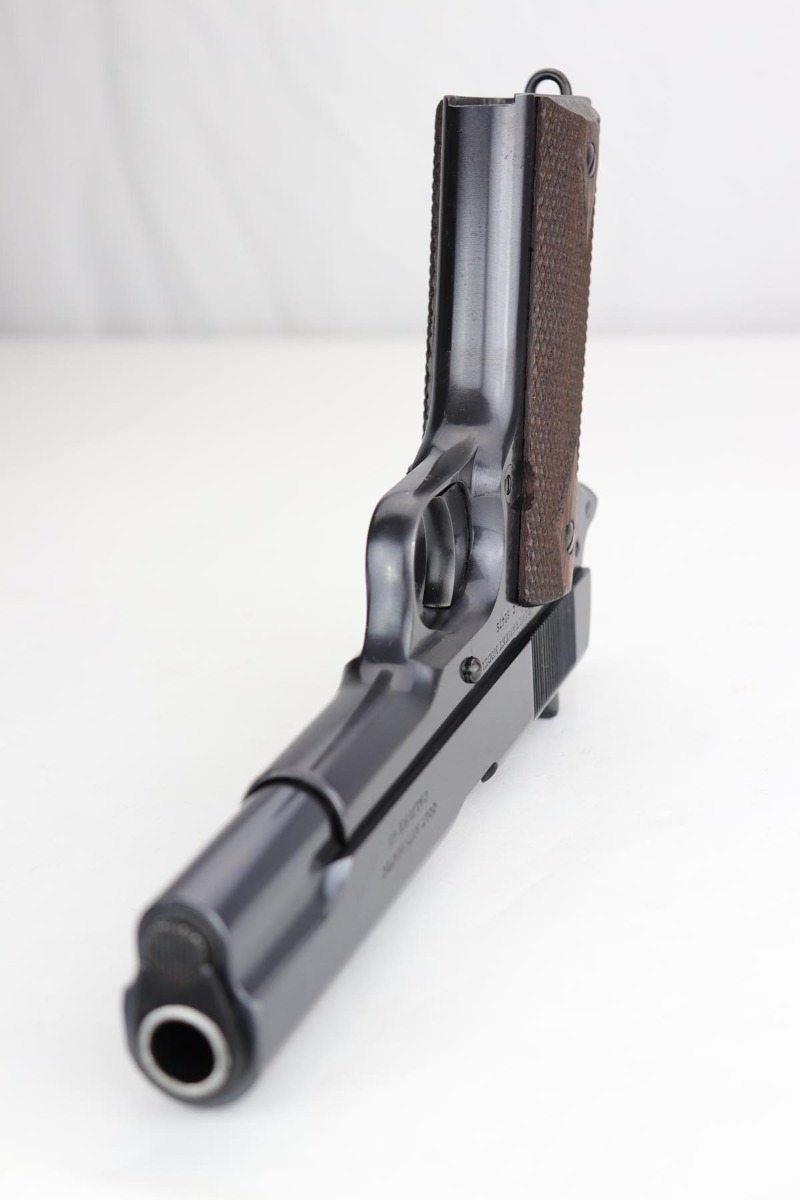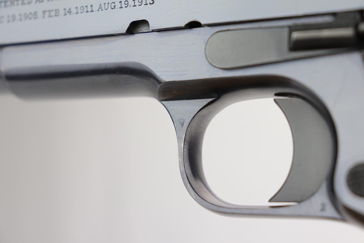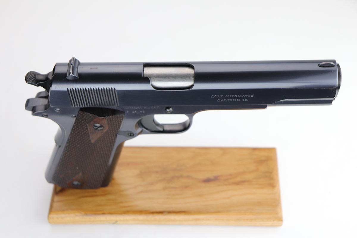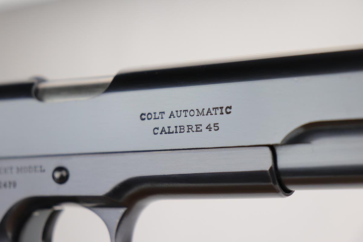 2/5/24 – This is a commercial Colt Government Model 1911 from the Great War era, and perhaps the finest we’ve offered. Made in late 1916 or early 1917, the pistol has 98% of its original, lustrous Colt bluing remaining. There’s a small spot of finish loss on the mainspring housing, and a light “takedown” scratch on the left side of the frame. The gun is otherwise immaculate with a mint bore. The grips are as nice as the rest of the gun. Unmarked, blued magazine.