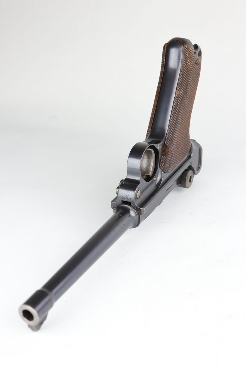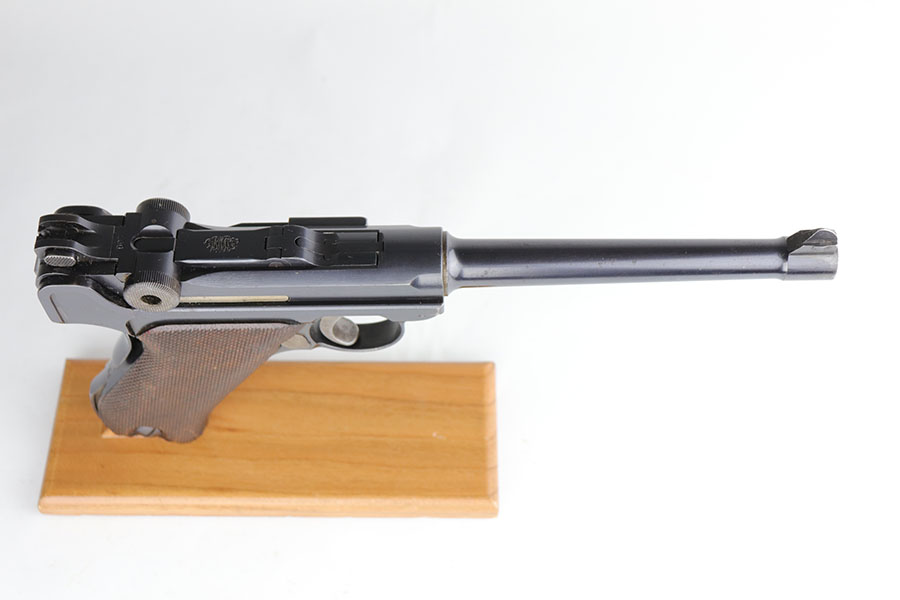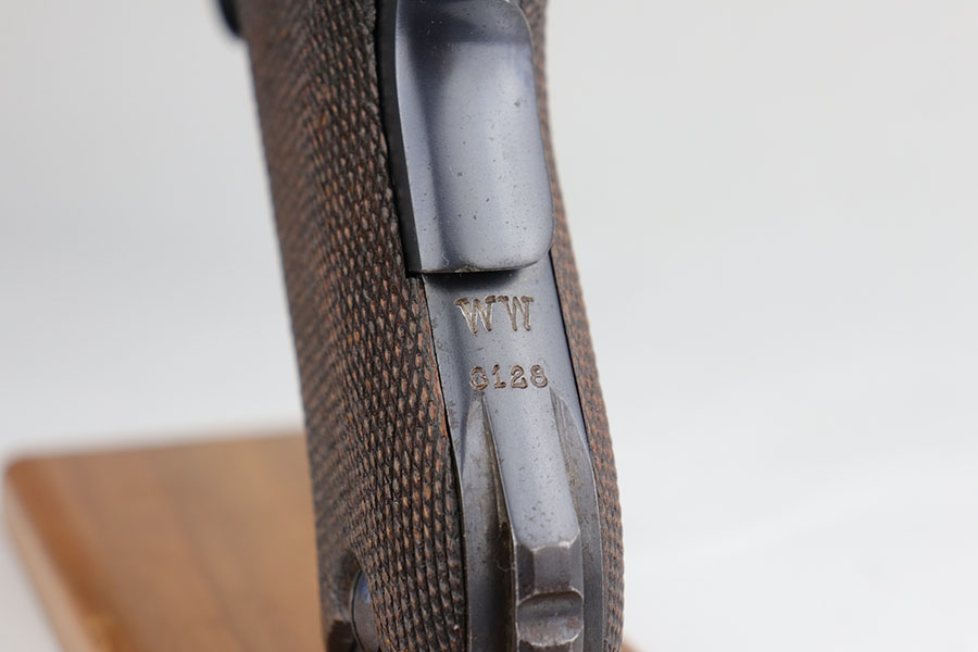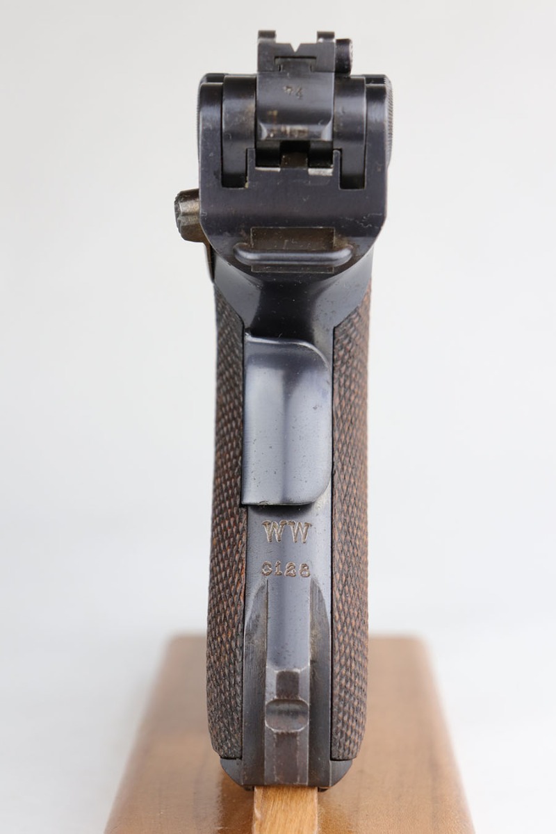 4/24/20 – This is an incredible DWM M1906 Navy Luger in all original conditon. It’s in the proper serial range and one of only about 21,000 of these produced. This model has a six inch barrel, grip safety and blank chamber. Rear strap is marked ‘WW 3128’ to denote that it was sent to the dockyard at Wilhelmshaven. Original blue rates at about 98% with minor high point wear and a little bit of freckling on the rear edge of the frame. Small parts have about 50% original straw. Original Navy magazine that is numbered but mismatched. Crown/M Navy proofs in several spots. Excellent original grips with only minor handling wear. Bore is shiny with strong rifling.