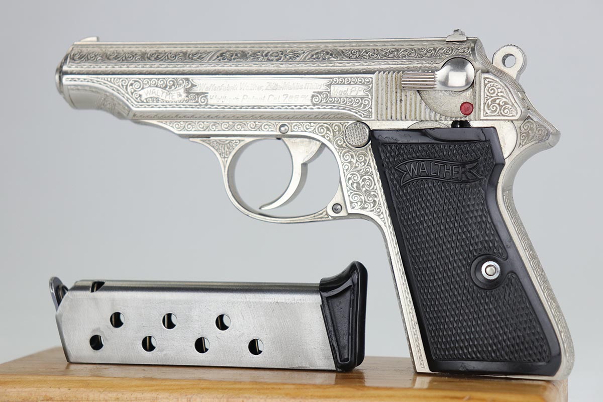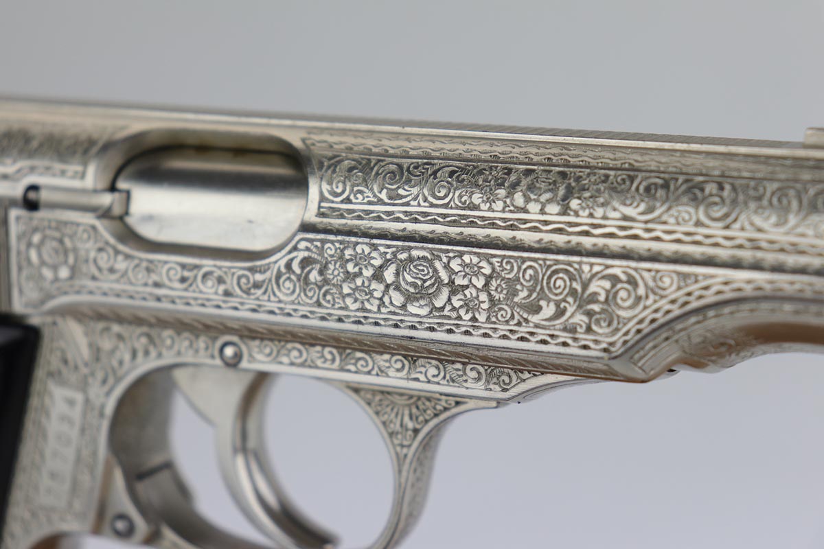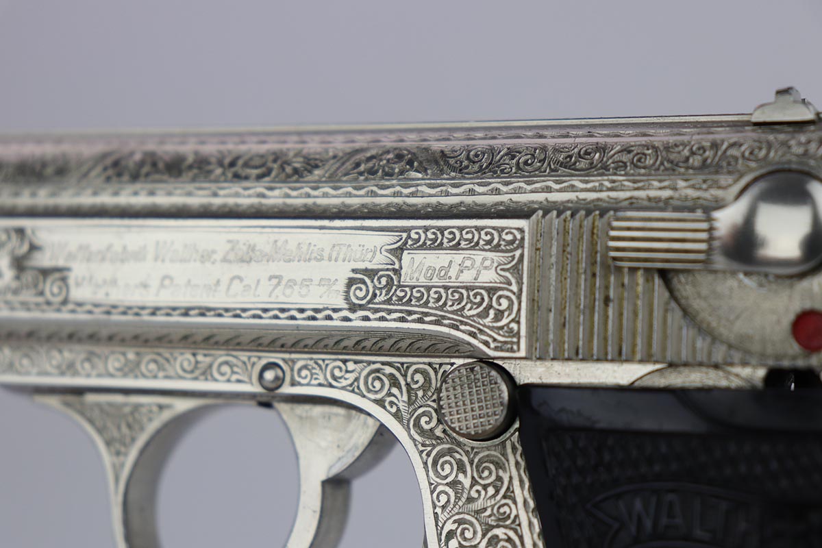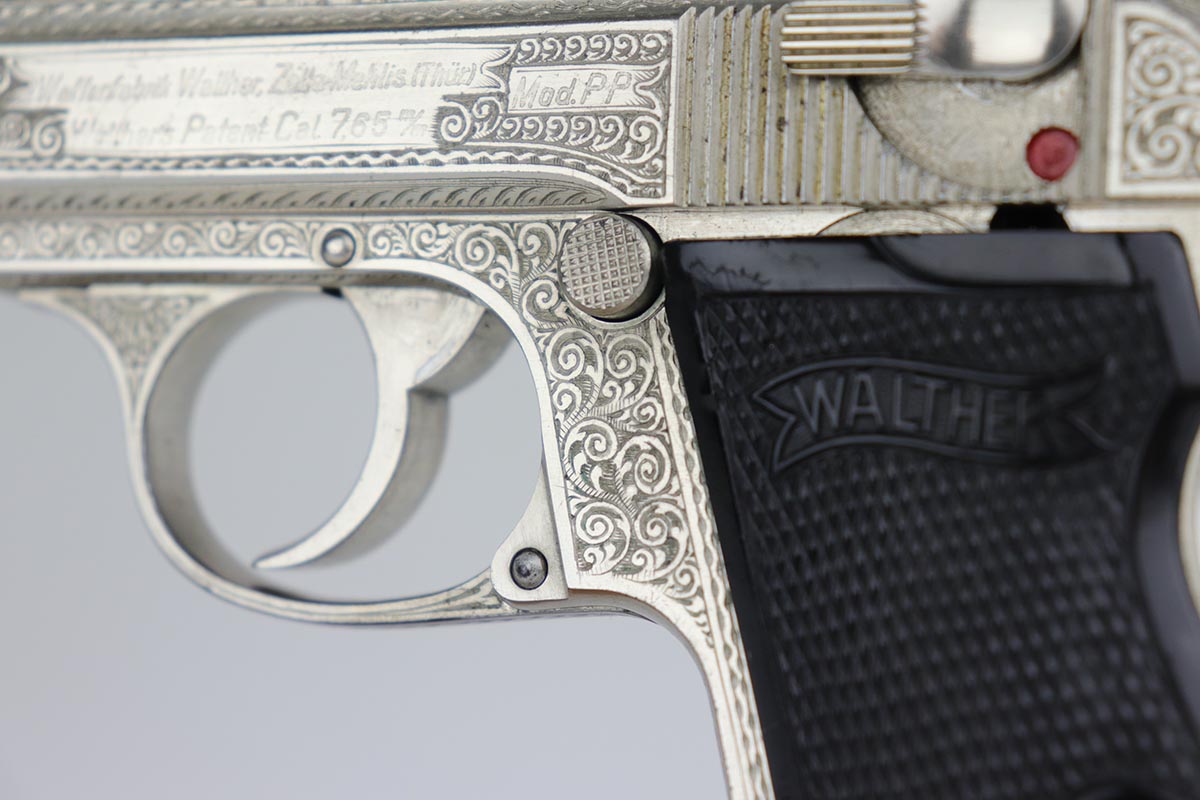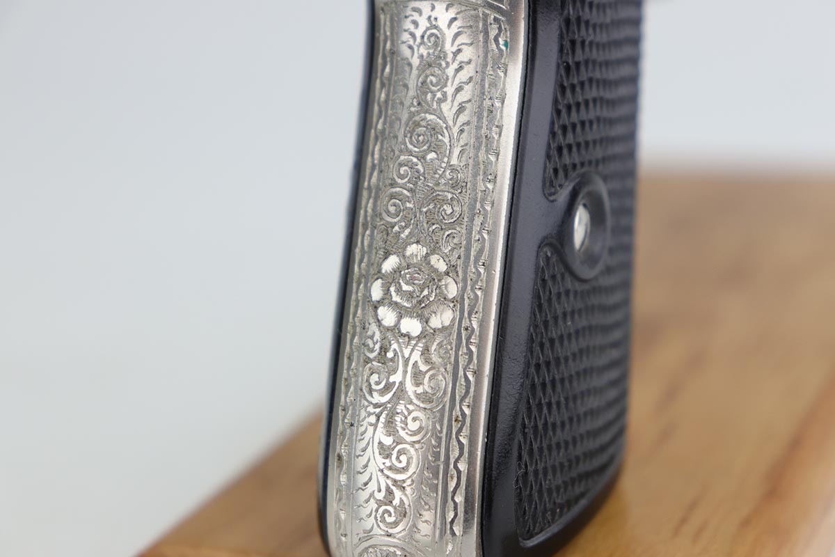 3/5/20 – This is a very rare and incredible find: a factory engraved Walther PP that was made during the first year of production. It is a floral engraved example with factory nickel finish, which shows minimal wear and no flaking. The pistol has early features such as the “X-backed” grips, 90 degree safety, extended barrel and heavy hammer. It also has an unfinished magazine with early open follower. There’s no Crown/N proof in the ejection port, which also occurred on early guns, but there is one on the barrel. The floral engraving work is beautiful, especially along the rounded edges of the slide. A nearly one of a kind find!