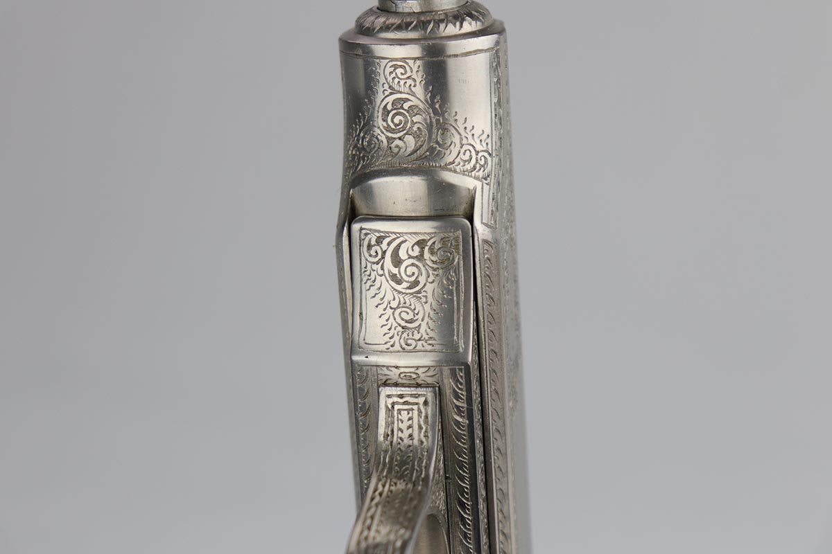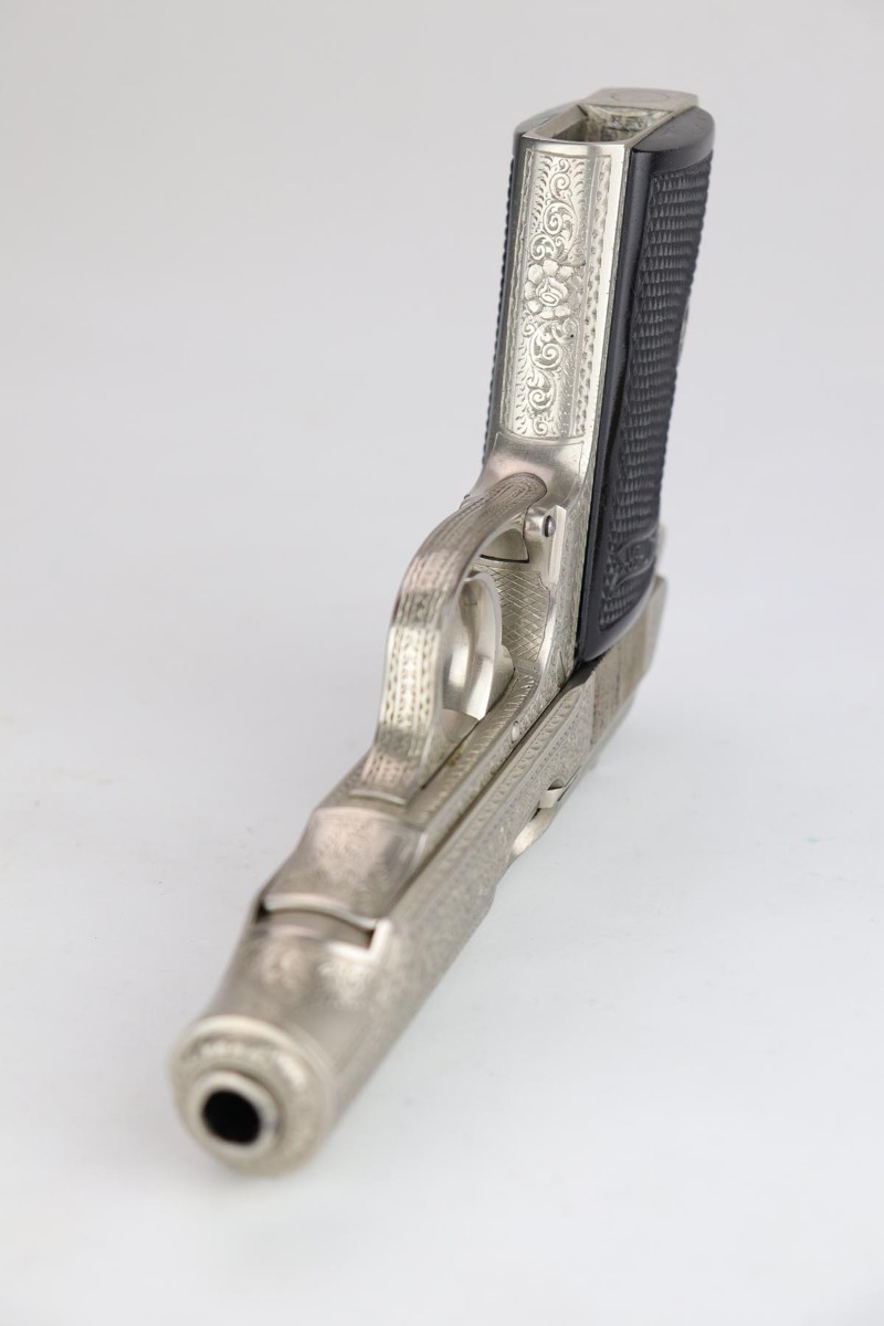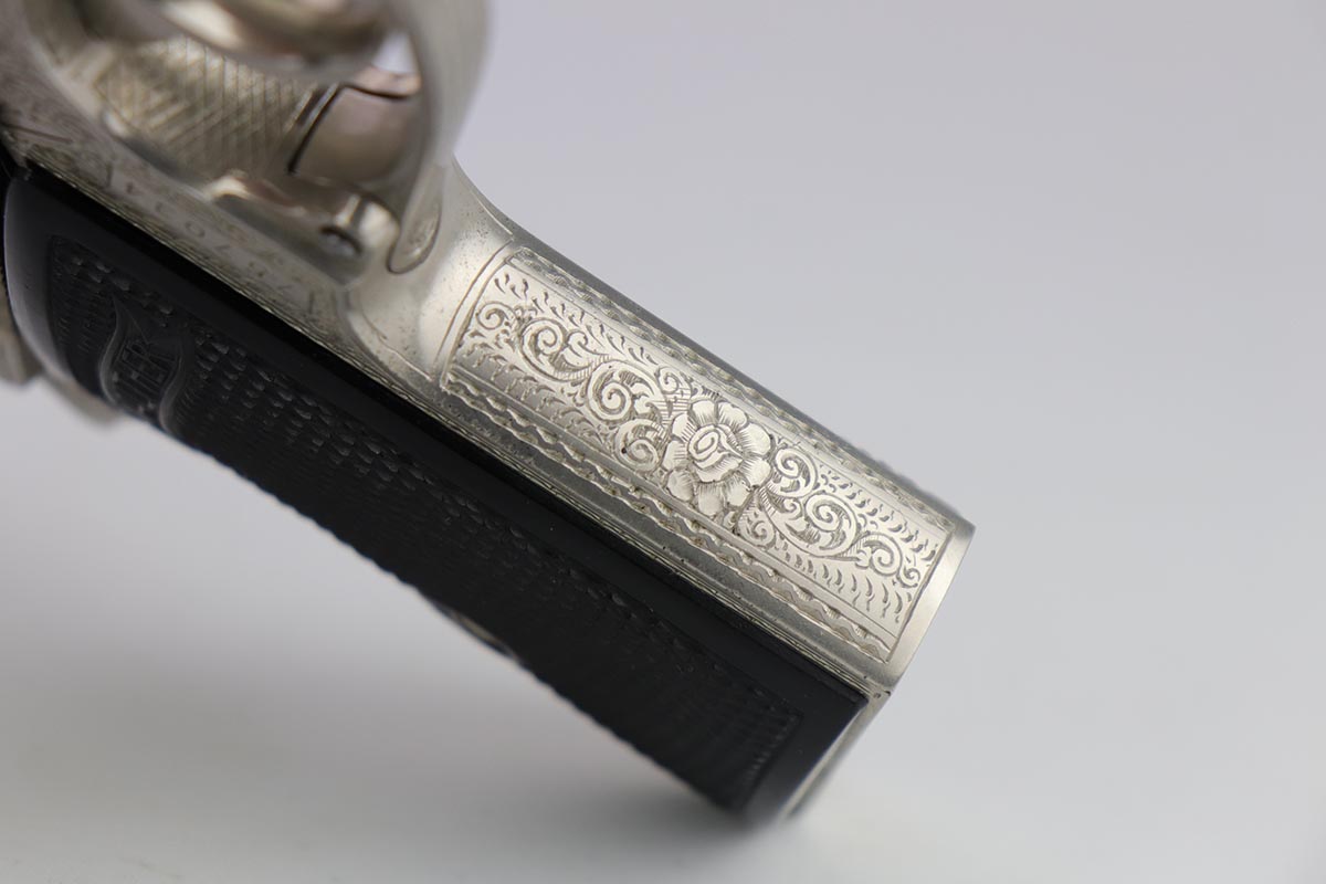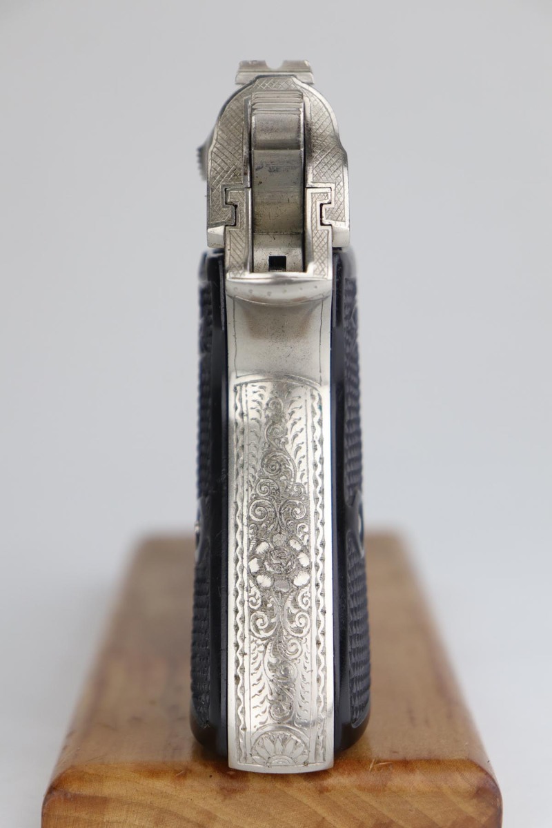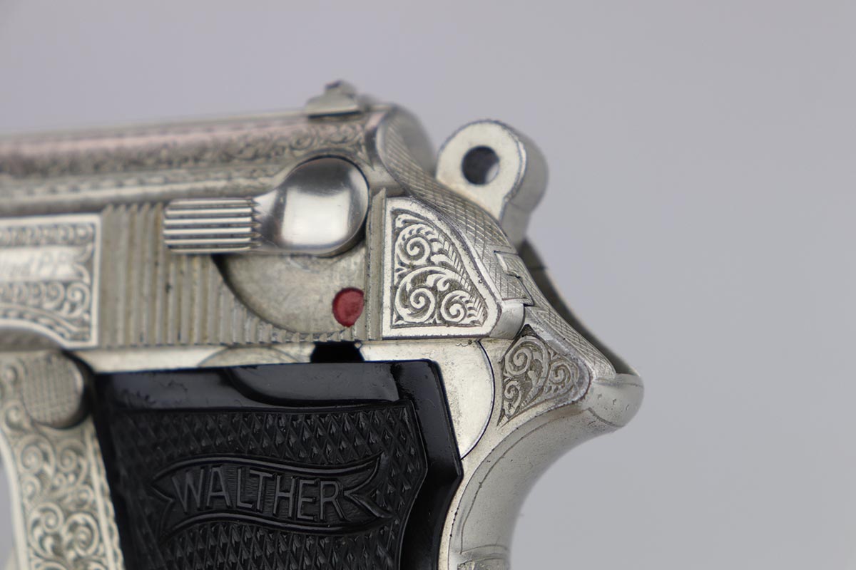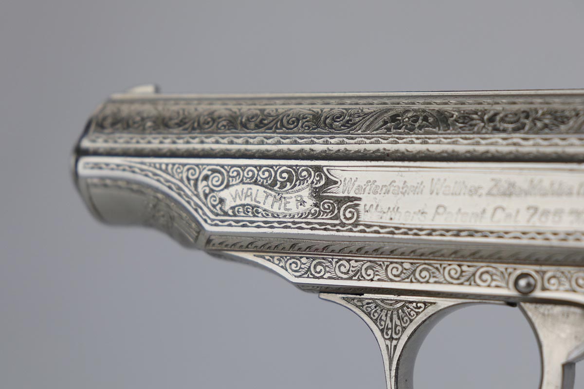 3/5/20 – This is a very rare and incredible find: a factory engraved Walther PP that was made during the first year of production. It is a floral engraved example with factory nickel finish, which shows minimal wear and no flaking. The pistol has early features such as the “X-backed” grips, 90 degree safety, extended barrel and heavy hammer. It also has an unfinished magazine with early open follower. There’s no Crown/N proof in the ejection port, which also occurred on early guns, but there is one on the barrel. The floral engraving work is beautiful, especially along the rounded edges of the slide. A nearly one of a kind find!