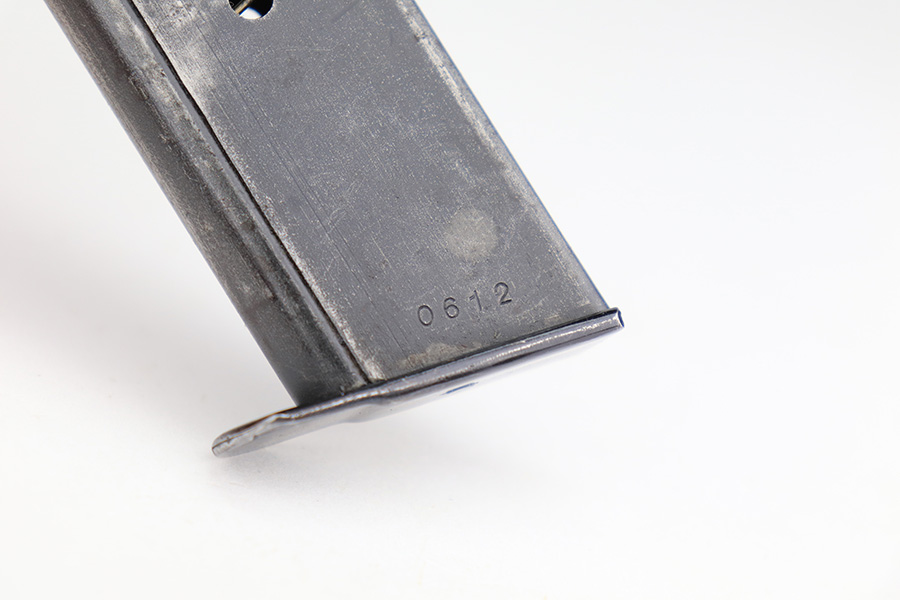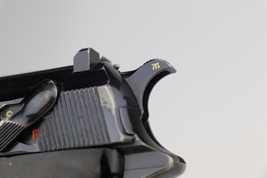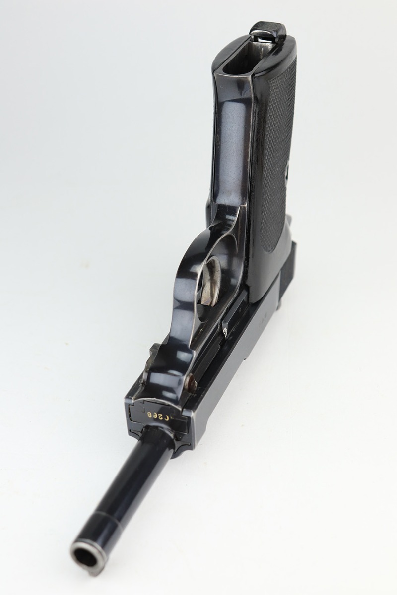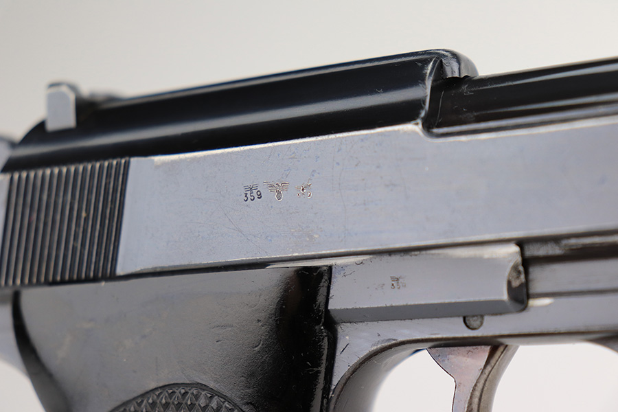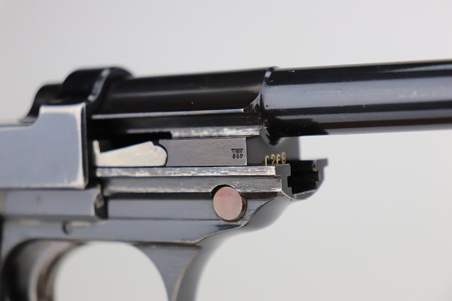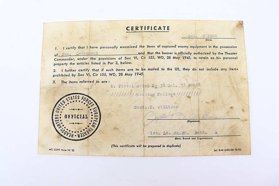 1/8/23 – This is an extremely rare find – a first variation Zero Series Walther P.38 with bringback document. It’s a very early example, the 268th made! One of only 1,000 produced, it features the hidden extractor and rectangular firing pin. Interestingly, the consecutive serial (0267) is listed separately on our site now as complete coincidence. This one is in terrific condition for a first variation example, with 92-94% of the original, high-polish blue remaining. There’s wear around the muzzle and minor thinning on the front strap, with a spot of wear on the rear left side slide and a little more on the front edges of the slide. Strong, shiny bore with just a little frost in the grooves. All matching numbers, including the original grips. The magazine is mismatched to the pistol but is a correct 1st variation example with a different serial on the body. Good mechanically, including the de-cocker. The capture document states the pistol was brought back in 1945 by Pvt. Lewankski. It has a couple of slight separations in the creases from being folded over the years but it is generally intact.