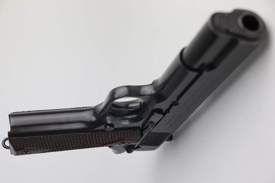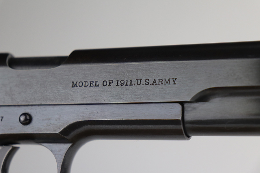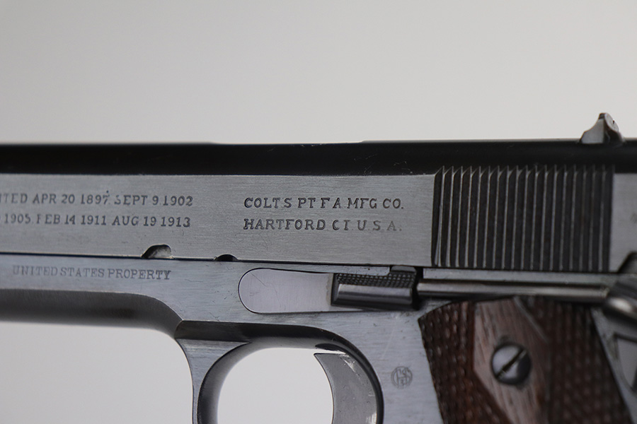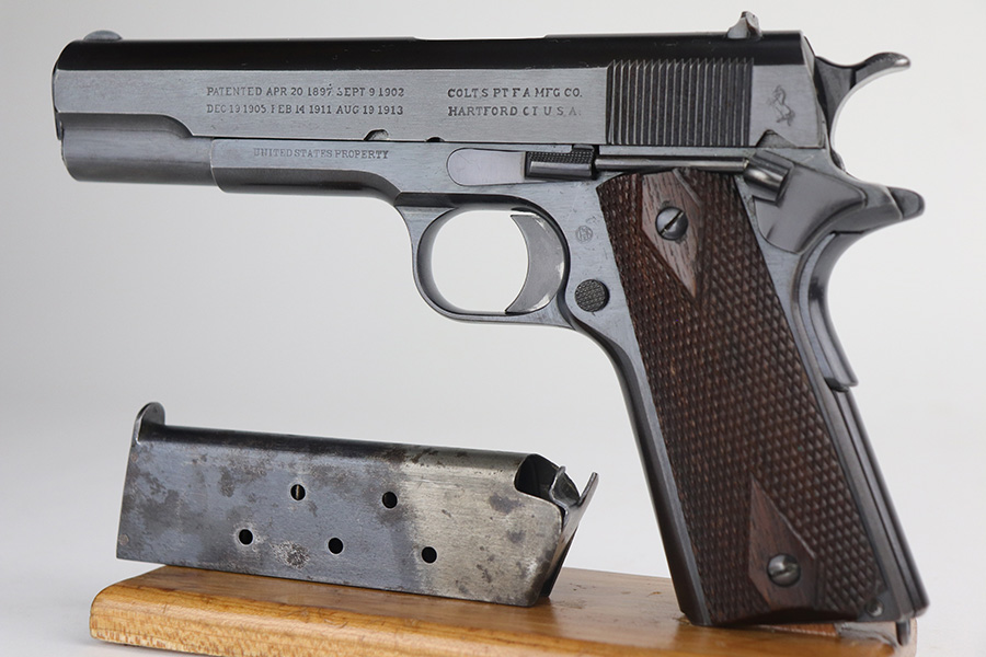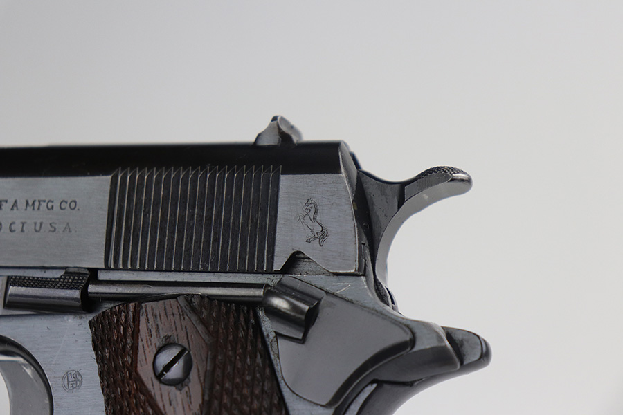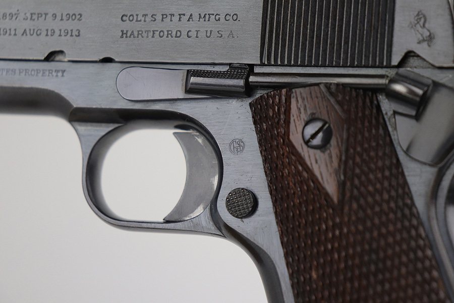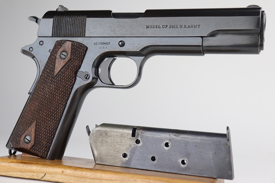 11/18/21 – This is an ultra rare and original Colt 1911 pistol with ‘N.R.A.’ marked frame. Beginning in1915, a number of Model 1911 pistols were made available to N.R.A. members and affiliates. They are easily identified by the “N.R.A.” marking on the right side of the receiver directly under the serial number. All of the Colt pistols were from 1915, 1916 and 1917 production. The pistols fall within the serial number range of 122279 to 164124 and it’s estimated that only about 50 of the Colt Model 1911 pistols were marked N.R.A. and released. This pistol was manufactured in 1917 and falls within the serial number range. It is GHS inspector marked for Lt. Col. Gilbert H. Stewart. Small ‘H’ stamped on rear of slide, and disconnected ‘P H’ marking on barrel is correct for this serial number. It’s a gorgeous pistol with only minor high edge wear and a little bluing loss on the mainspring housing. It has a minty bore. Beautiful wood grips with sharp checkering. Two-tone magazine that does have some pitting on it.